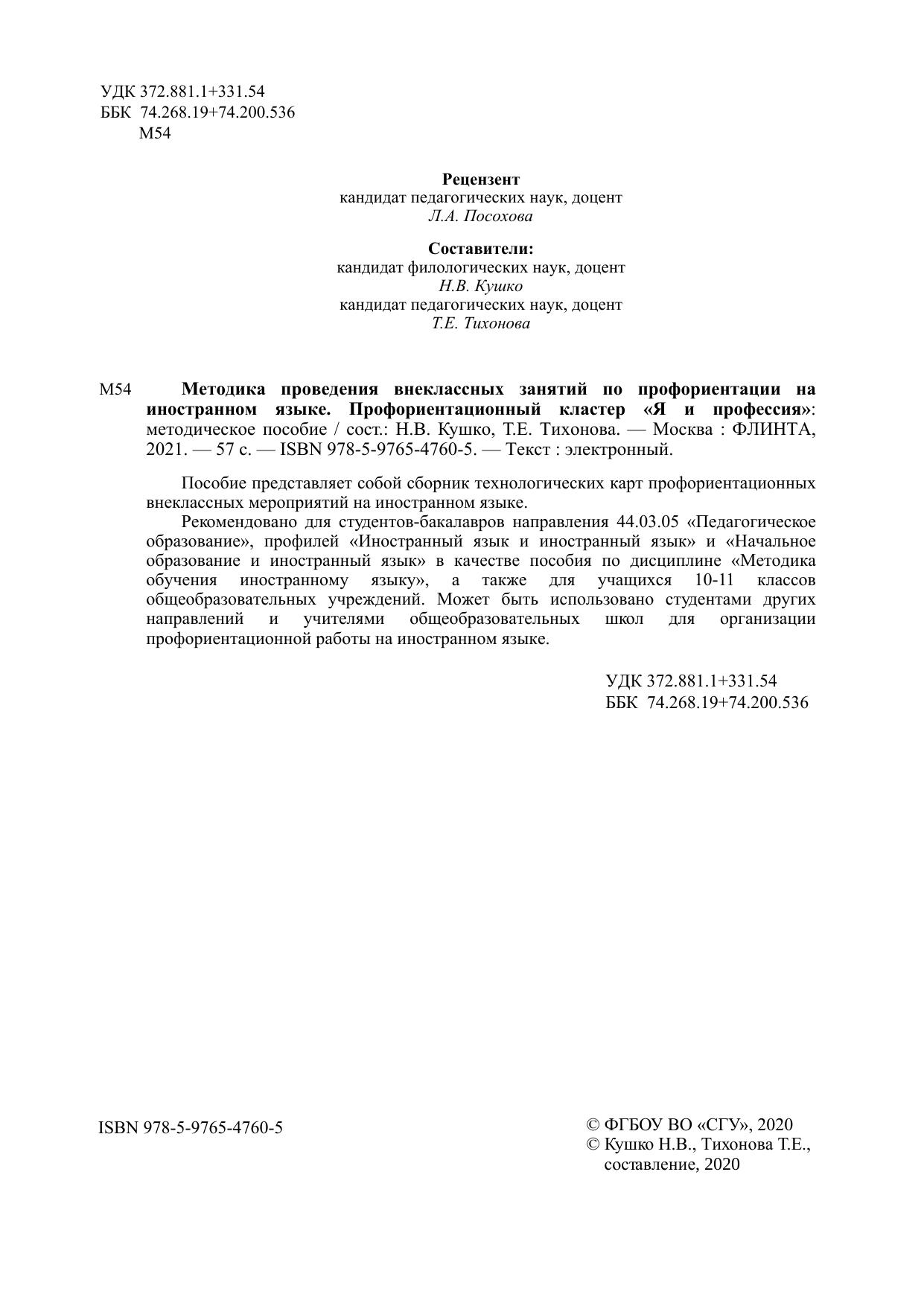 Рекомендовано для студентов-бакалавров направления 44.03.05 «Педагогическое образование», профилей «Иностранный язык и иностранный язык» и «Начальное образование и иностранный язык» в качестве пособия по дисциплине «Методика обучения иностранному языку», а также для учащихся 10-11 классов общеобразовательных учреждений. Может быть использовано студентами других направлений и учителями общеобразовательных школ для организации профориентационной работы на иностранном языке.