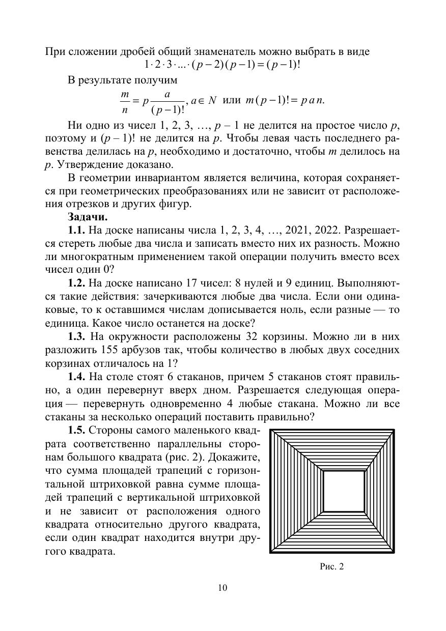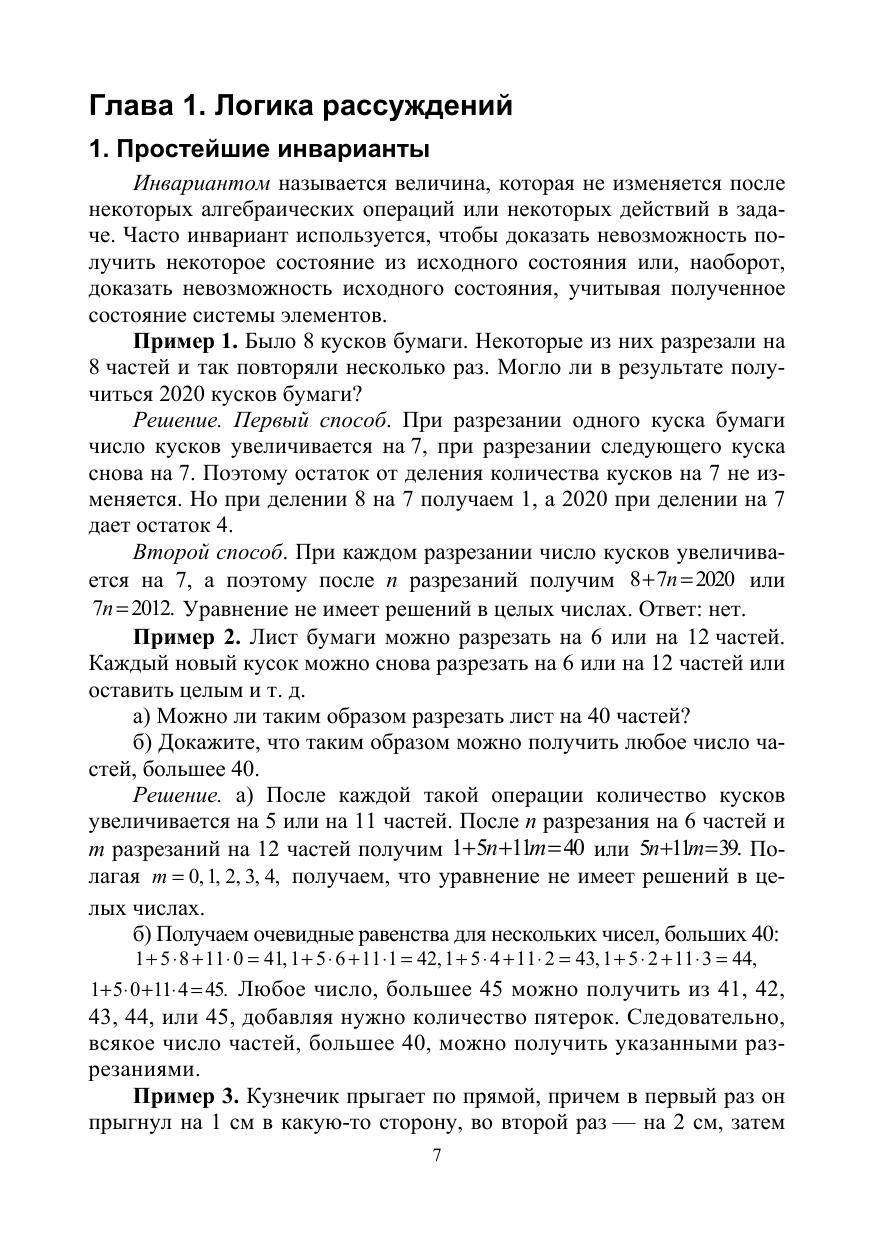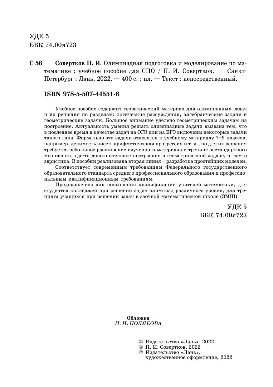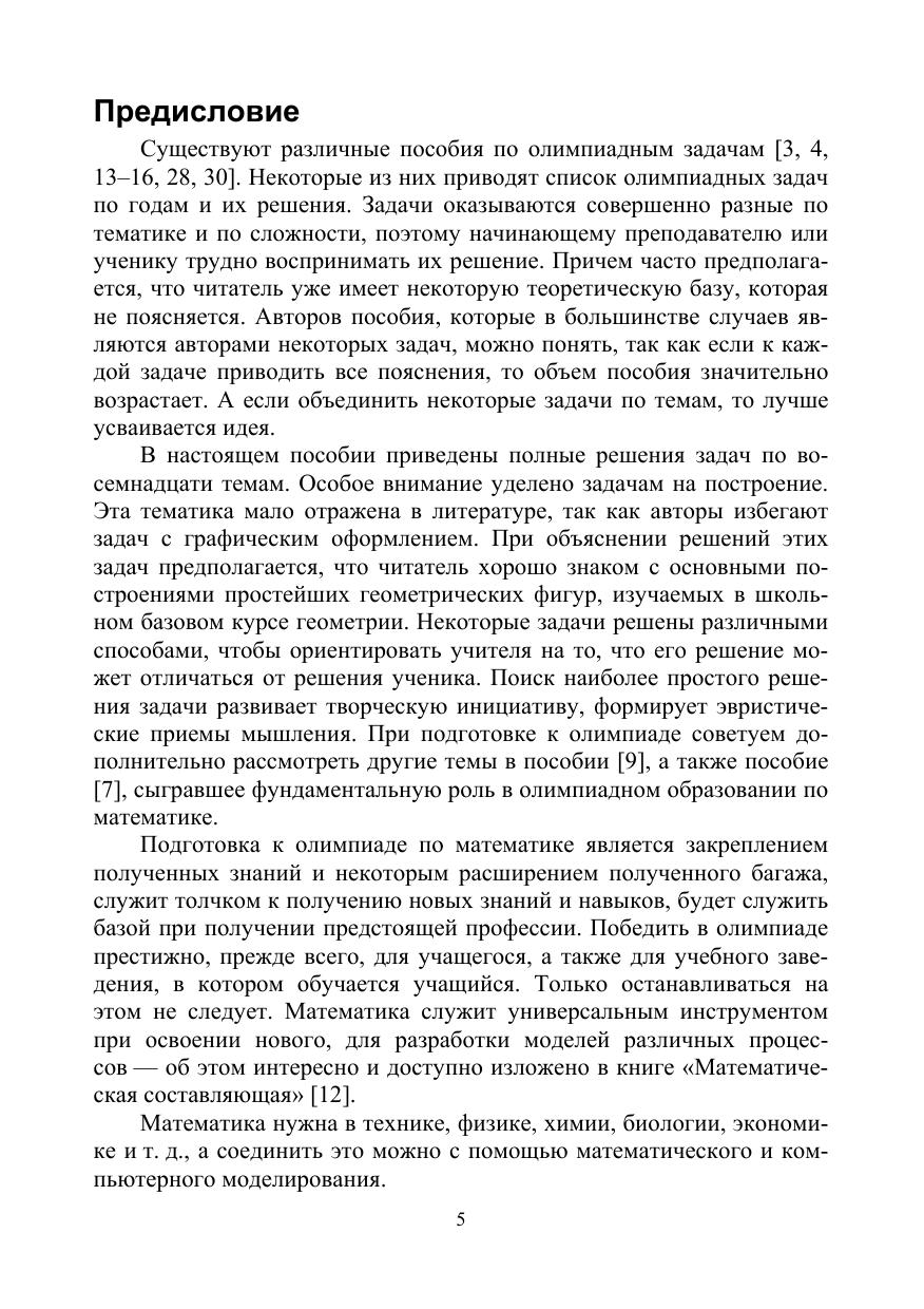 Учебное пособие содержит теоретический материал для олимпиадных задач и их решения по разделам: логические рассуждения, алгебраические задачи и геометрические задачи. Большое внимание уделено геометрическим задачам на построение. Актуальность умения решать олимпиадные задачи вызвана тем, что в последнее время в качестве задач на ОГЭ или на ЕГЭ включены некоторые задачи такого типа. Формально эти задачи относятся к учебному материалу 7–9 классов, например, делимость чисел, арифметическая прогрессия и т. д., но для их решения требуется небольшое расширение изученного материала и тренинг нестандартного мышления, где-то дополнительное построение в геометрической задаче, а где-то эвристика. В пособии реализована вторая линия – разработка простейших моделей. Соответствует современным требованиям Федерального государственного образовательного стандарта среднего профессионального образования и профессиональным квалификационным требованиям. Предназначено для повышения квалификации учителей математики, для студентов колледжей при решении задач олимпиад различного уровня, для тренинга учащихся при решении задач в заочной математической школе (ЗМШ).
