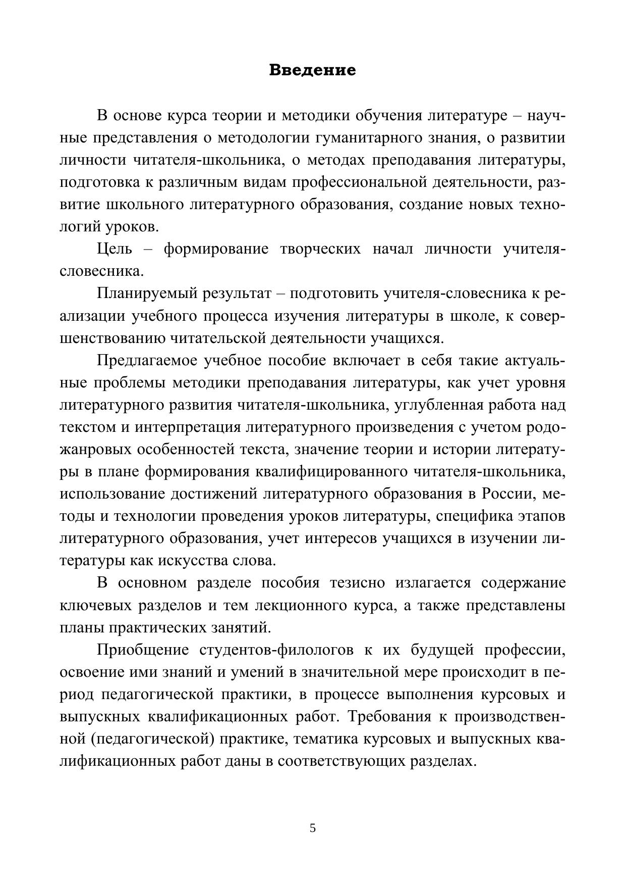 Предлагаемое учебное пособие включает в себя такие актуальные проблемы методики преподавания литературы, как учет уровня литературного развития читателя-школьника, углубленная работа над текстом и интерпретация литературного произведения с учетом родо-жанровых особенностей текста, значение теории и истории литературы в плане формирования квалифицированного читателя-школьника, использование достижений литературного образования в России, методы и технологии проведения уроков литературы, специфика этапов литературного образования, учет интересов учащихся в изучении литературы как искусства слова.