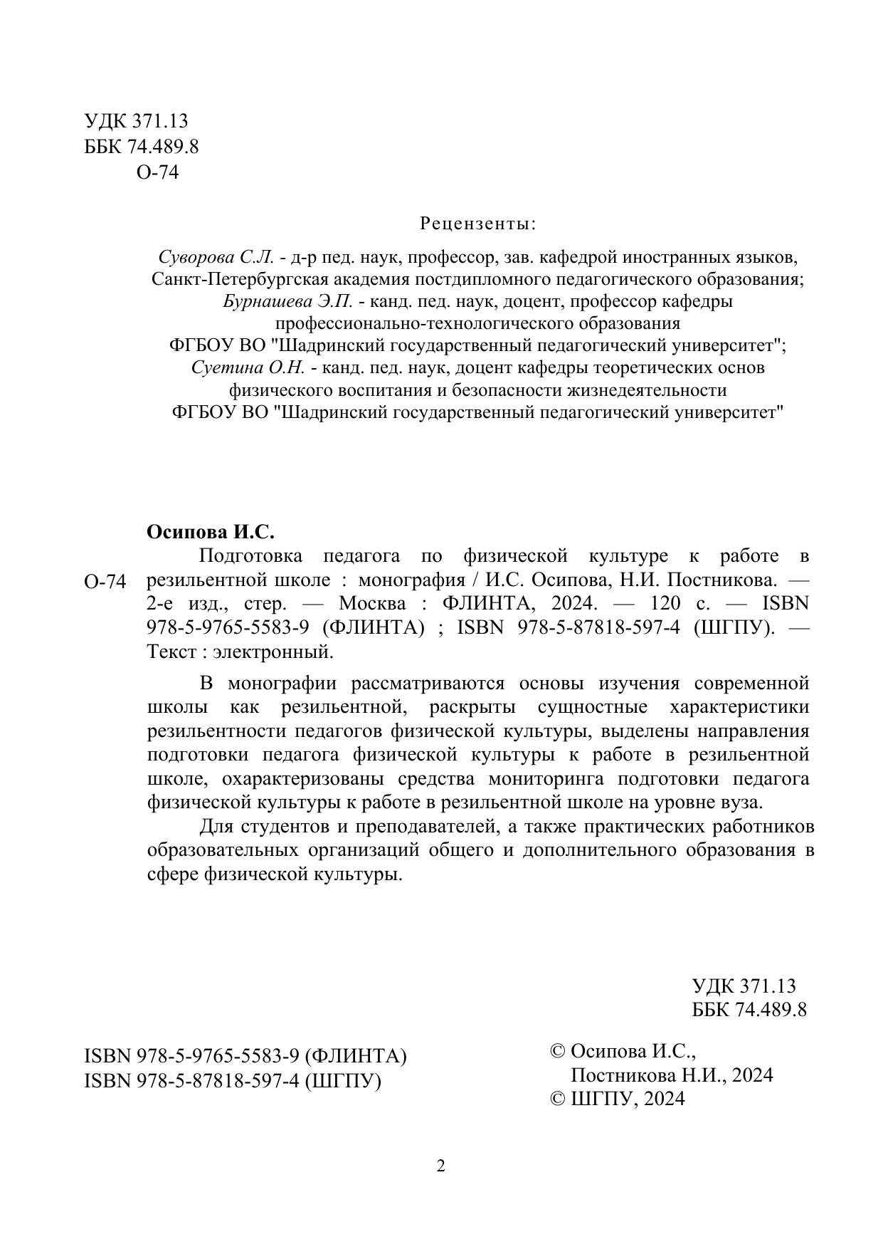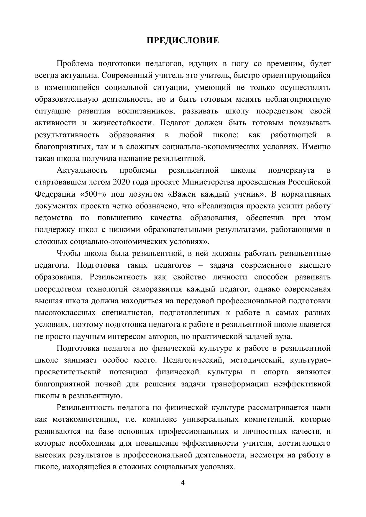 В монографии рассматриваются основы изучения современной школы как резильентной, раскрыты сущностные характеристики резильентности педагогов физической культуры, выделены направления подготовки педагога физической культуры к работе в резильентной школе, охарактеризованы средства мониторинга подготовки педагога физической культуры к работе в резильентной школе на уровне вуза.