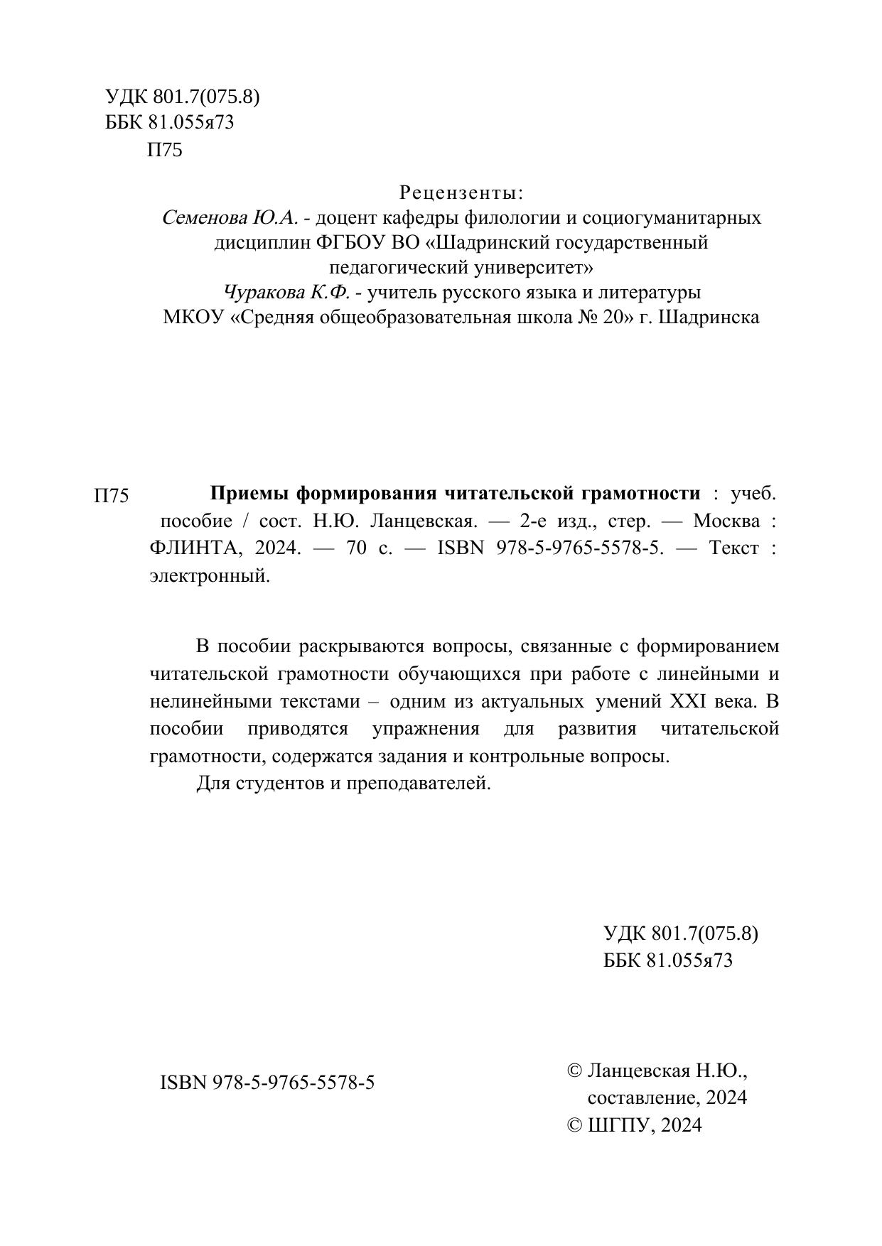 В пособии раскрываются вопросы, связанные с формированием читательской грамотности обучающихся при работе с линейными и нелинейными текстами – одним из актуальных умений ХХI века. В пособии приводятся упражнения для развития читательской грамотности, содержатся задания и контрольные вопросы.