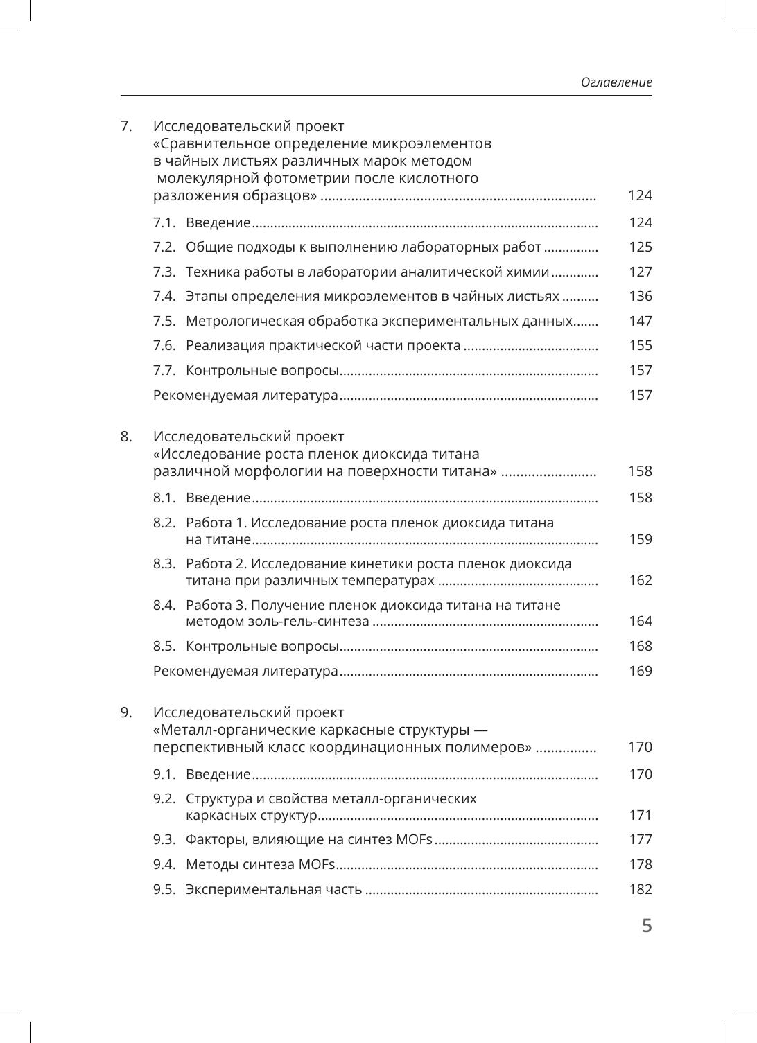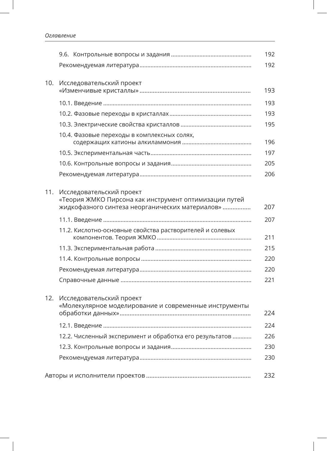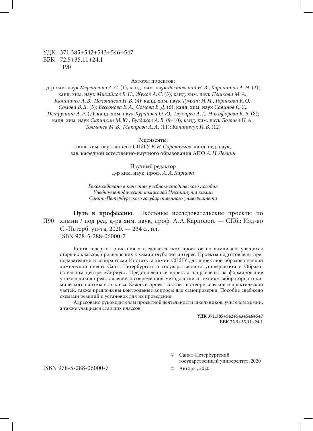 Книга содержит описания исследовательских проектов по химии для учащихся старших классов, проявляюших к химии глубокий интерес. Проекты подготовлены преподавателями и аспирантами Института химии СПбГУ для проектной образовательной химической смены Санкт-Петербургского государственного университета в Образовательном центре «Сириус». Представленные проекты направлены на формирование у школьников представлений о современной методологии и технике лабораторного химического синтеза и анализа. Каждый проект состоит из теоретической и практической частей, также предложены контрольные вопросы для самопроверки. Пособие снабжено схемами реакций и установок для их проведения. Адресовано руководителям проектной деятельности школьников, учителям химии, а также учащимся старших классов.