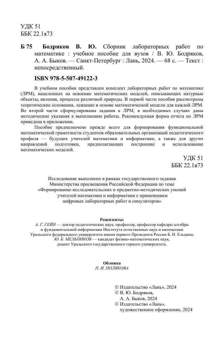 В учебном пособии представлен комплект лабораторных работ по математике (ЛРМ), нацеленных на освоение математических моделей, описывающих натурные объекты, явления, процессы различной природы. В первой части пособия рассмотрены теоретические основания, лежащие в основе математической модели для каждой ЛРМ. Во второй части сформулированы задания к ЛРМ, в необходимых случаях даны методические указания к выполнению работы. Рекомендуемая форма отчета по ЛРМ приведена в приложении. Пособие предназначено прежде всего для формирования функциональной математической грамотности студентов образовательных организаций педагогического профиля — будущих учителей математики и информатики, а также для других направлений подготовки, предполагающих построение и использование математических моделей.