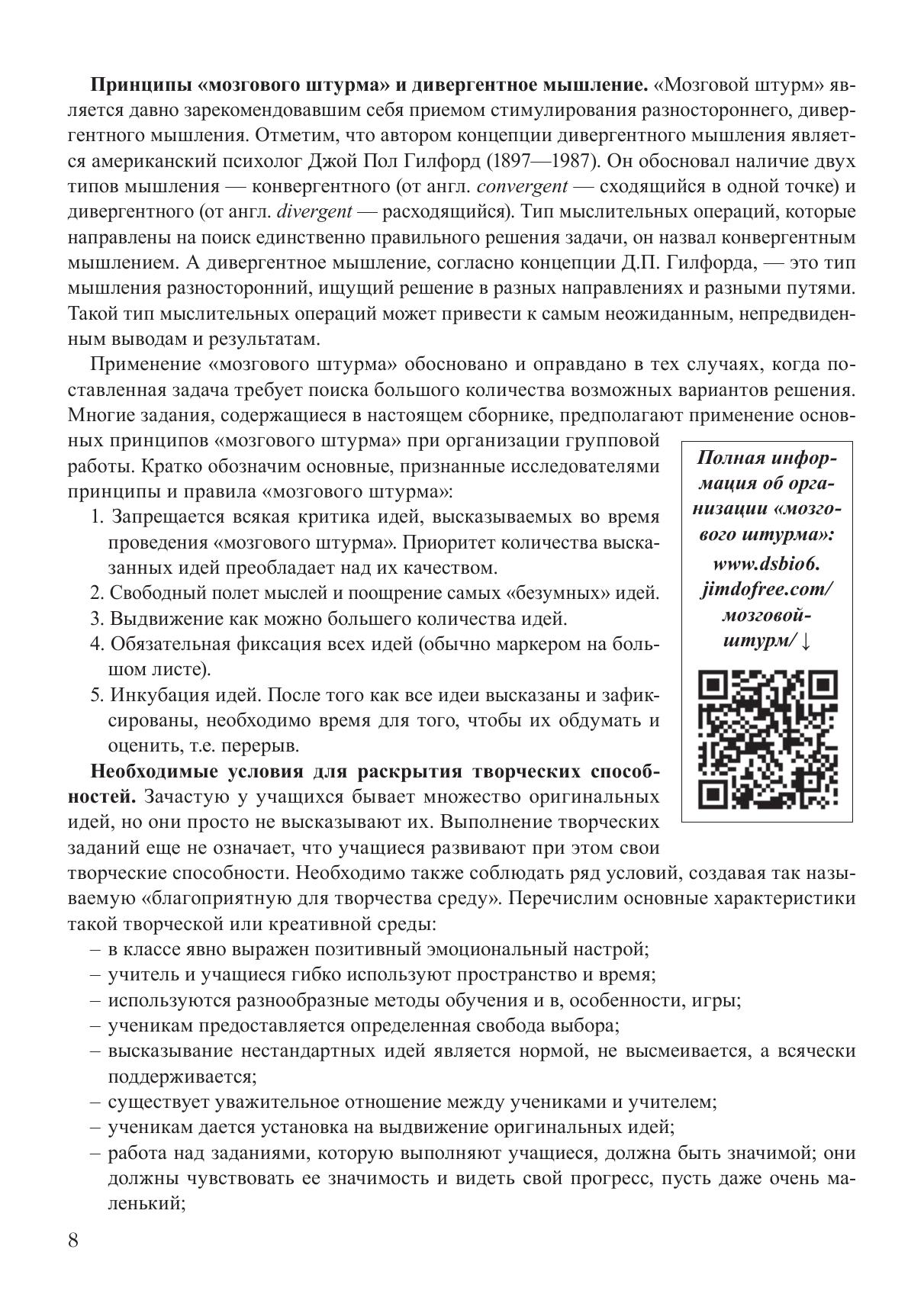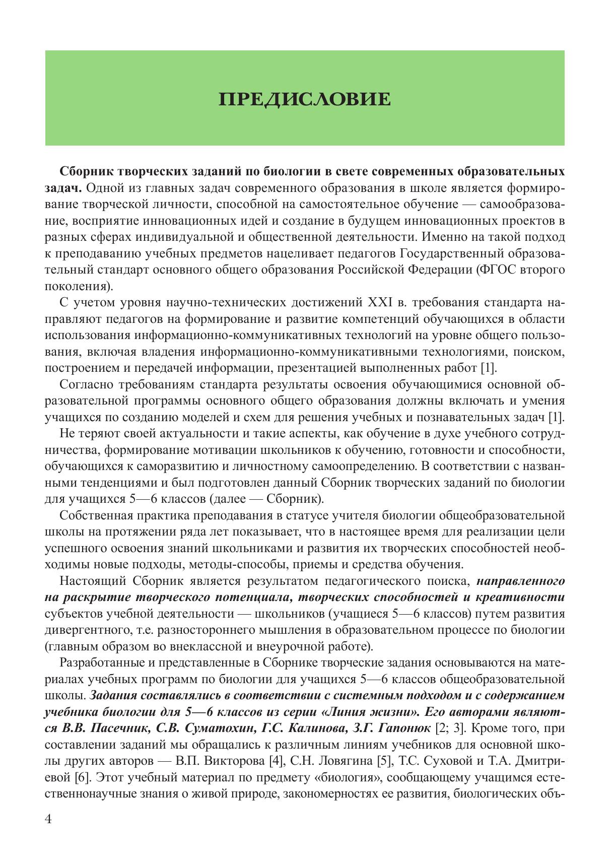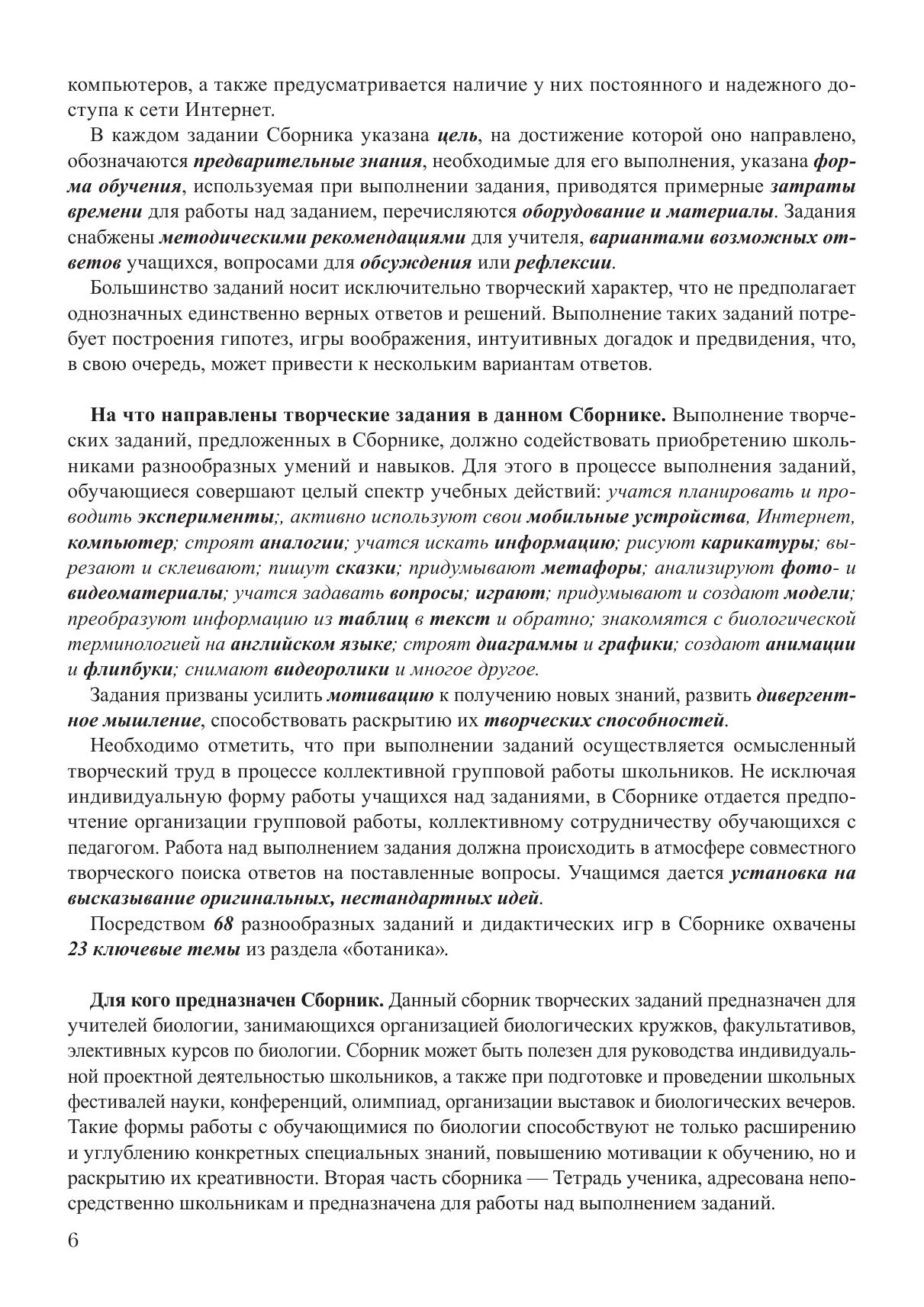 раженном в идеях и требованиях ФГОС второго поколения. Задания основываются на материалах учебных программ по биологии общеобразовательной школы. Составленные с учетом психолого-характерологических особенностей школьников, задания направлены на раскрытие творческих возможностей и развитие творческих способностей учащихся в образовательном процессе. Представленные в сборнике задания главным образом предназначены для организации различных форм внеклассной и внеурочной работы по биологии.