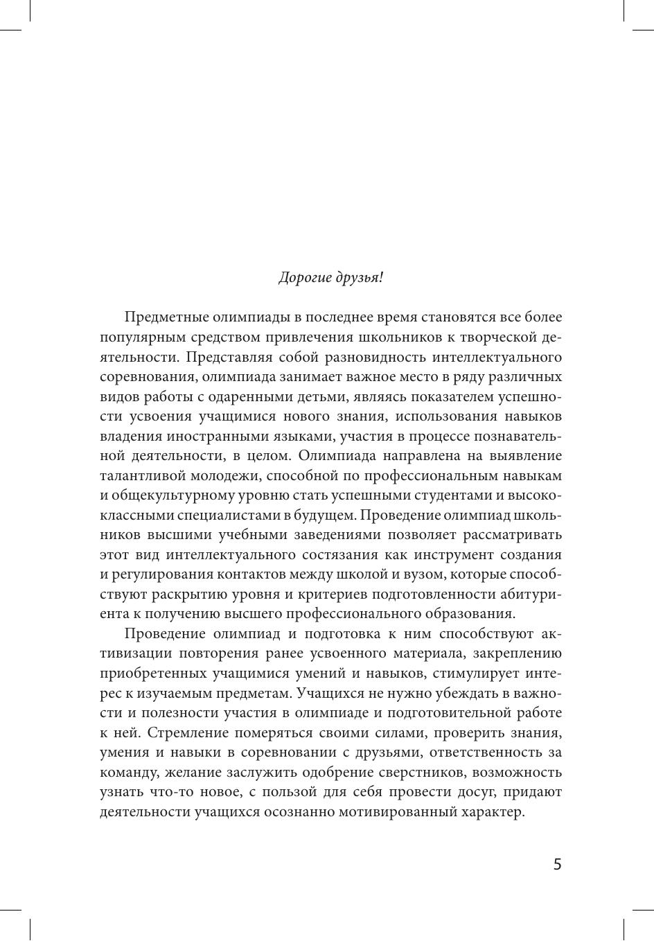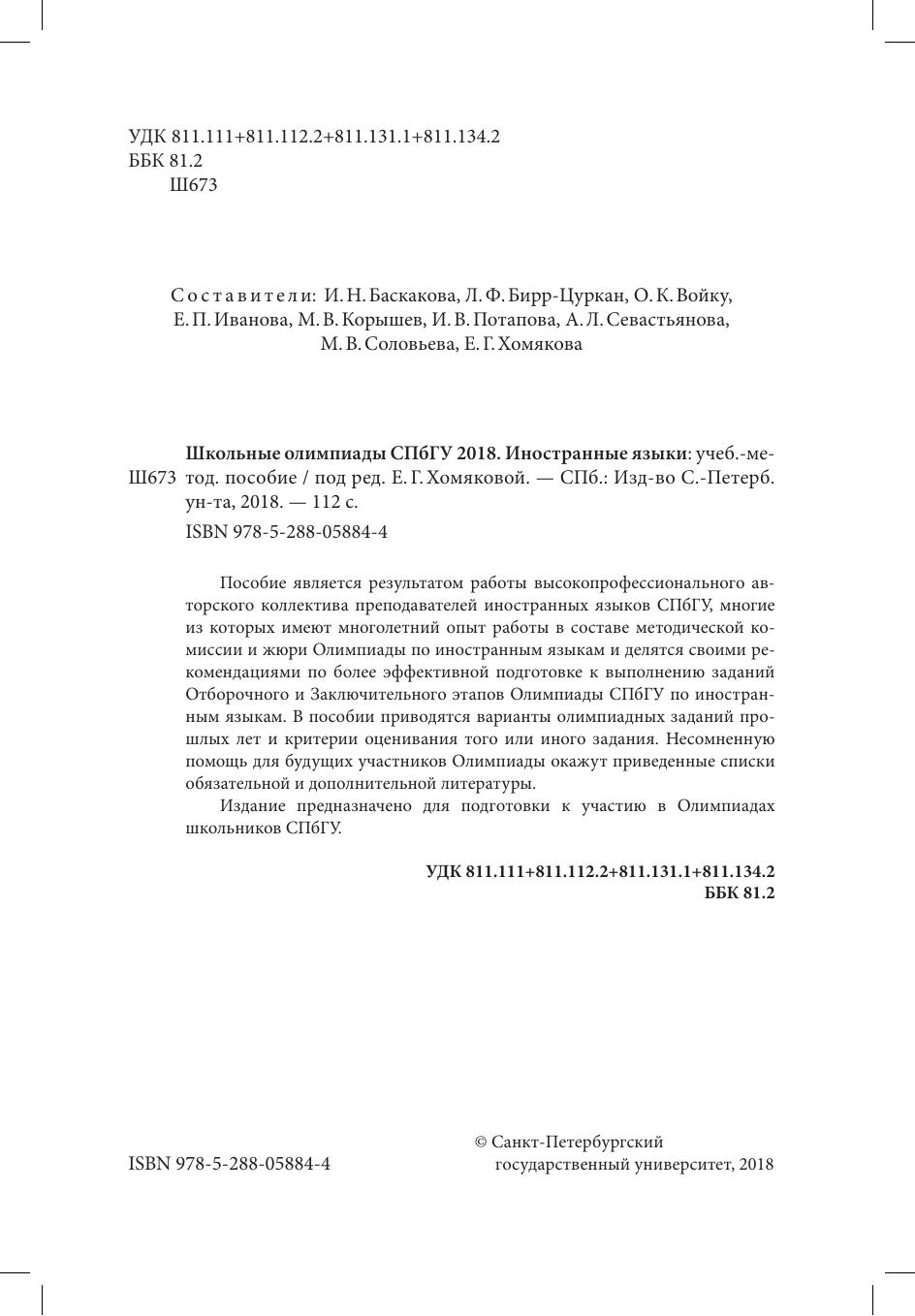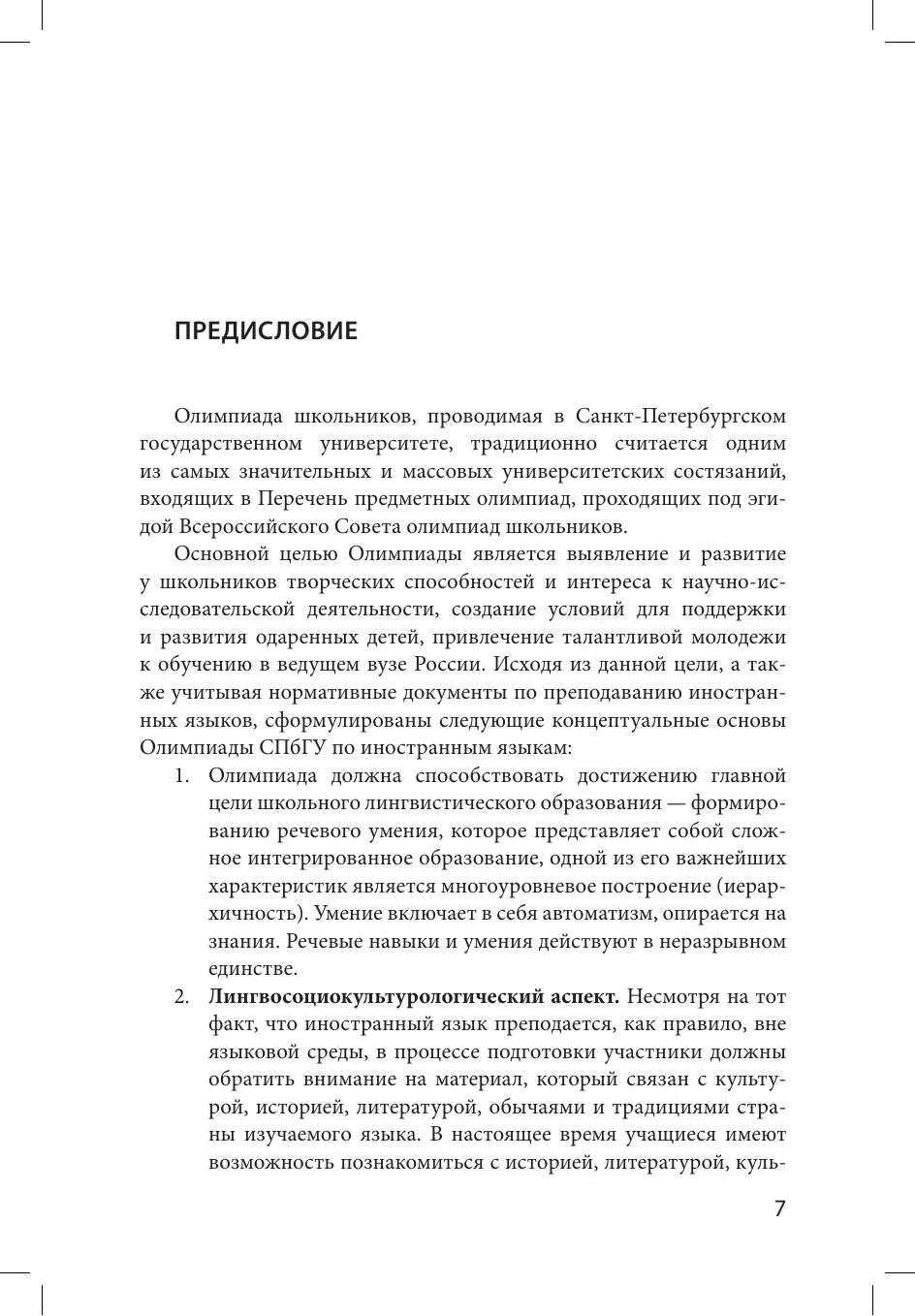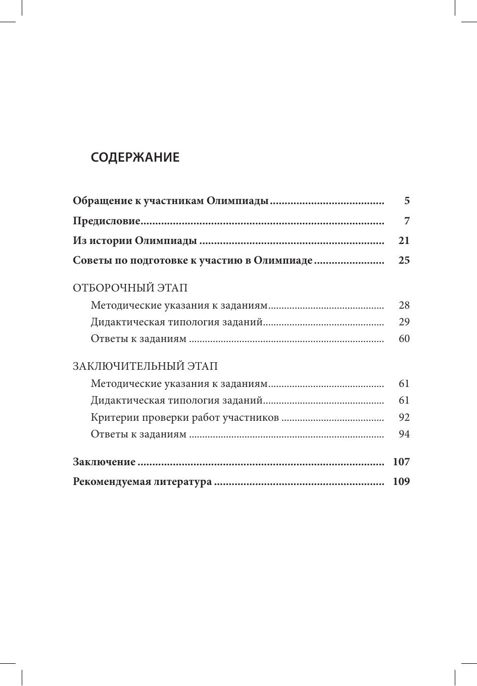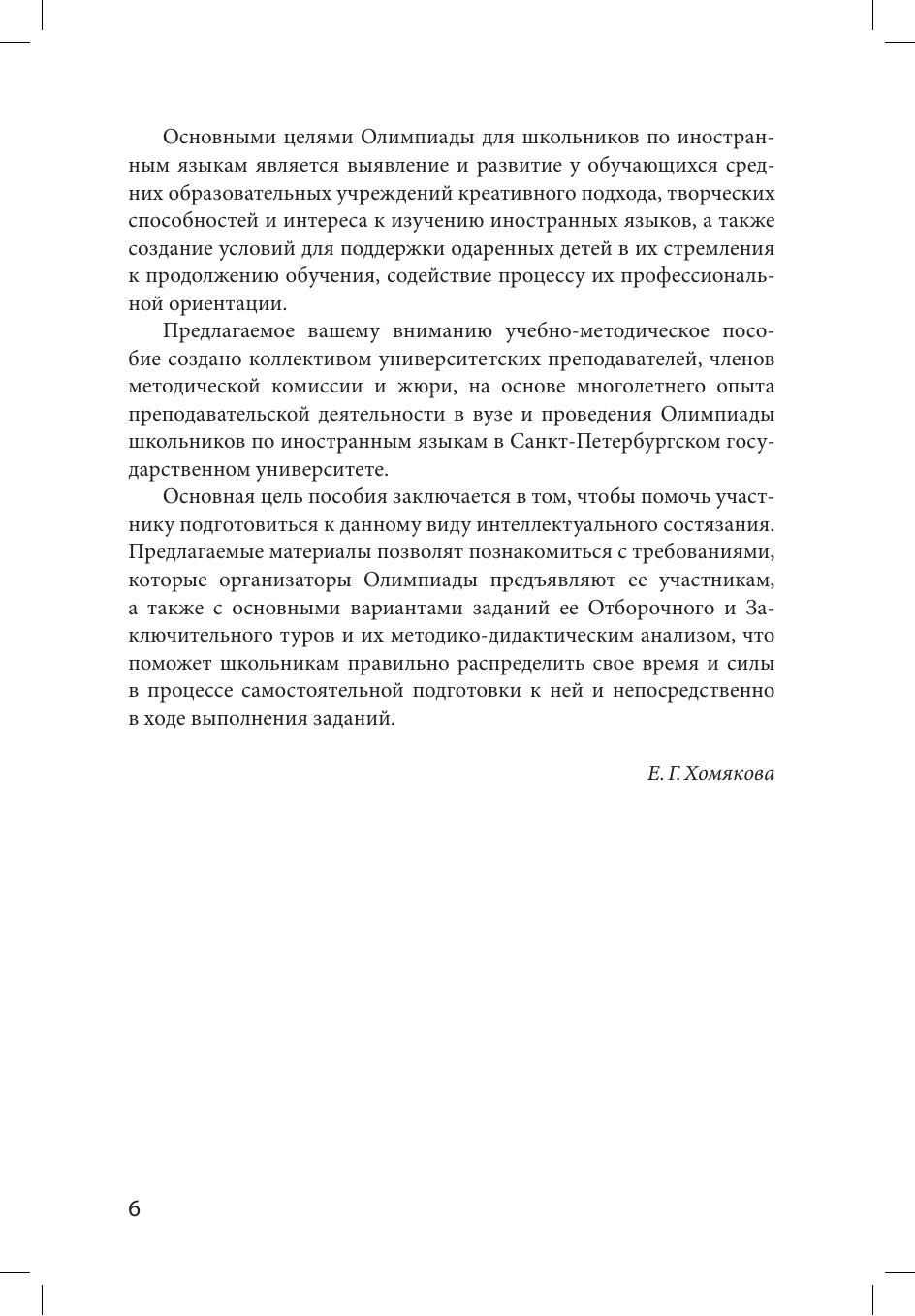 Пособие является результатом работы высокопрофессионального авторского коллектива преподавателей иностранных языков СПбГУ, многие из которых имеют многолетний опыт работы в составе методической комиссии и жюри Олимпиады по иностранным языкам и делятся своими рекомендациями по более эффективной подготовке к выполнению заданий Отборочного и Заключительного этапов Олимпиады СПбГУ по иностранным языкам. В пособии приводятся варианты олимпиадных заданий прошлых лет и критерии оценивания того или иного задания. Несомненную помощь для будущих участников Олимпиады окажут приведенные списки обязательной и дополнительной литературы. Издание предназначено для подготовки к участию в Олимпиадах школьников СПбГУ.