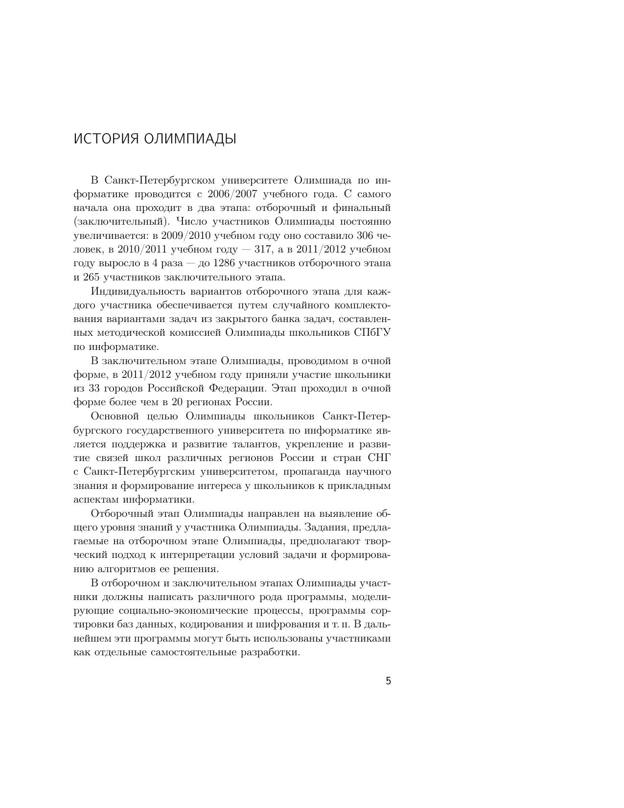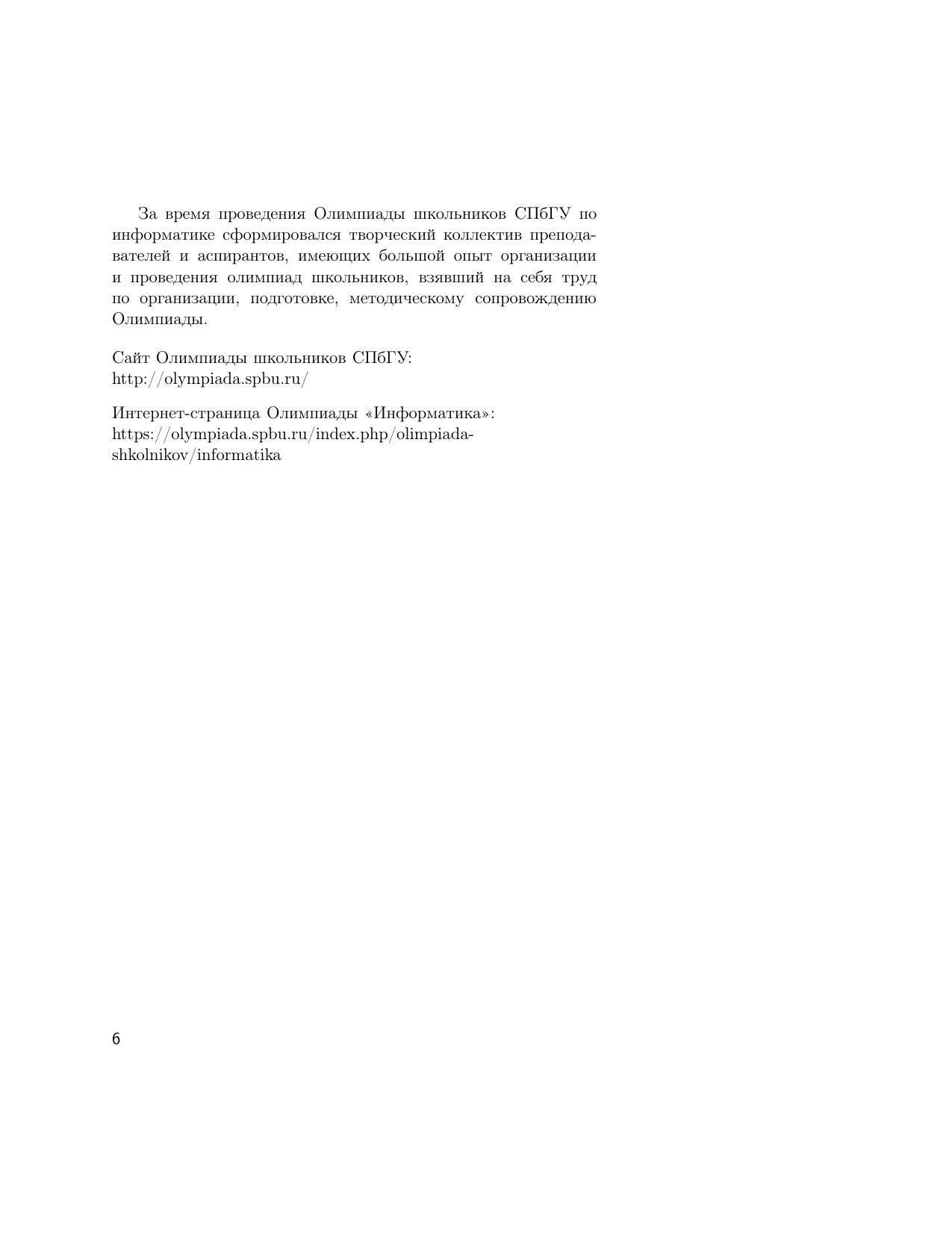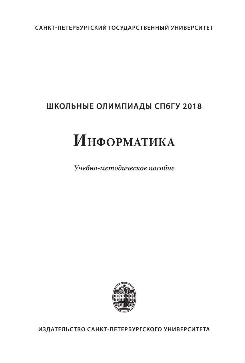 В пособии представлены примеры заданий отборочного и заключительного этапов Олимпиады школьников СПбГУ по предмету «Информатика». Все задачи сопровождаются подробными решениями, а также методическими указаниями. Издание предназначено для подготовки к участию в Олимпиадах школьников СПбГУ.