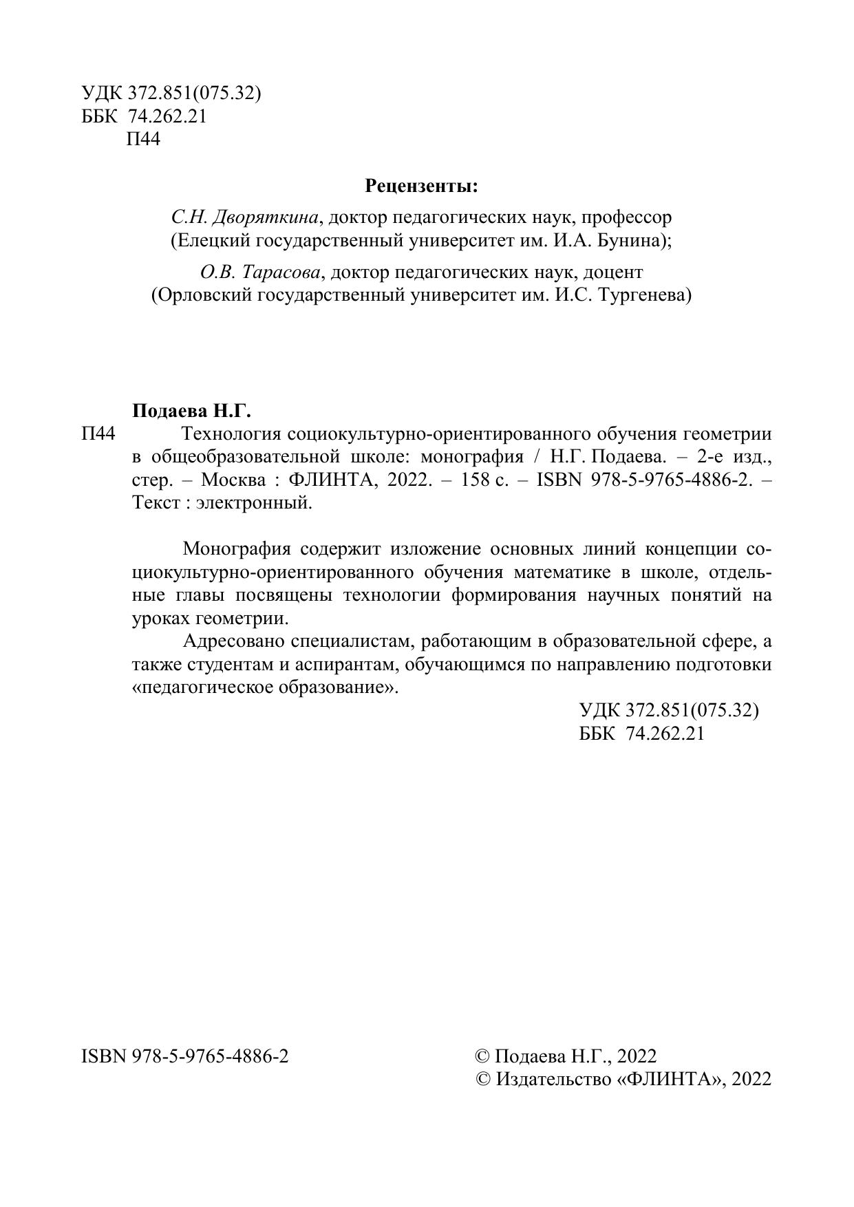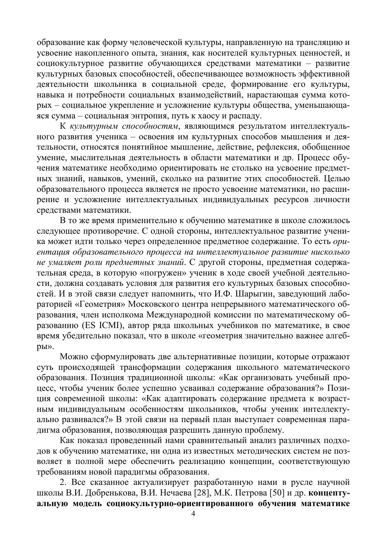 Монография содержит изложение основных линий концепции социокультурно-ориентированного обучения математике в школе, отдельные главы посвящены технологии формирования научных понятий на уроках геометрии.