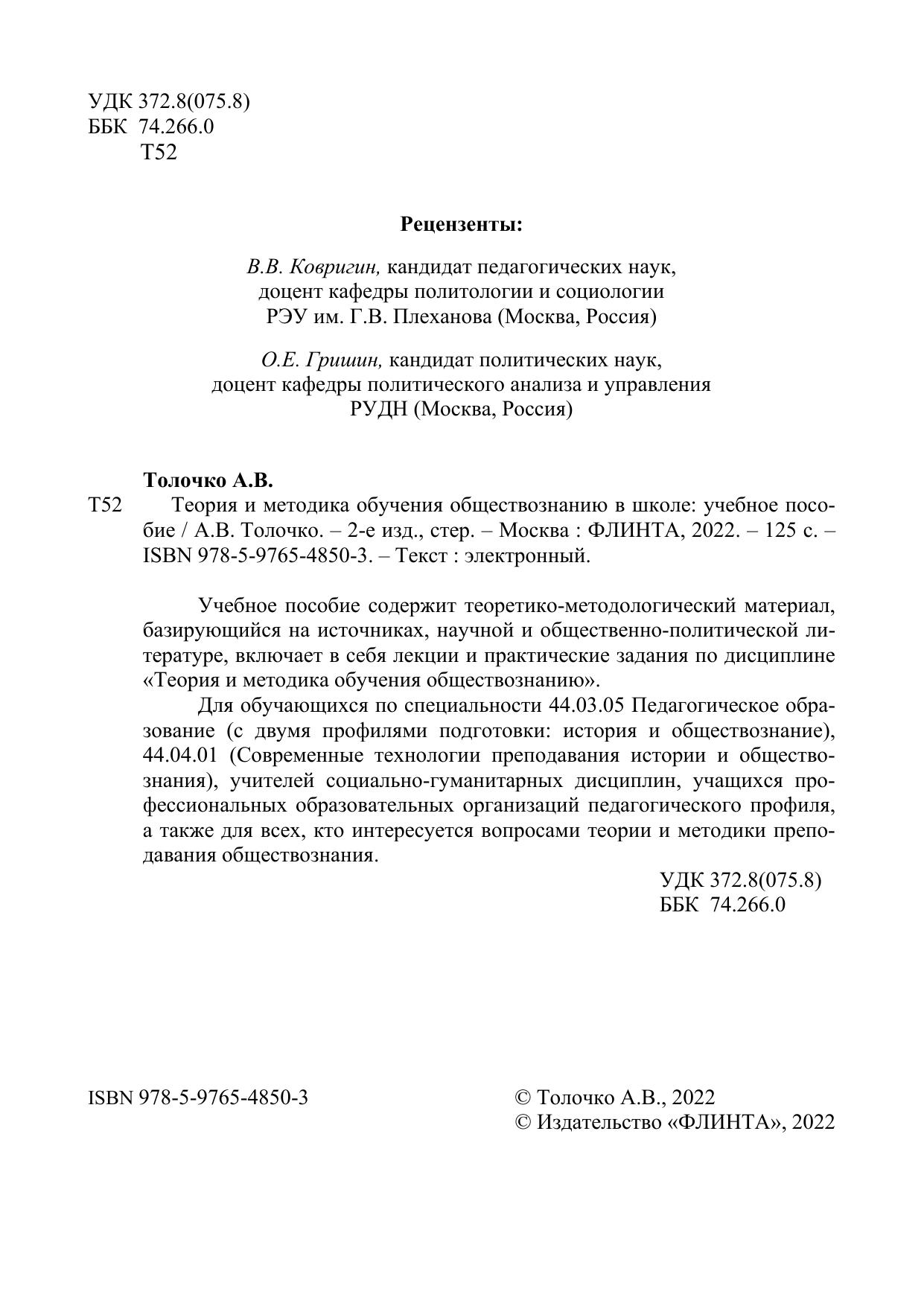 Для обучающихся по специальности 44.03.05 Педагогическое образование (с двумя профилями подготовки: история и обществознание), 44.04.01 (Современные технологии преподавания истории и обществознания), учителей социально-гуманитарных дисциплин, учащихся про-фессиональных образовательных организаций педагогического профиля, а также для всех, кто интересуется вопросами теории и методики преподавания обществознания.