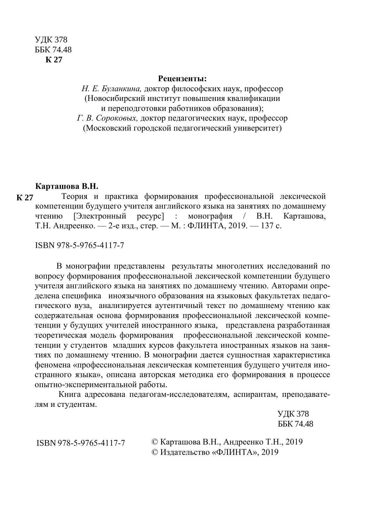 В монографии представлены результаты многолетних исследований по вопросу формирования профессиональной лексической компетенции будущего учителя английского языка на занятиях по домашнему чтению. Авторами определена специфика иноязычного образования на языковых факультетах педагогического вуза, анализируется аутентичный текст по домашнему чтению как содержательная основа формирования профессиональной лексической компетенции у будущих учителей иностранного языка, представлена разработанная теоретическая модель формирования профессиональной лексической компетенции у студентов младших курсов факультета иностранных языков на занятиях по домашнему чтению. В монографии дается сущностная характеристика феномена «профессиональная лексическая компетенция будущего учителя иностранного языка», описана авторская методика его формирования в процессе опытно-экспериментальной работы.