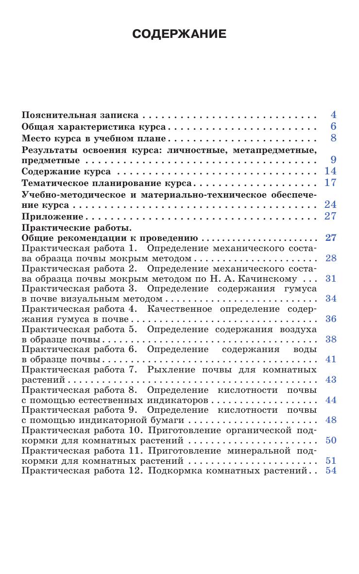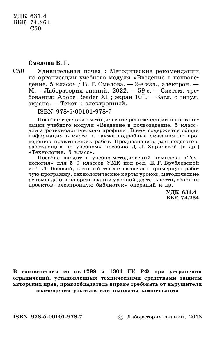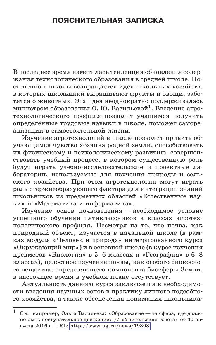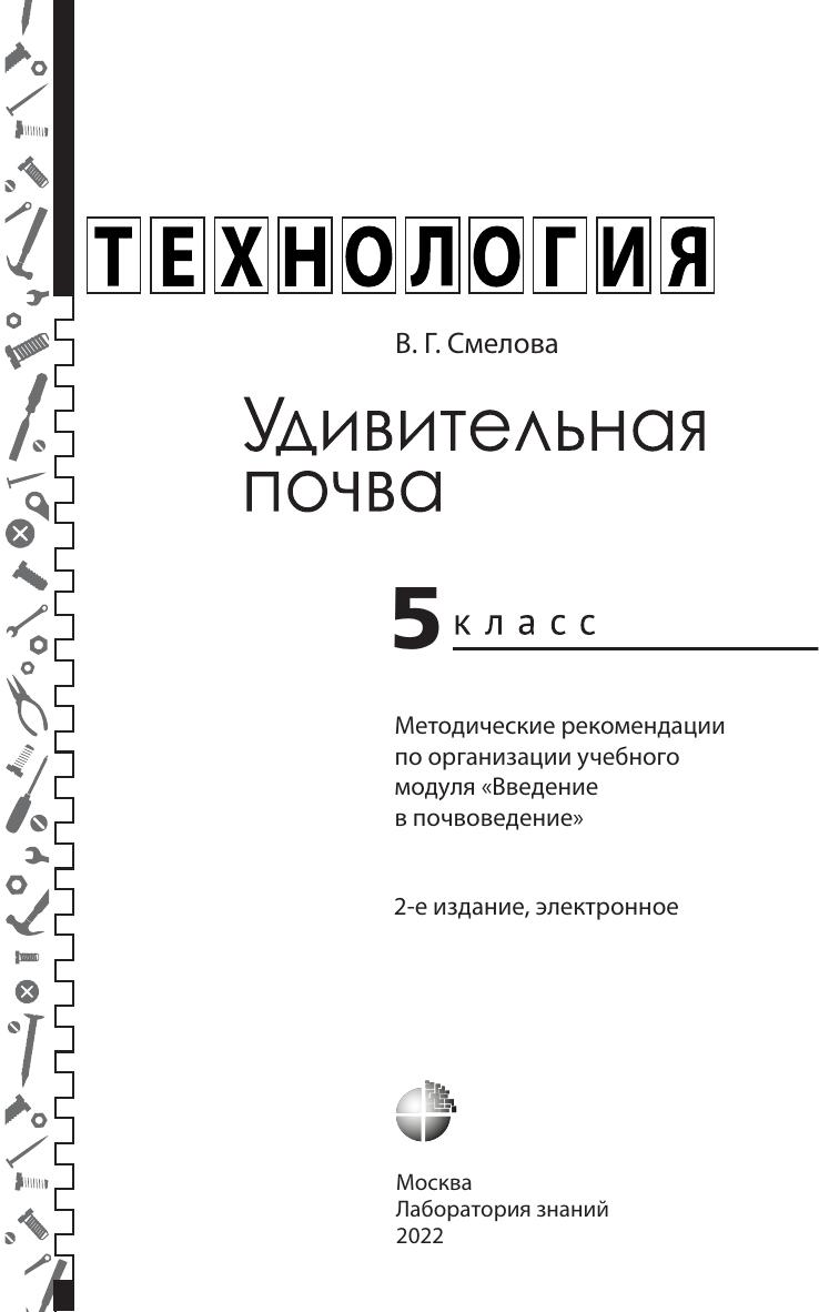 Пособие содержит методические рекомендации по организации учебного модуля «Введение в почвоведение. 5 класс» для агротехнологического профиля. В нем содержится общая информация о курсе, а также подробные указания по проведению практических работ. Предназначено для педагогов, работающих по учебному пособию Д. Л. Харичевой [и др.] «Технология. 5 класс». Пособие входит в учебно-методический комплект «Технология» для 5–9 классов УМК под ред. Е. Г. Врублевской и Л. Л. Босовой, который также включает примерную рабочую программу, технологические карты уроков, методические рекомендации по организации урочной деятельности, сборник проектов, электронную библиотеку операций и др.