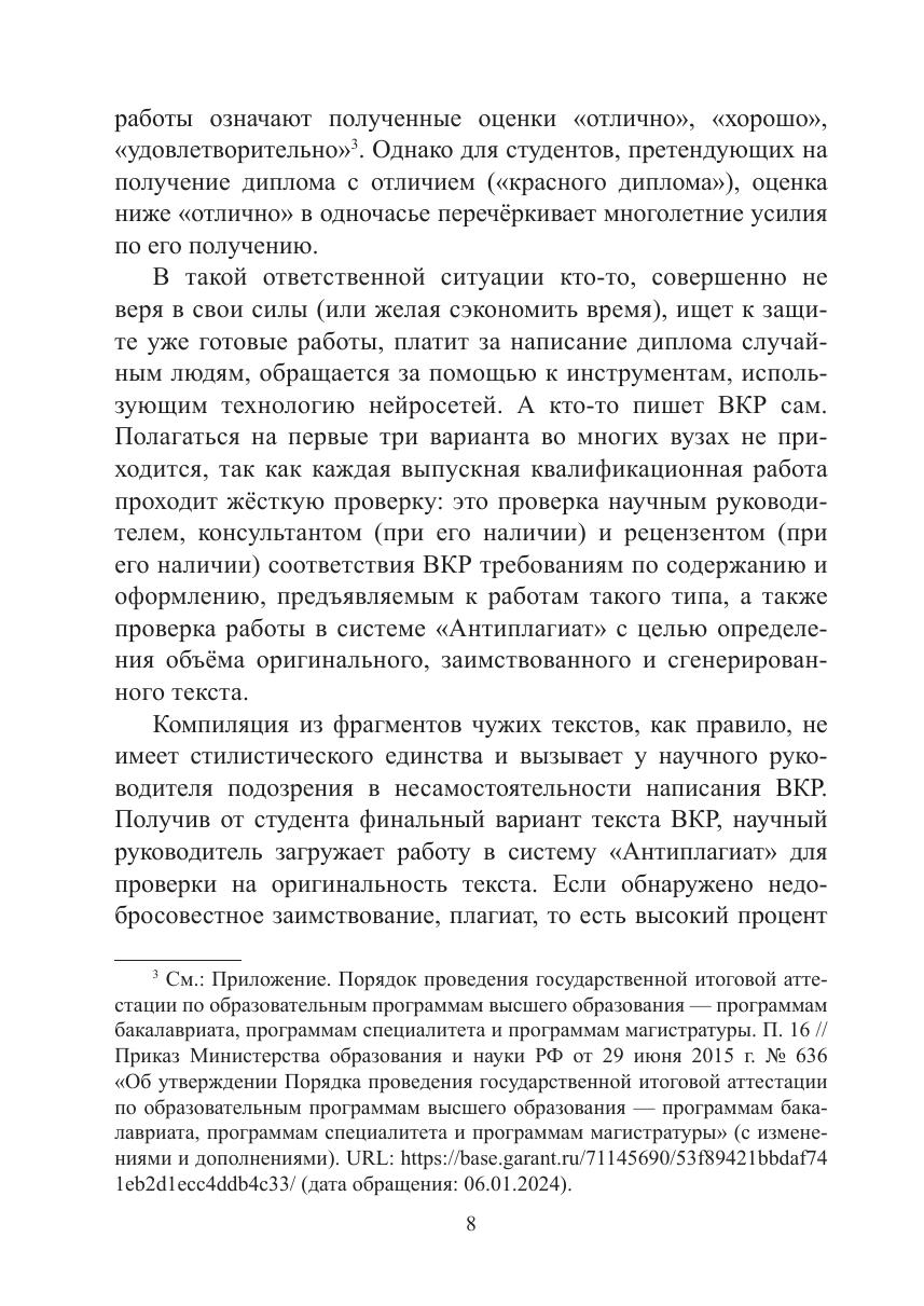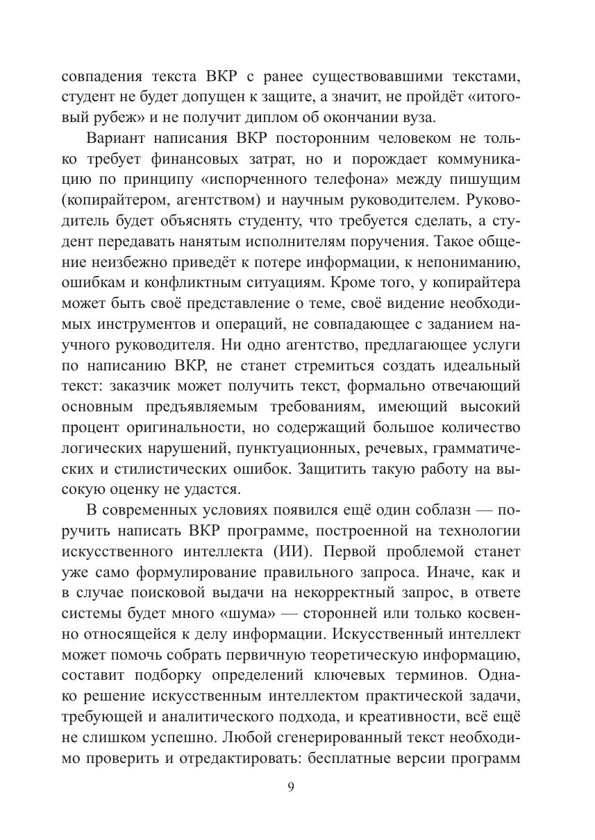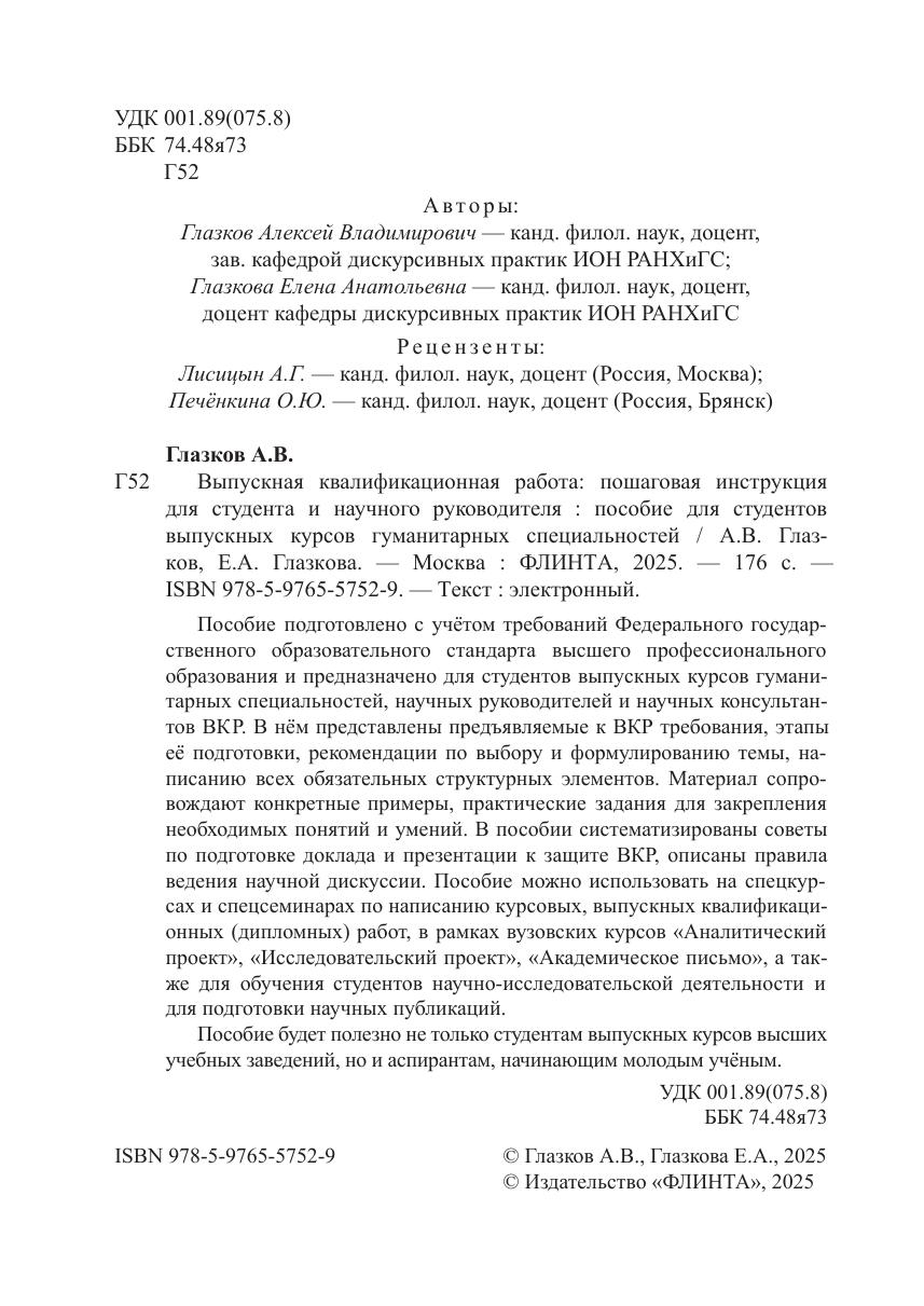 вождают конкретные примеры, практические задания для закрепления необходимых понятий и умений. В пособии систематизированы советы по подготовке доклада и презентации к защите ВКР, описаны правила ведения научной дискуссии. Пособие можно использовать на спецкурсах и спецсеминарах по написанию курсовых, выпускных квалификационных (дипломных) работ, в рамках вузовских курсов «Аналитический проект», «Исследовательский проект», «Академическое письмо», а также для обучения студентов научно-исследовательской деятельности и для подготовки научных публикаций. Пособие будет полезно не только студентам выпускных курсов высших учебных заведений, но и аспирантам, начинающим молодым учёным.