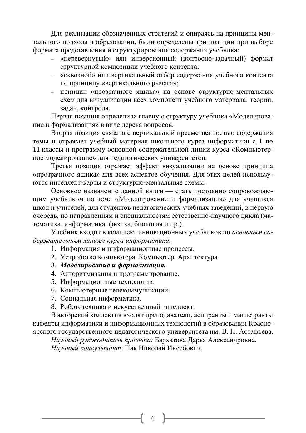 Основное назначение данной книги – стать постоянно сопровождающим учебником по теме «Моделирование и формализация» для учащихся школ и учителей, для студентов педагогических вузов, в первую очередь, по направлениям и специальностям естественно-научного цикла (математика, информатика, физика, биология и пр.). Учебник предназначен для студентов учреждений высшего педагогического образования при изучении раздела информатики «Моделирование и формализация», а также для обучения учащихся со 2 по 11 классы (в первую очередь для учащихся психолого-педагогических классов).