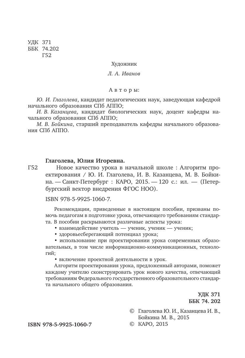 Алгоритм проектирования урока, предложенный авторами, поможет каждому учителю сконструировать урок нового качества, отвечающий требованиям Федерального государственного образовательного стандарта начального общего образования.