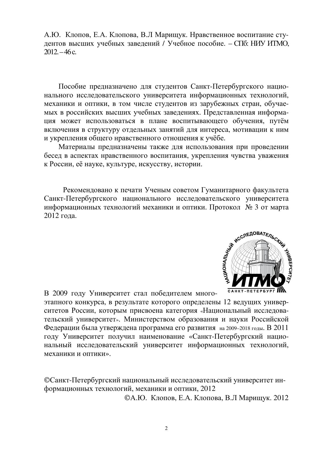 Пособие предназначено для студентов Санкт-Петербургского национального исследовательского университета информационных технологий, механики и оптики, в том числе студентов из зарубежных стран, обучаемых в российских высших учебных заведениях. Представленная информация может использоваться в плане воспитывающего обучения, путём включения в структуру отдельных занятий для интереса, мотивации к ним и укрепления общего нравственного отношения к учёбе. Материалы предназначены также для использования при проведении бесед в аспектах нравственного воспитания, укрепления чувства уважения к России, её науке, культуре, искусству, истории.