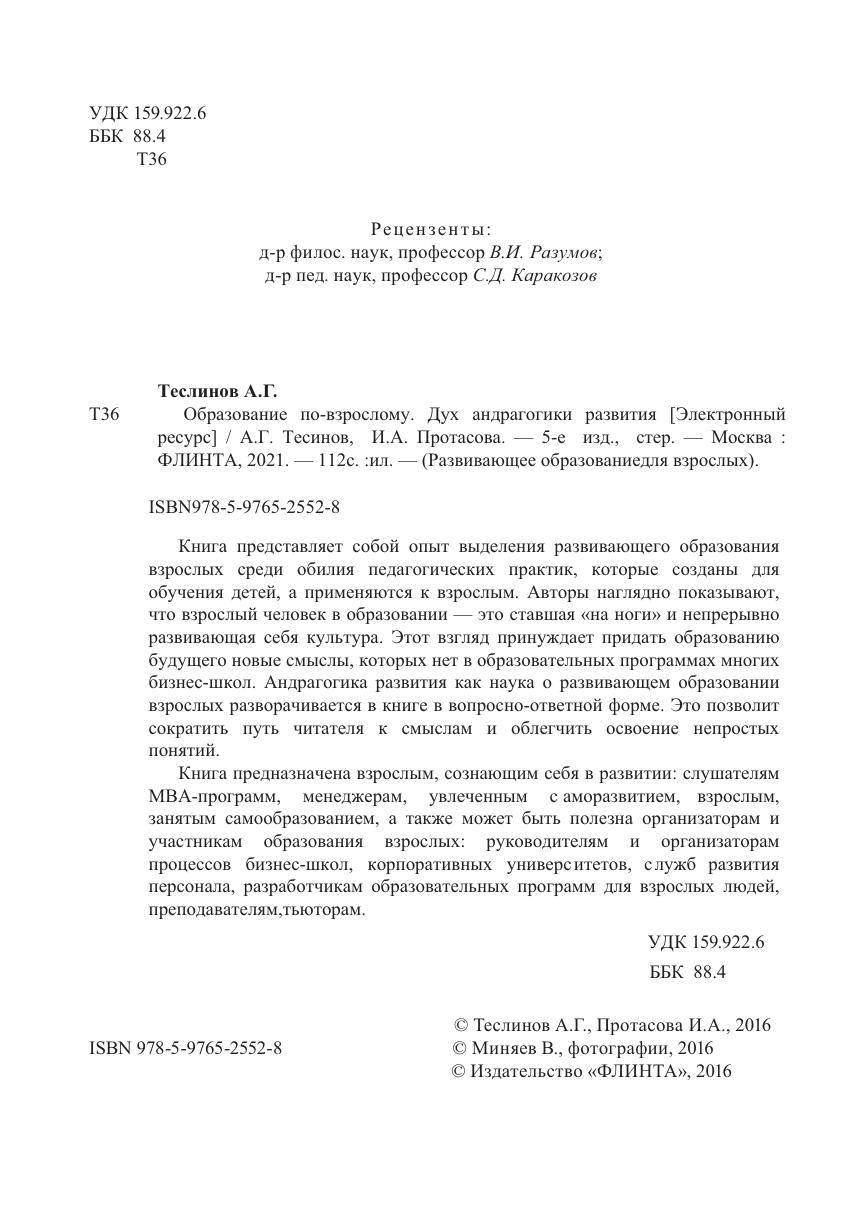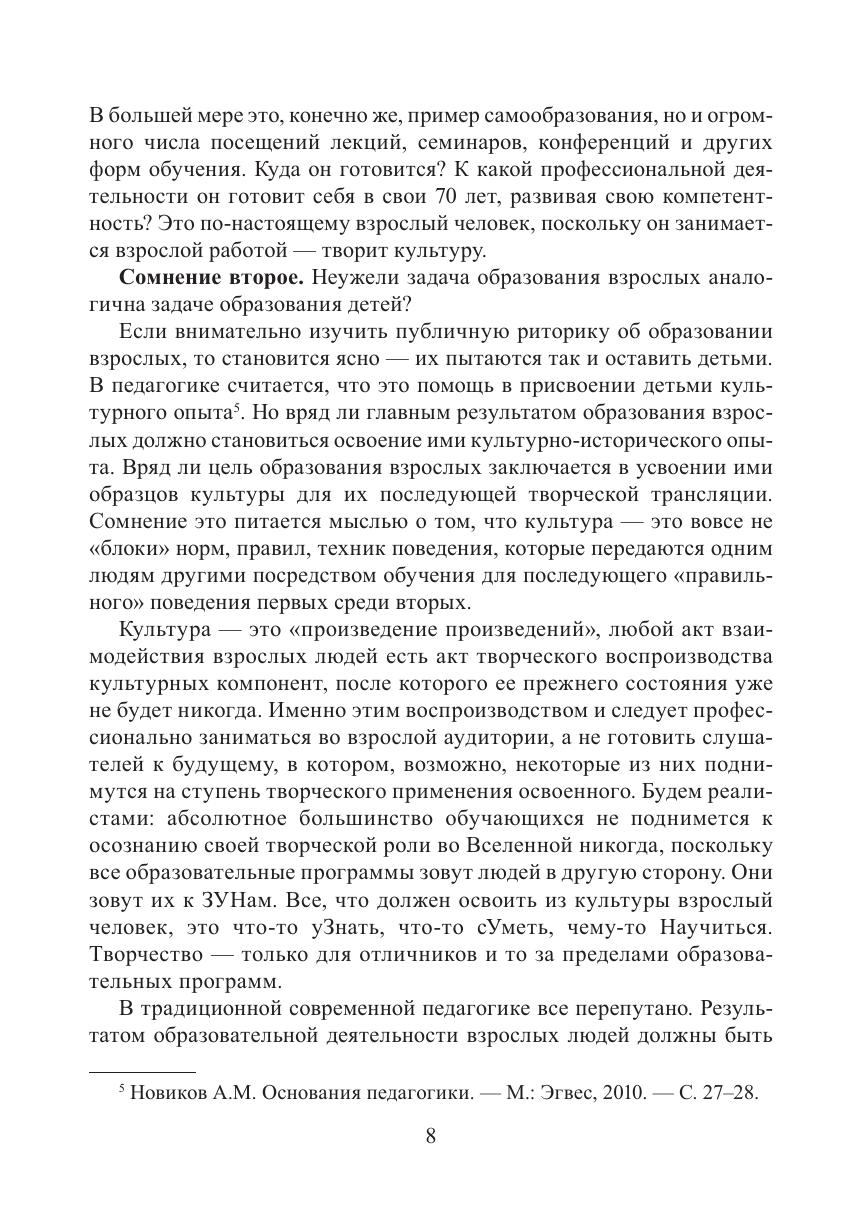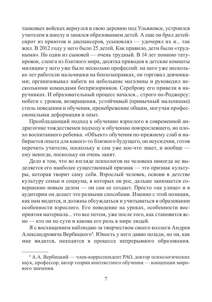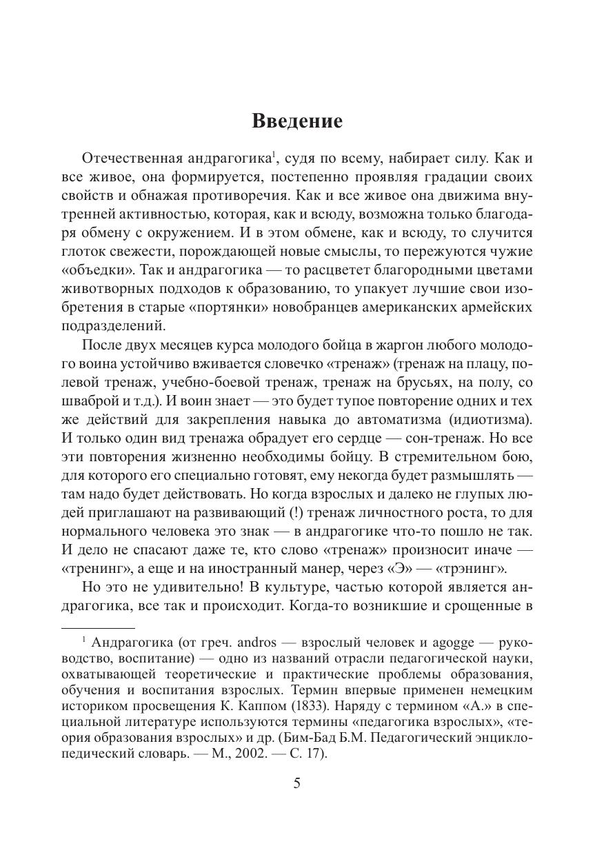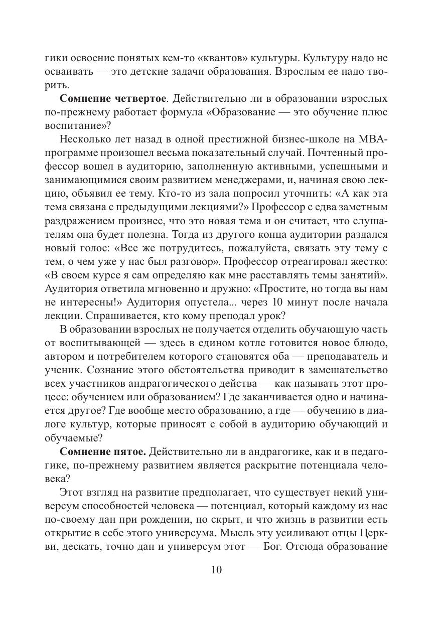 Книга представляет собой опыт выделения развивающего образования взрослых среди обилия педагогических практик, которые созданы для обучения детей, а применяются к взрослым. Авторы наглядно показывают, что взрослый человек в образовании – это ставшая «на ноги» и непрерывно развивающая себя культура. Этот взгляд принуждает придать образованию будущего новые смыслы, которых нет в образовательных программах многих бизнес-школ. Андрагогика развития как наука о развивающем образовании взрослых разворачивается в книге в вопросно-ответной форме. Это позволит сократить путь читателя к смыслам и облегчить освоение непростых понятий.