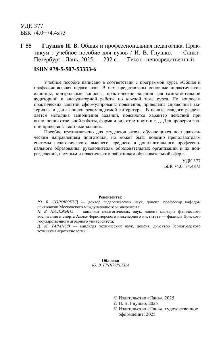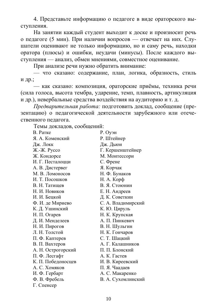 Учебное пособие написано в соответствии с программой курса «Общая и профессиональная педагогика». В нем представлены основные дидактические единицы, контрольные вопросы, практические задания для самостоятельной аудиторной и внеаудиторной работы по каждой теме курса. По вопросам практических занятий сформулированы пояснения, приведены справочные материалы и даны списки рекомендуемой литературы. В начале каждого раздела дается методика выполнения заданий, поясняется характер действий при выполнении отдельной работы, форма и вид отчетности и т. д. Для проверки знаний приведены тестовые задания. Пособие предназначено для студентов вузов, обучающихся по педагогическим направлениям подготовки, но может быть полезно преподавателям системы педагогического высшего, среднего и дополнительного профессионального образования, руководителям образовательных организаций и их подразделений, научным и практическим работникам образовательной сферы.