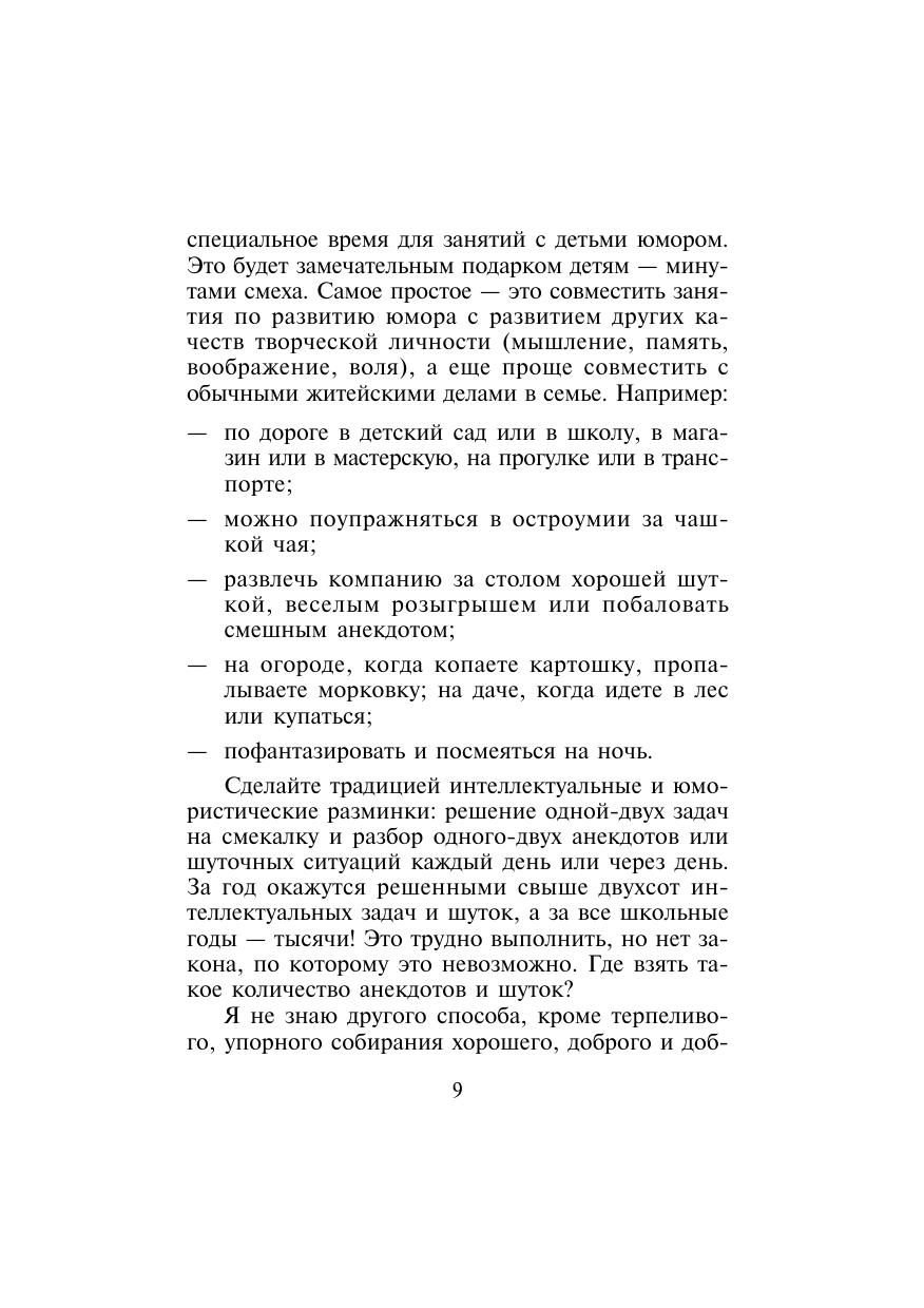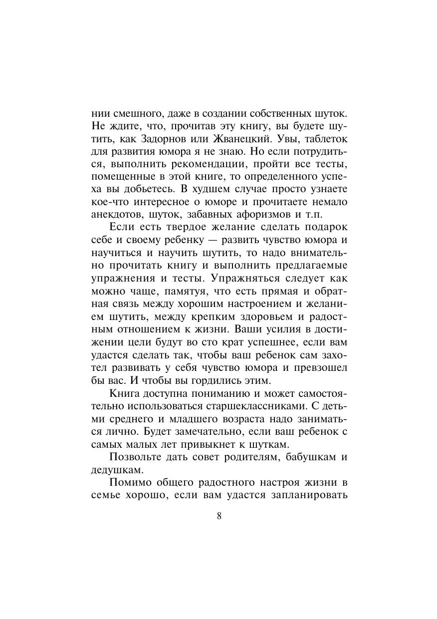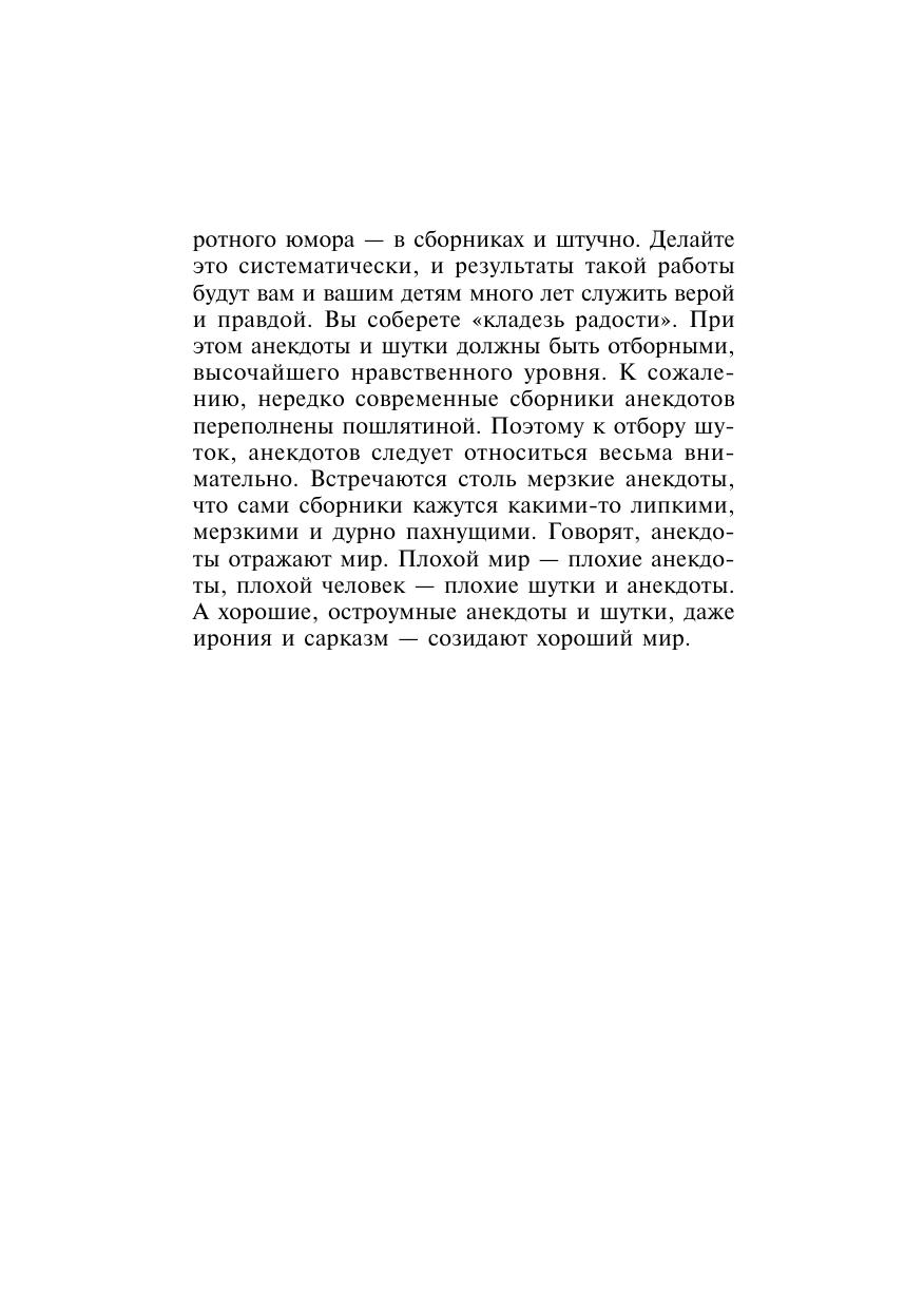 Это веселая и одновременно серьезная книга. В ней рассказывается о шутках и юморе, о том, как понимать юмор, как развить у себя и у детей чувство юмора, как научиться создавать шутки, юмор, комплименты, и вообще, как обрести радостное и светлое отношение к жизни. В данном случае цель смеха и цель книги совпадают — доставить радость и пользу читателю, увеличить меру его счастья. В книге также рассказано, над чем можно смеяться, а над чем смеяться не следует, где и как рассказывать анекдоты. Приведены юмористические тесты и просто анекдоты, шутки, афоризмы.
