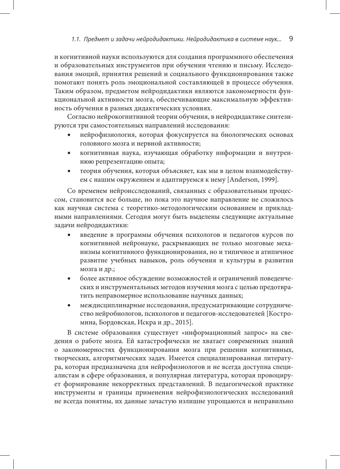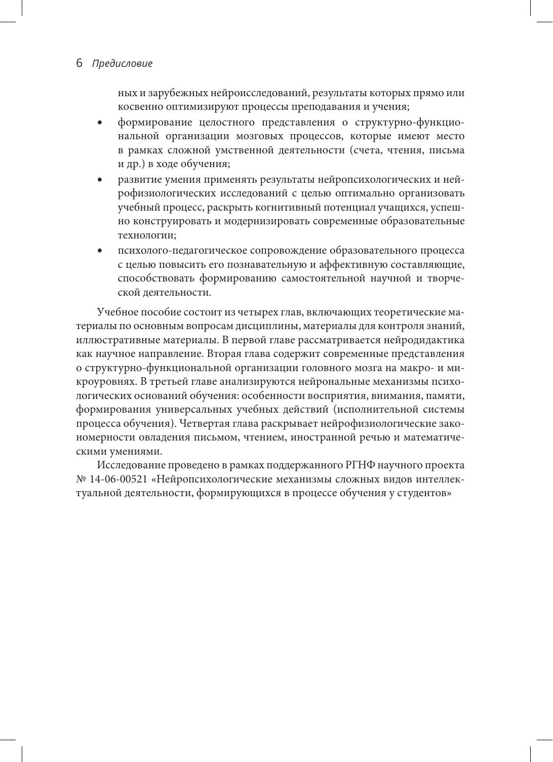В пособии представлены современные фундаментальные и прикладные исследования нейрофизиологических оснований образовательного процесса, результаты которых прямо или косвенно оптимизируют процессы преподавания и обучения. Рассмотрены структурно-функциональная организация головного мозга (на макро- и микроуровнях), о нейрональные механизмы психологических оснований обучения (особенности восприятия, внимания, памяти, формирования универсальных учебных действий), нейрофизиологические закономерности овладения письмом, чтением, иностранной речью и математическими умениями. Книга предназначена для студентов, может быть полезна аспирантам факультетов психологии и педагогики, а также специалистам сферы образования, готовым применять результаты нейропсихологических и нейрофизиологических исследований в методических целях.