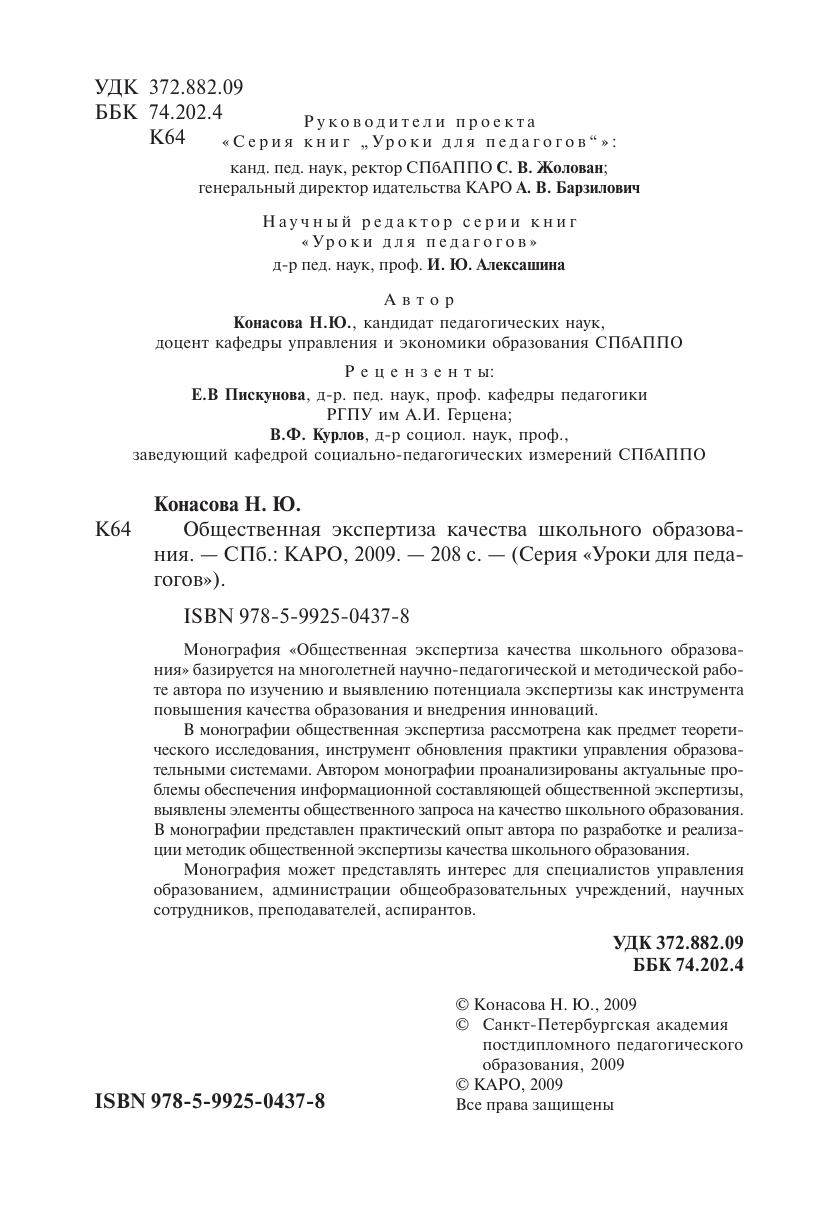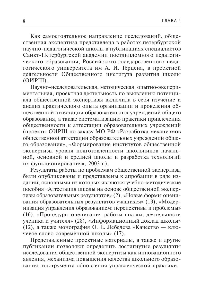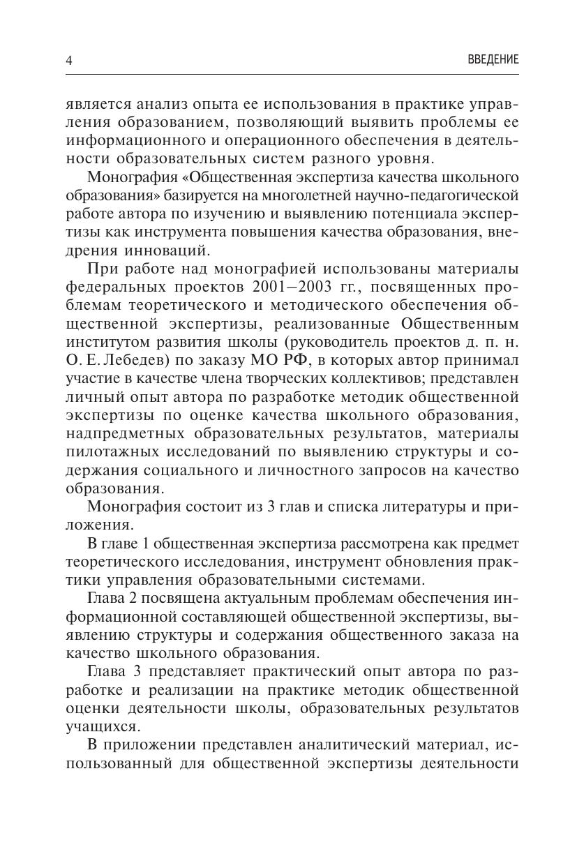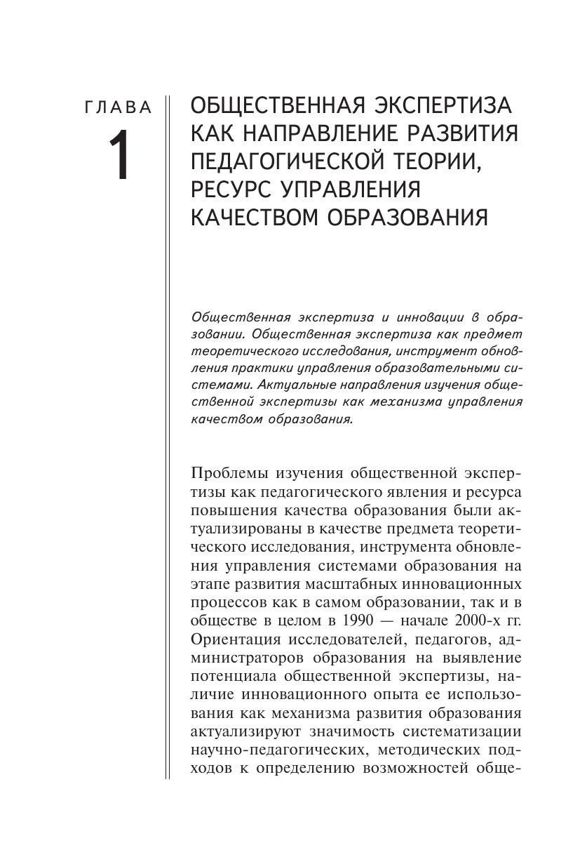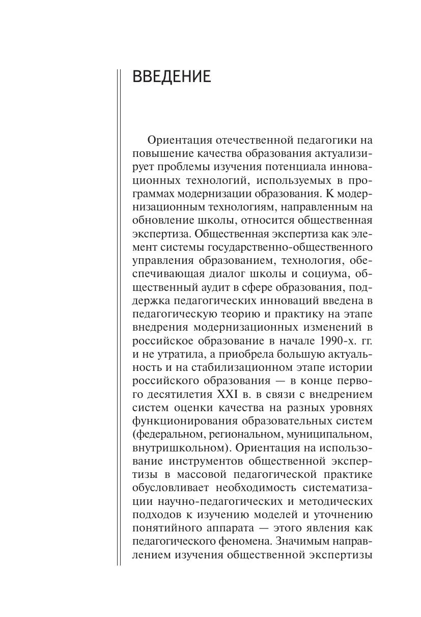 Монография «Общественная экспертиза качества школьного образования» базируется на многолетней научно-педагогической и методической работе автора по изучению и выявлению потенциала экспертизы как инструмента повышения качества образования и внедрения инноваций. В монографии общественная экспертиза рассмотрена как предмет теоретического исследования, инструмент обновления практики управления образовательными системами. Автором монографии проанализированы актуальные проблемы обеспечения информационной составляющей общественной экспертизы, выявлены элементы общественного запроса на качество школьного образования. В монографии представлен практический опыт автора по разработке и реализации методик общественной экспертизы качества школьного образования. Монография может представлять интерес для специалистов управления образованием, администрации общеобразовательных учреждений, научных сотрудников, преподавателей, аспирантов.