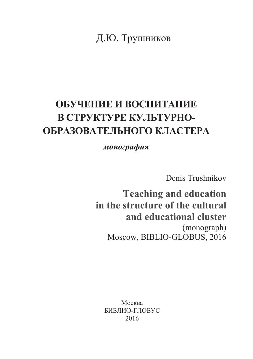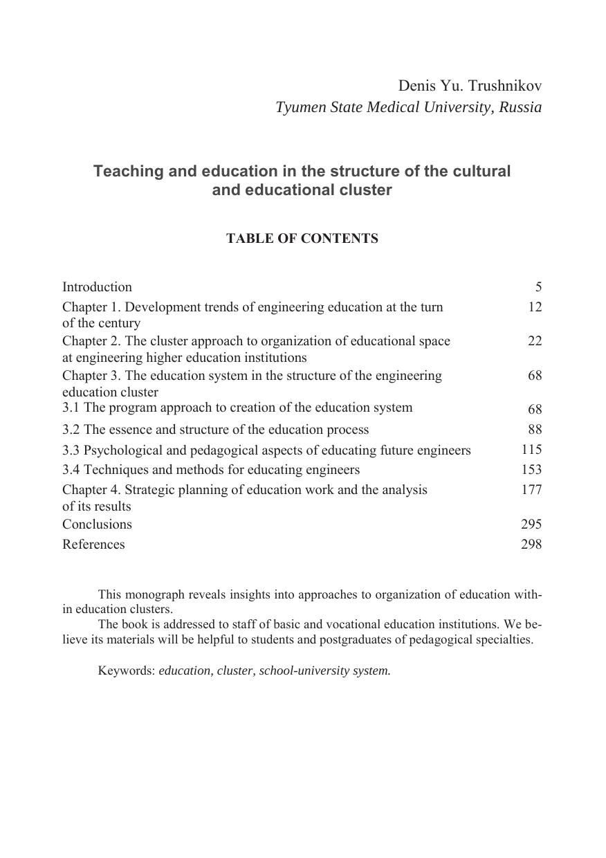 В монографии раскрываются подходы к организации воспитания в структуре образовательного кластера. Монография адресована работникам образовательных организаций основного и профессионального образования. Представленные в ней материалы будут полезны студентам и аспирантам педагогических специальностей.