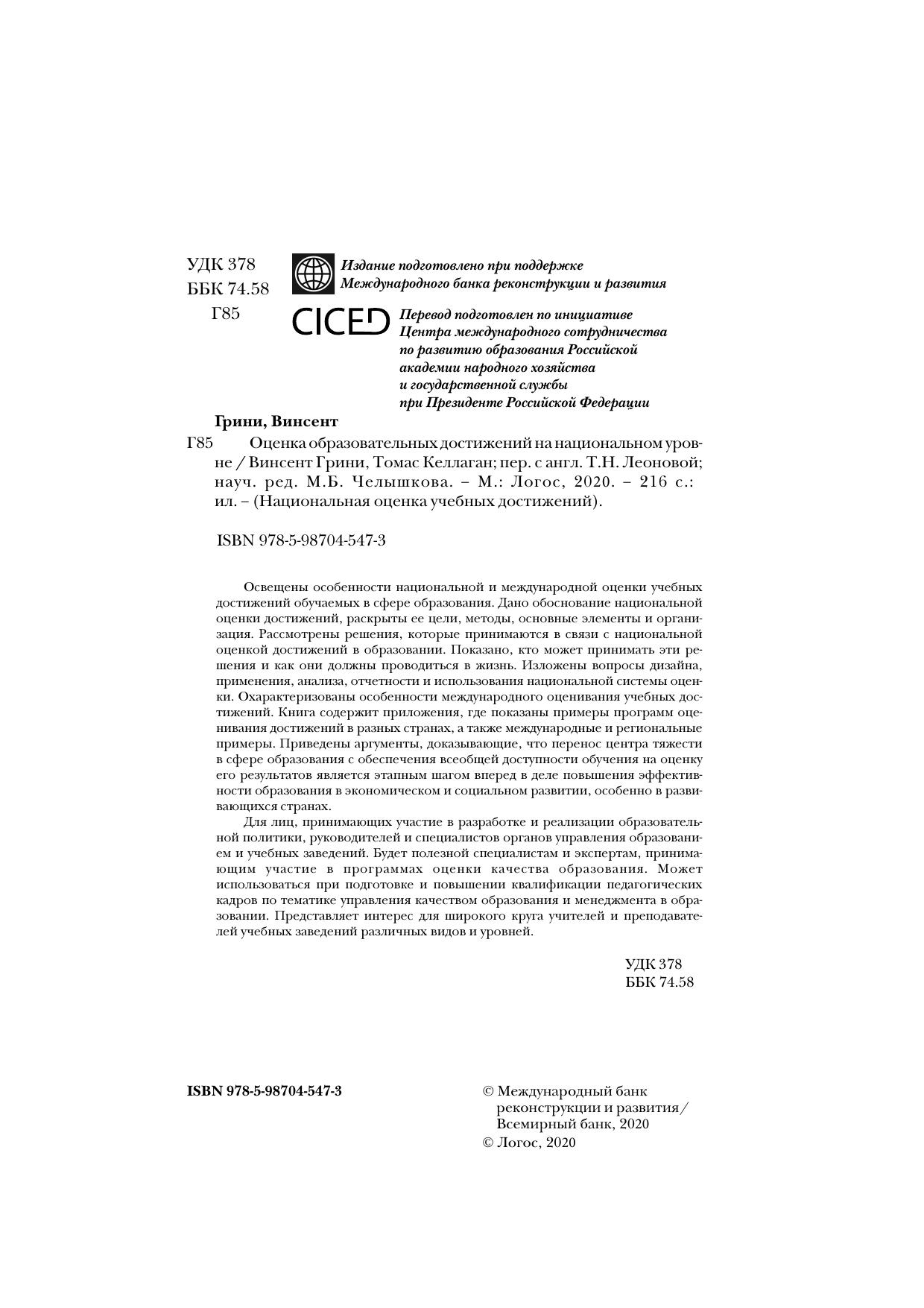 Освещены особенности национальной и международной оценки учебных достижений обучаемых в сфере образования. Дано обоснование национальной оценки достижений, раскрыты ее цели, методы, основные элементы и организация. Рассмотрены решения, которые принимаются в связи с национальной оценкой достижений в образовании. Показано, кто может принимать эти решения и как они должны проводиться в жизнь. Изложены вопросы дизайна, применения, анализа, отчетности и использования национальной системы оценки. Охарактеризованы особенности международного оценивания учебных достижений. Книга содержит приложения, где показаны примеры программ оценивания достижений в разных странах, а также международные и региональные примеры. Приведены аргументы, доказывающие, что перенос центра тяжести в сфере образования с обеспечения всеобщей доступности обучения на оценку его результатов является этапным шагом вперед в деле повышения эффективности образования в экономическом и социальном развитии, особенно в развивающихся странах. Для лиц, принимающих участие в разработке и реализации образовательной политики, руководителей и специалистов органов управления образованием и учебных заведений. Будет полезной специалистам и экспертам, принимающим участие в программах оценки качества образования. Может использоваться при подготовке и повышении квалификации педагогических кадров по тематике управления качеством образования и менеджмента в образовании. Представляет интерес для широкого круга учителей и преподавателей учебных заведений различных видов и уровней.