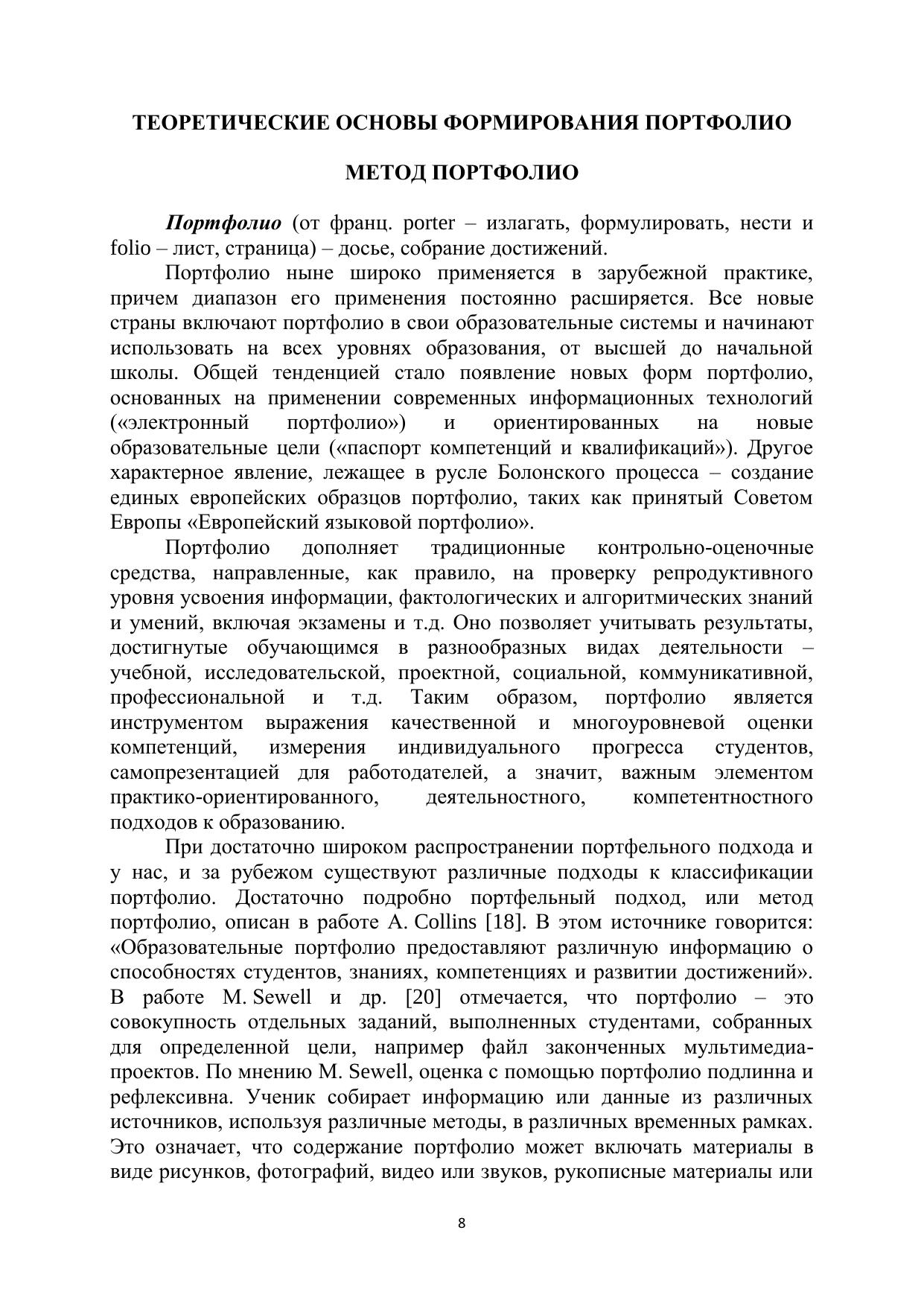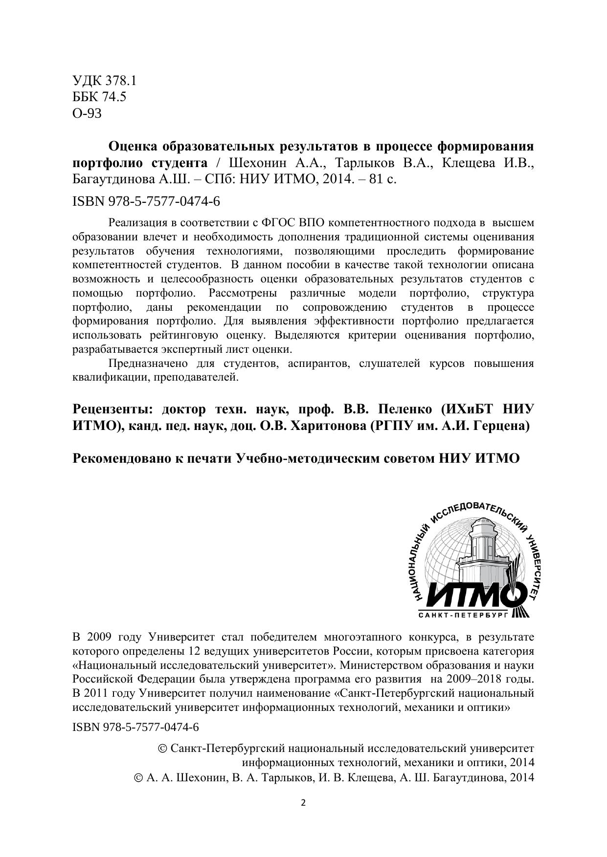 Реализация в соответствии с ФГОС ВПО компетентностного подхода в высшем образовании влечет и необходимость дополнения традиционной системы оценивания результатов обучения технологиями, позволяющими проследить формированиекомпетентностей студентов. В данном пособии в качестве такой технологии описана возможность и целесообразность оценки образовательных результатов студентов с помощью портфолио. Рассмотрены различные модели портфолио, структурапортфолио, даны рекомендации по сопровождению студентов в процессе формирования портфолио. Для выявления эффективности портфолио предлагается использовать рейтинговую оценку. Выделяются критерии оценивания портфолио,разрабатывается экспертный лист оценки. Предназначено для студентов, аспирантов, слушателей курсов повышения квалификации, преподавателей.