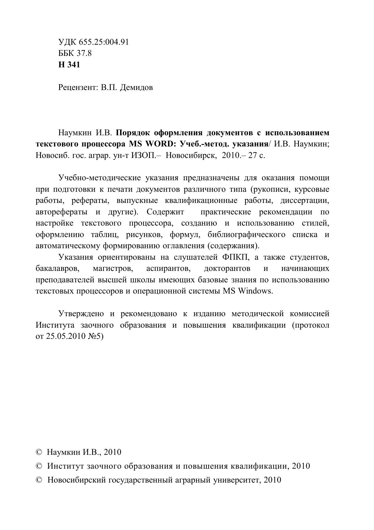 Учебно-методические указания предназначены для оказания помощи при подготовки к печати документов различного типа (рукописи, курсовые работы, рефераты, выпускные квалификационные работы, диссертации, авторефераты и другие). Содержит практические рекомендации по настройке текстового процессора, созданию и использованию стилей, оформлению таблиц, рисунков, формул, библиографического списка и автоматическому формированию оглавления (содержания). Указания ориентированы на слушателей ФПКП, а также студентов, бакалавров, магистров, аспирантов, докторантов и начинающих преподавателей высшей школы имеющих базовые знания по использованию текстовых процессоров и операционной системы MS Windows.