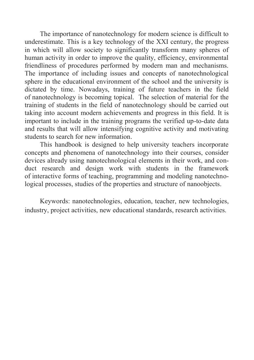 ключевая технология XXI века, прогресс в которой позволит обществу существенно преобразовать многие сферы деятельности человека с целью улучшения качества, экономичности, экологичности операций, производимых современным человеком и механизмами. Важность включения вопросов и понятий сферы нанотехнологии в образовательную среду школы и ВУЗа диктуется временем. Актуальным на сегодняшний день становится подготовка будущих учителей в области