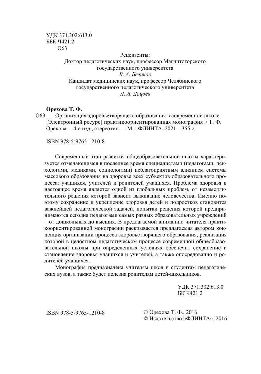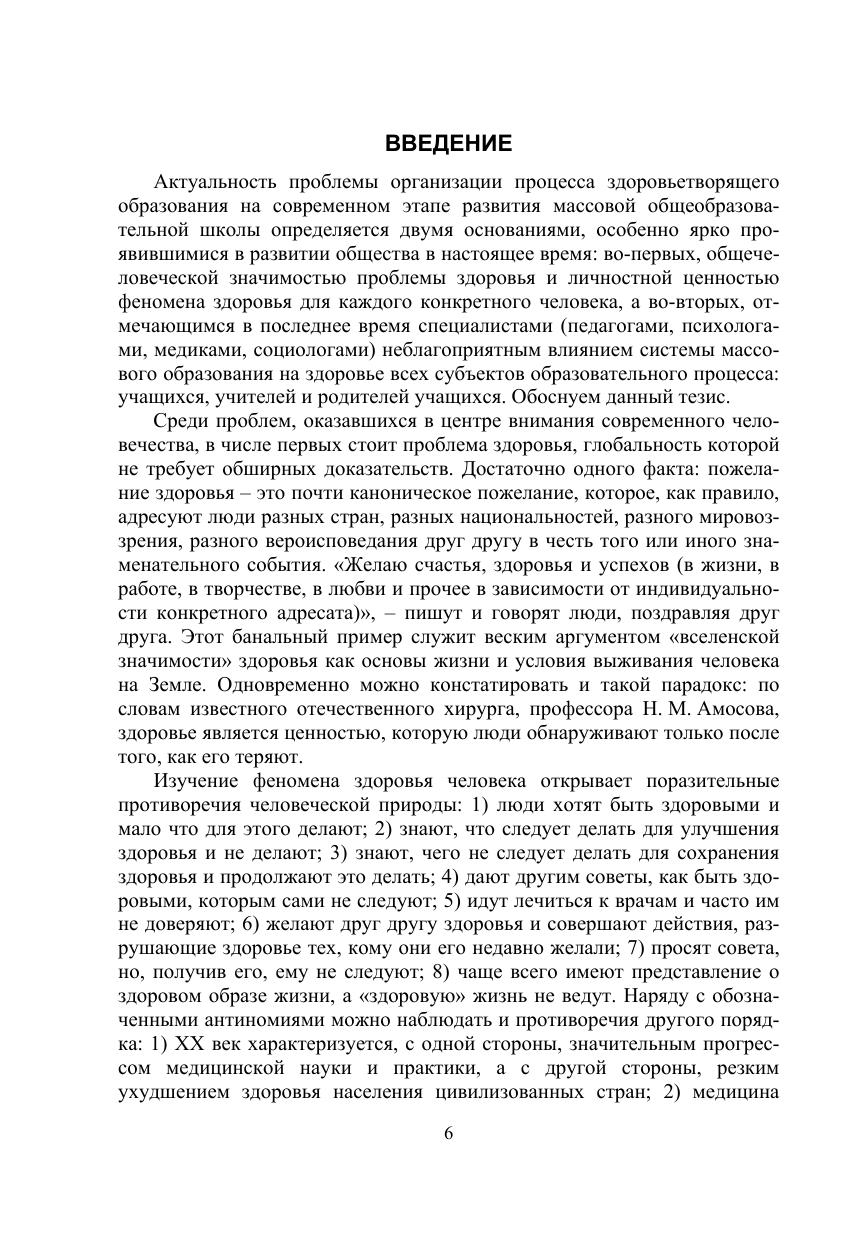 Современный этап развития общеобразовательной школы характеризуется отмечающимся в последнее время специалистами (педагогами, пси-хологами, медиками, социологами) неблагоприятным влиянием системы массового образования на здоровье всех субъектов образовательного про-цесса: учащихся, учителей и родителей учащихся. Проблема здоровья в настоящее время является одной из глобальных проблем, от незамедлительного решения которой зависит выживание человечества. Именно поэтому сохранение и укрепление здоровья детей и подростков становитсяважнейшей педагогической задачей, попытки решения которой предпринимаются сегодня педагогами самых разных образовательных учреждений – от дошкольных до высших. В предлагаемой вниманию читателя практикоориентированной монографии раскрывается предлагаемая автором концепция организации процесса здоровьетворящего образования, реализация которой в целостном педагогическом процессе современной общеобразовательной школы при определенных условиях обеспечит сохранение истановление здоровья учащихся и учителей, а также опосредованно и родителей учащихся. Монография предназначена учителям школ и студентам педагогических вузов, а также будет полезна родителям детей-школьников.