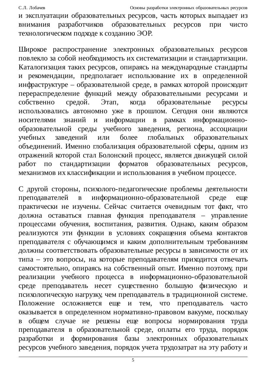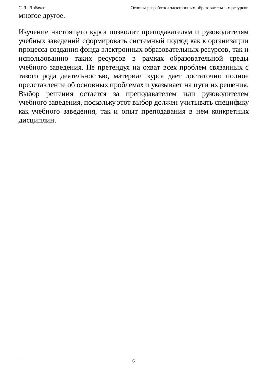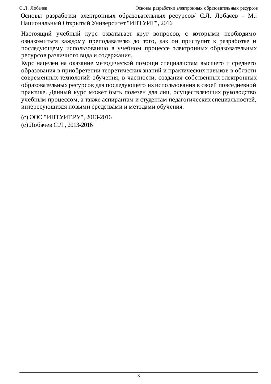 Настоящий учебный курс охватывает круг вопросов, с которыми необходимо ознакомиться каждому преподавателю до того, как он приступит к разработке и последующему использованию в учебном процессе электронных образовательных ресурсов различного вида и содержания. Курс нацелен на оказание методической помощи специалистам высшего и среднего образования в приобретении теоретических знаний и практических навыков в области современных технологий обучения, в частности, создания собственных электронных образовательных ресурсов для последующего их использования в своей повседневной практике. Данный курс может быть полезен для лиц, осуществляющих руководство учебным процессом, а также аспирантам и студентам педагогических специальностей, интересующихся новыми средствами и методами обучения.