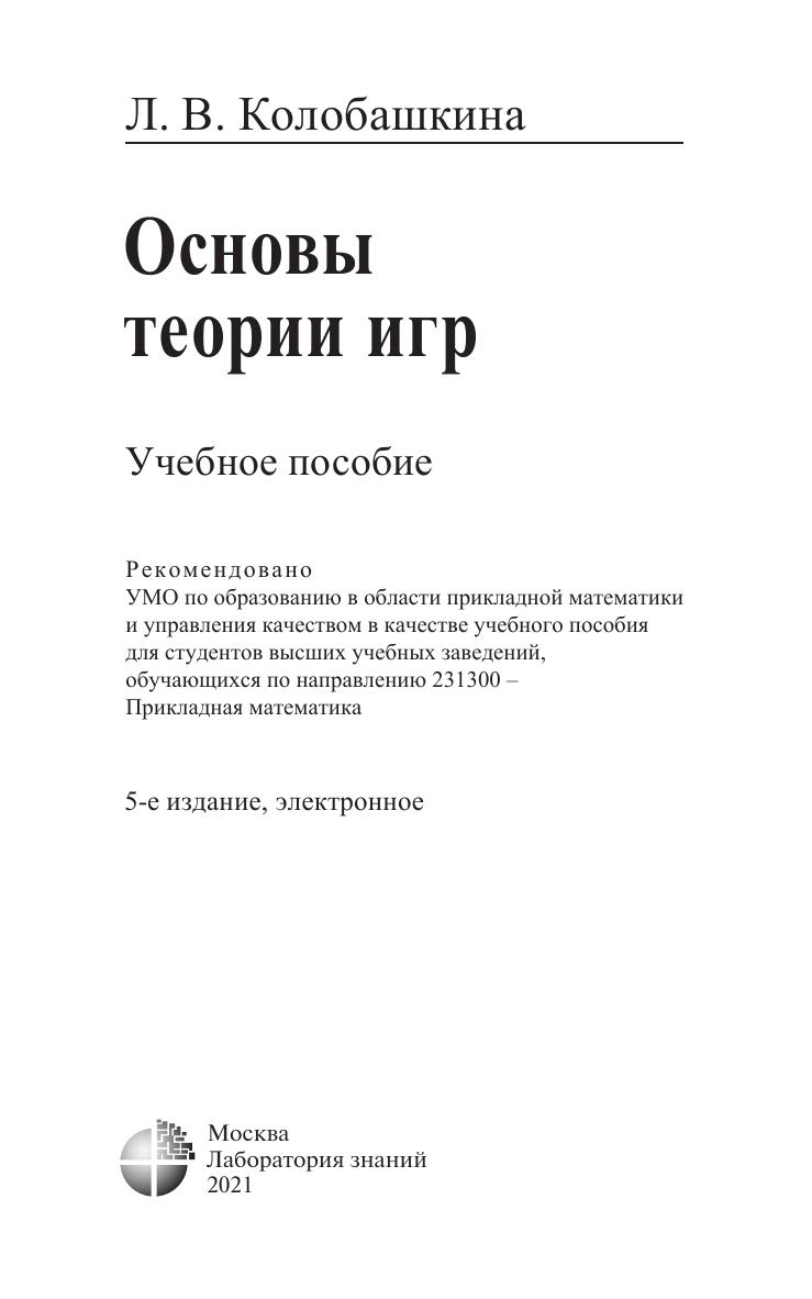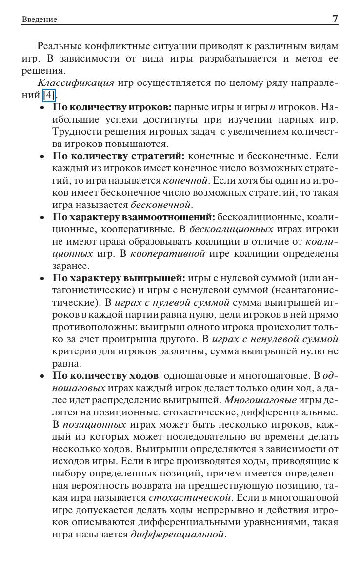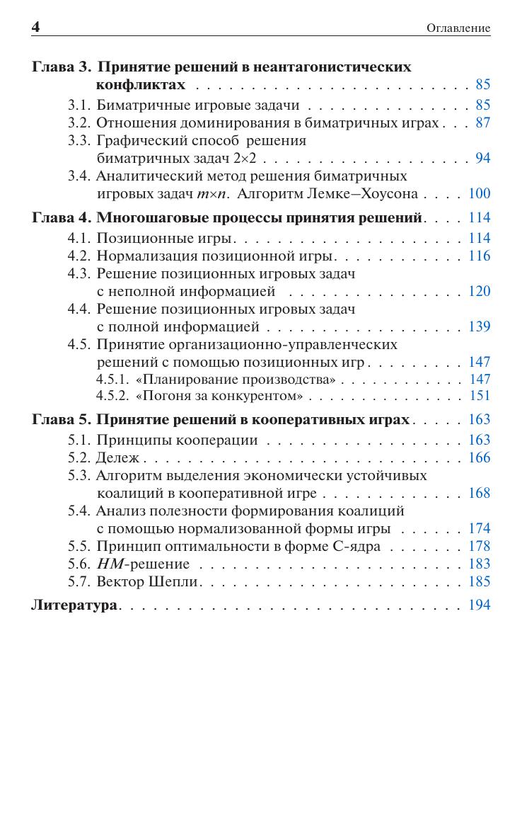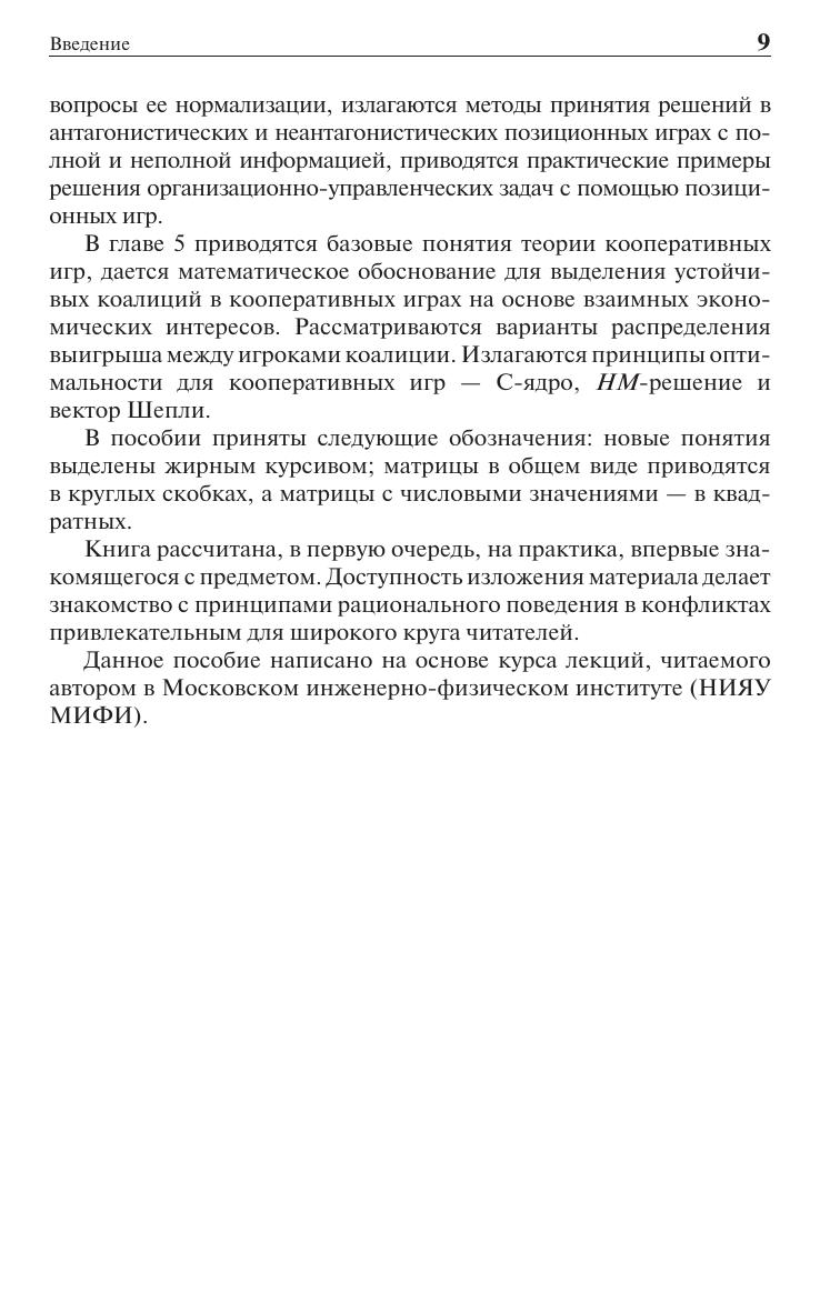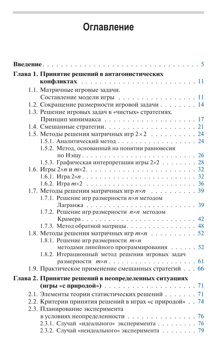 В пособии изложены основные положения и сведения из теории игр, подробно рассмотрены методы выбора оптимальных стратегий поведения в антагонистических и неантагонистических конфликтах. Приведены критерии определения оптимальных стратегий в «играх с природой». Рассмотрены методы принятия решений в антагонистических и неантагонистических позиционных играх с полной и неполной информацией. Рассмотрены принципы оптимальности для кооперативных игр. Все представленные методы сопровождаются подробно рассмотренными примерами. Доступность изложения материала делает знакомство с принципами рационального поведения в конфликтах привлекательным для широкого круга читателей. Пособие предназначено для студентов высших учебных заведений, обучающихся по специальностям «Прикладная математика», «Прикладная математика и информатика», «Математические методы в экономике».