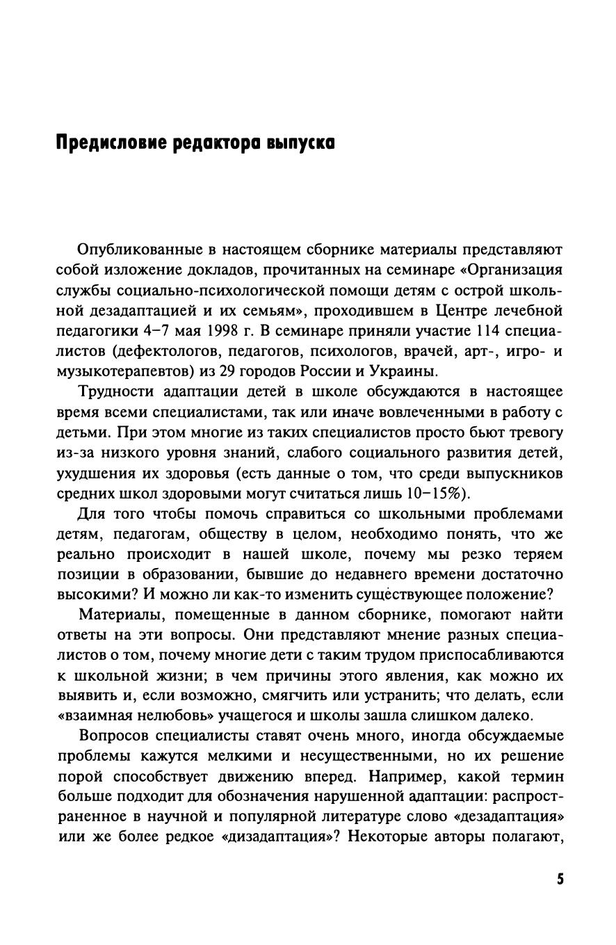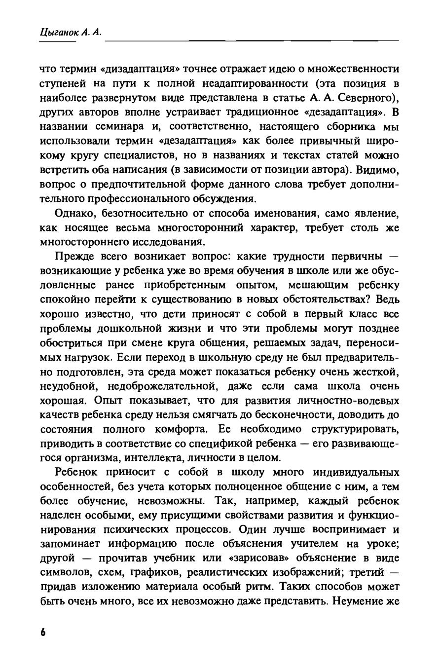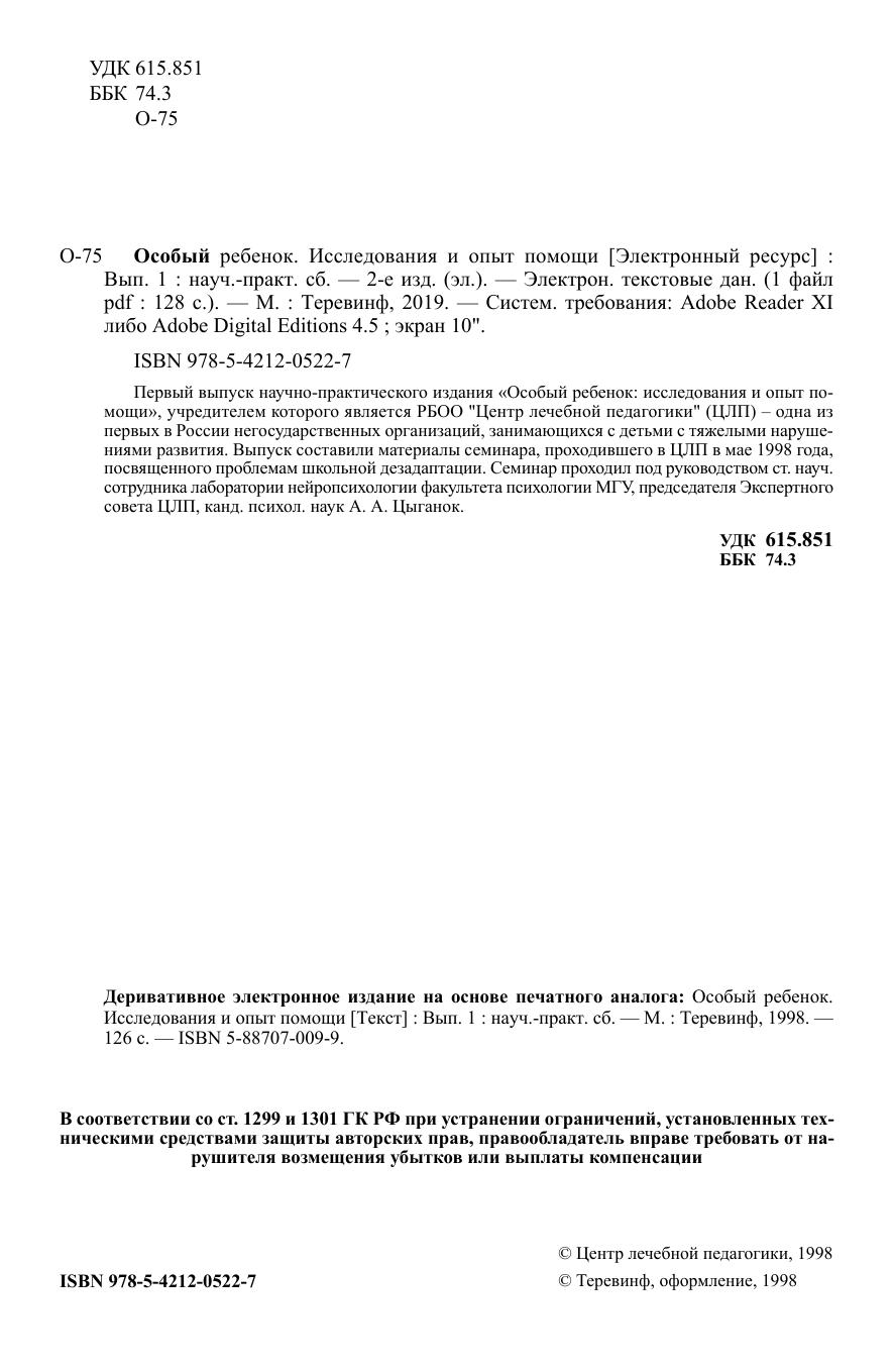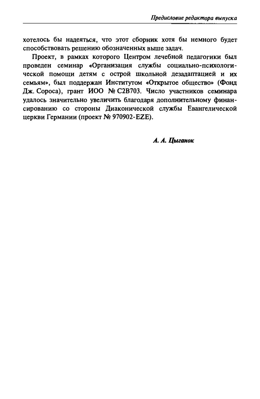 Первый выпуск научно-практического издания «Особый ребенок: исследования и опыт помощи», учредителем которого является РБОО «Центр лечебной педагогики» (ЦЛП) — одна из первых в России негосударственных организаций, занимающихся с детьми с тяжелыми нарушениями развития. Выпуск составили материалы семинара, проходившего в ЦЛП в мае 1998 года, посвященного проблемам школьной дезадаптации. Семинар проходил под руководством ст. науч. сотрудника лаборатории нейропсихологии факультета психологии МГУ, председателя Экспертного совета ЦЛП, канд. психол. наук А. А. Цыганок.
