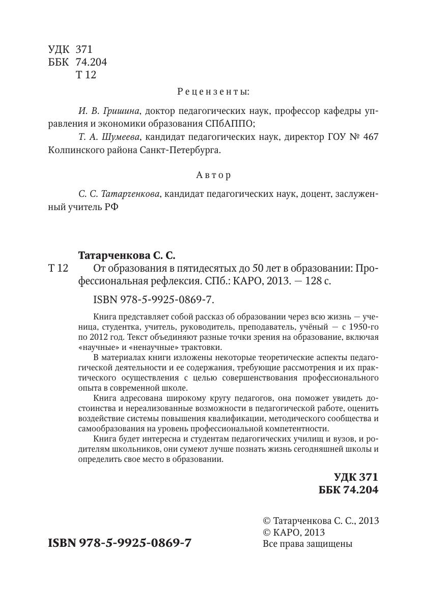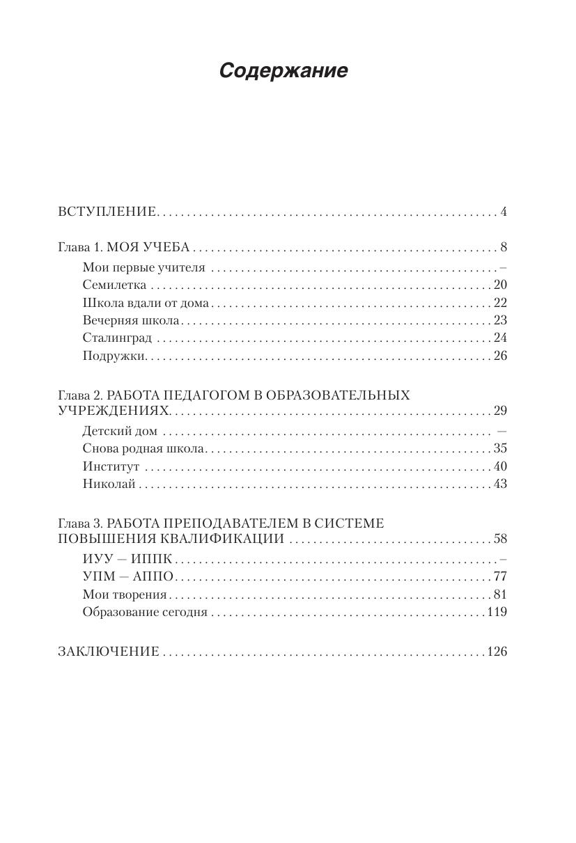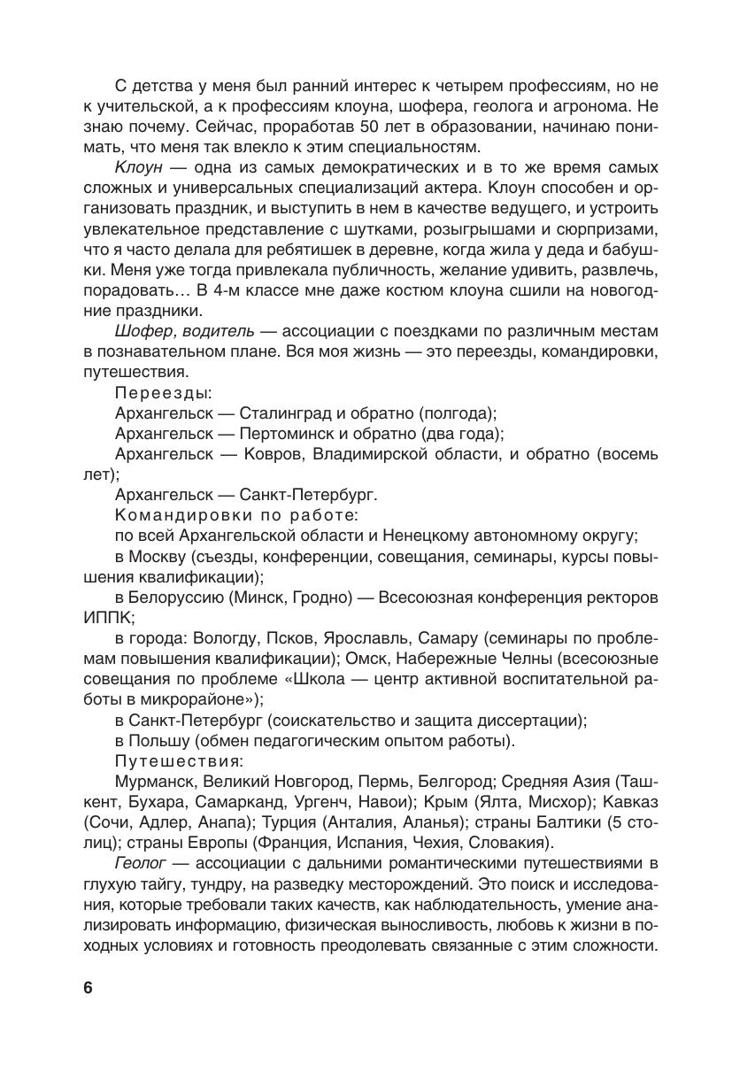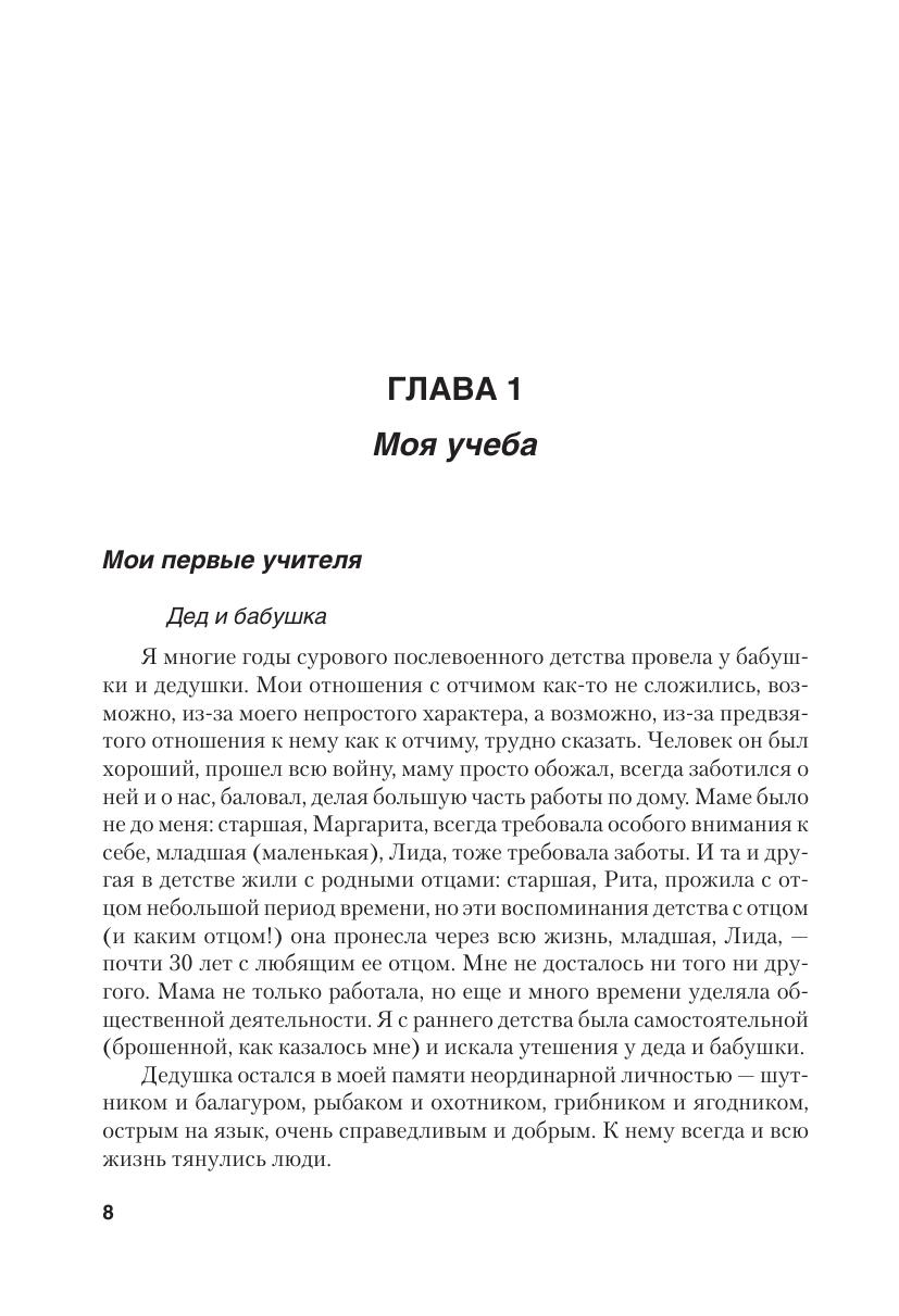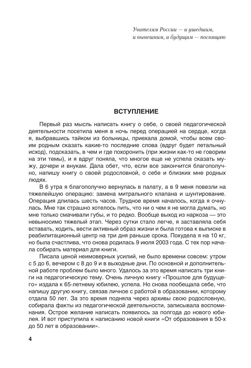 Книга представляет собой рассказ об образовании через всю жизнь — ученица, студентка, учитель, руководитель, преподаватель, учёный — с 1950-го по 2012 год. Текст объединяют разные точки зрения на образование, включая «научные» и «ненаучные» трактовки. В материалах книги изложены некоторые теоретические аспекты педагогической деятельности и ее содержания, требующие рассмотрения и их практического осуществления с целью совершенствования профессионального опыта в современной школе. Книга адресована широкому кругу педагогов, она поможет увидеть достоинства и нереализованные возможности в педагогической работе, оценить воздействие системы повышения квалификации, методического сообщества и самообразования на уровень профессиональной компетентности. Книга будет интересна и студентам педагогических училищ и вузов, и родителям школьников, они сумеют лучше познать жизнь сегодняшней школы и определить свое место в образовании.
