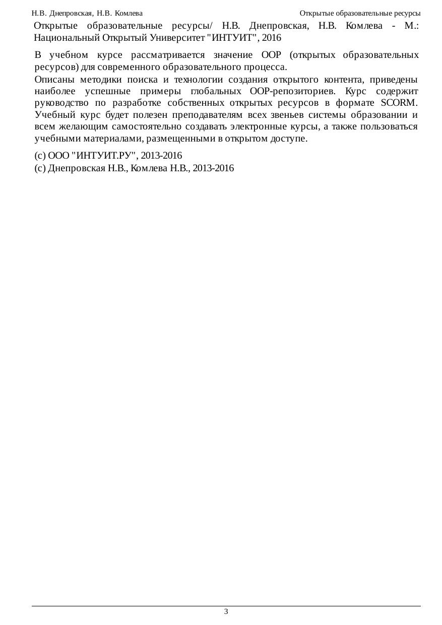 В учебном курсе рассматривается значение ООР (открытых образовательных ресурсов) для современного образовательного процесса. Описаны методики поиска и технологии создания открытого контента, приведены наиболее успешные примеры глобальных ООР-репозиториев. Курс содержит руководство по разработке собственных открытых ресурсов в формате SCORM. Учебный курс будет полезен преподавателям всех звеньев системы образовании и всем желающим самостоятельно создавать электронные курсы, а также пользоваться учебными материалами, размещенными в открытом доступе.