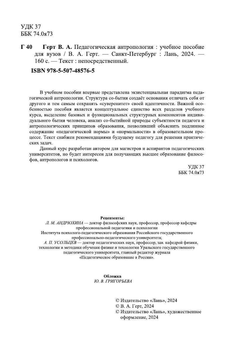 В учебном пособии впервые представлена экзистенциальная парадигма педагогической антропологии. Структура со-бытия создаёт основания отличать себя от другого и тем самым сохранять «суверенитет» своей идентичности. Важной особенностью пособия является концептуальное единство всех разделов учебного курса, выделение базовых и функциональных структурных компонентов индивидуального бытия человека, анализ со-бытийной природы субъектности педагога и антропологических принципов образования, позволивший объяснить подлинное содержание «педагогической нормы» и «нормальности» в образовательном процессе. Текст снабжен рекомендациями будущему педагогу для решения практических задач. Данный курс разработан автором для магистров и аспирантов педагогических университетов, но будет интересен для получающих высшее образование философов, антропологов и психологов.