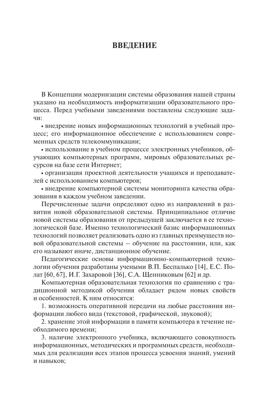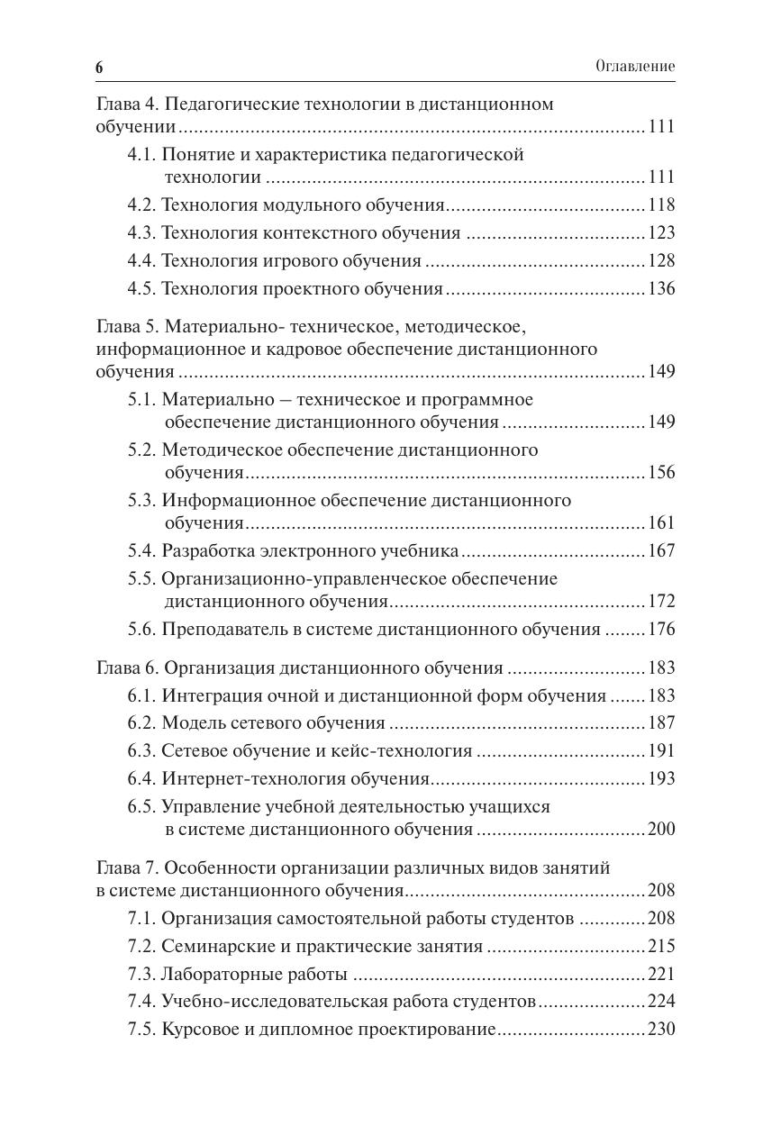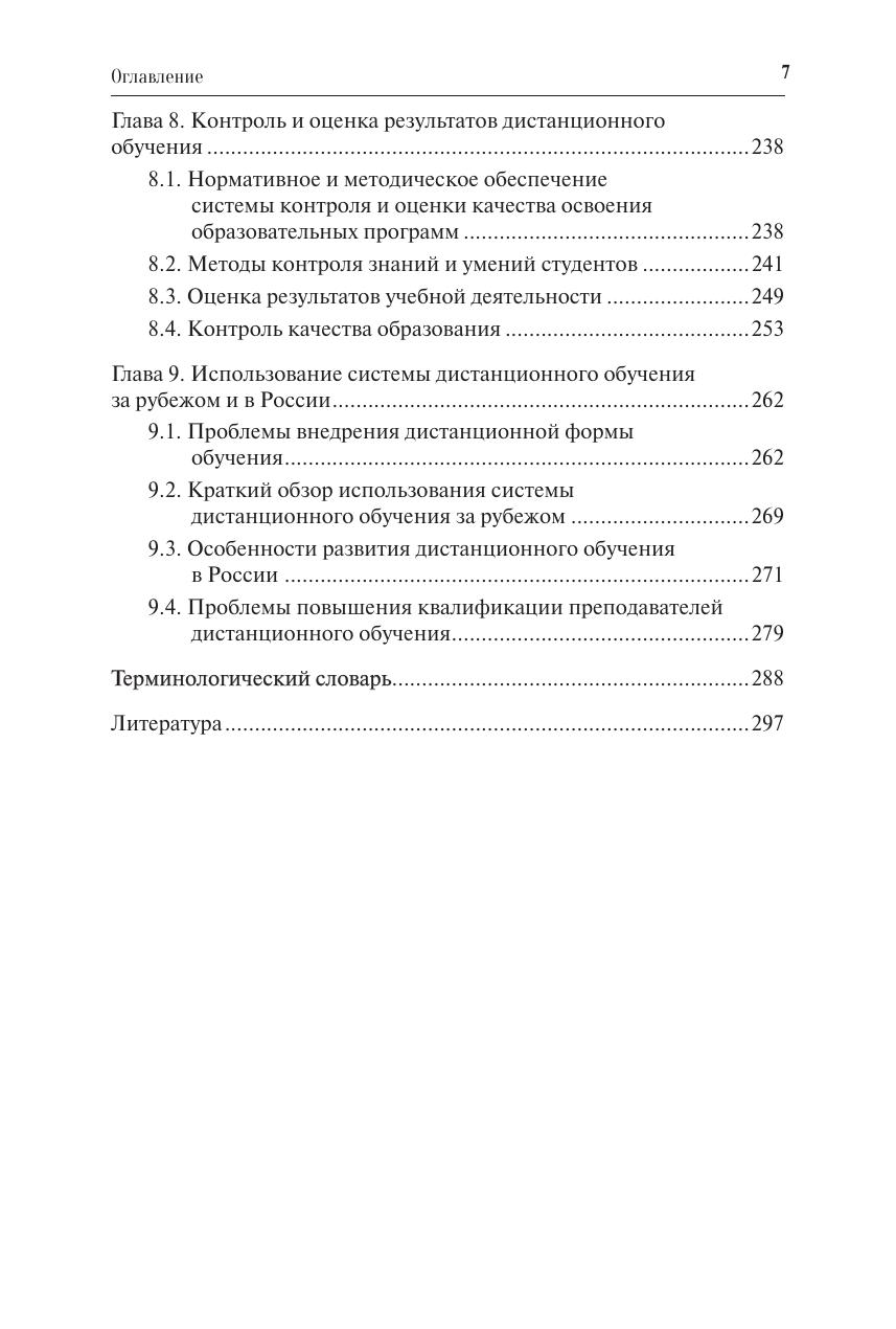 Раскрываются различные концепции обучения, теоретические основы дистанционного обучения (ДО), вопросы проектирования образовательного процесса, характеристики различных педагогических технологий, проблемы материально-технического, программного, информационно-методического и кадрового обеспечения ДО, рассматриваются различные модели ДО. Особое внимание уделяется вопросам организации различных видов занятий, контроля и оценки результатов обучения, дается краткий обзор использования системы ДО за рубежом и в России. Текстовой материал дополнен графическими моделями. Приведен терминологический словарь по проблематике дистанционного обучения. Для преподавателей вузов и колледжей, учителей школ и руководителей учебными заведениями различного уровня. Она может быть полезной для студентов педагогических вузов и работников системы повышения квалификации специалистов.