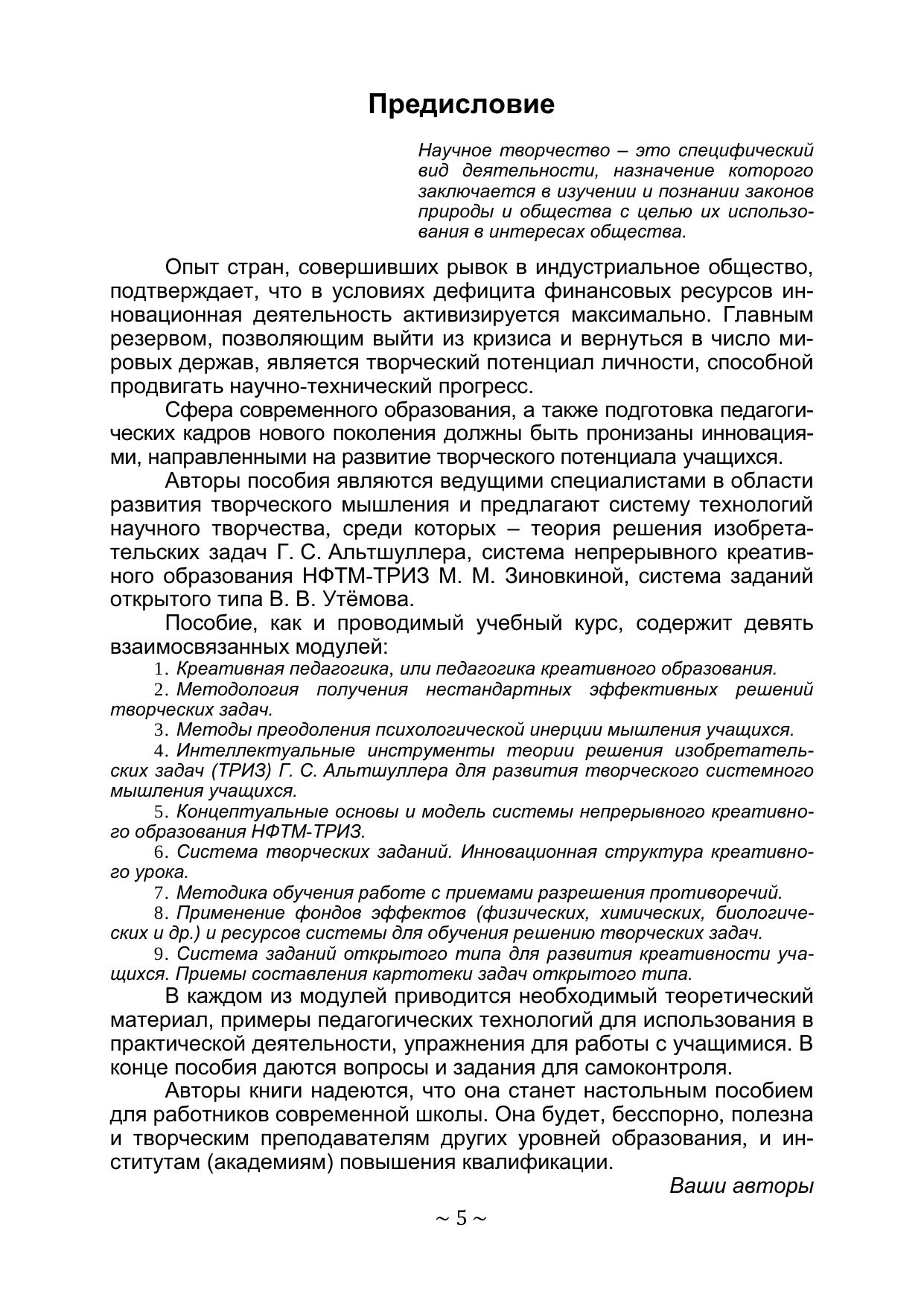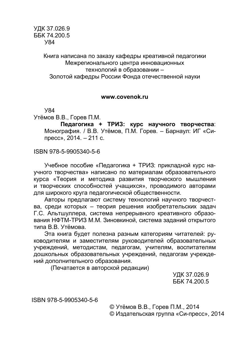 Учебное пособие «Педагогика + ТРИЗ: прикладной курс научного творчества» написано по материалам образовательного курса «Теория и методика развития творческого мышления и творческих способностей учащихся», проводимого авторами для широкого круга педагогической общественности. Авторы предлагают систему технологий научного творчества, среди которых – теория решения изобретательских задач Г.С. Альтшуллера, система непрерывного креативного образования НФТМ-ТРИЗ М.М. Зиновкиной, система заданий открытого типа В.В. Утёмова. Эта книга будет полезна разным категориям читателей: руководителям и заместителям руководителей образовательных учреждений, методистам, педагогам, учителям, воспитателям дошкольных образовательных учреждений, педагогам учреждений дополнительного образования.