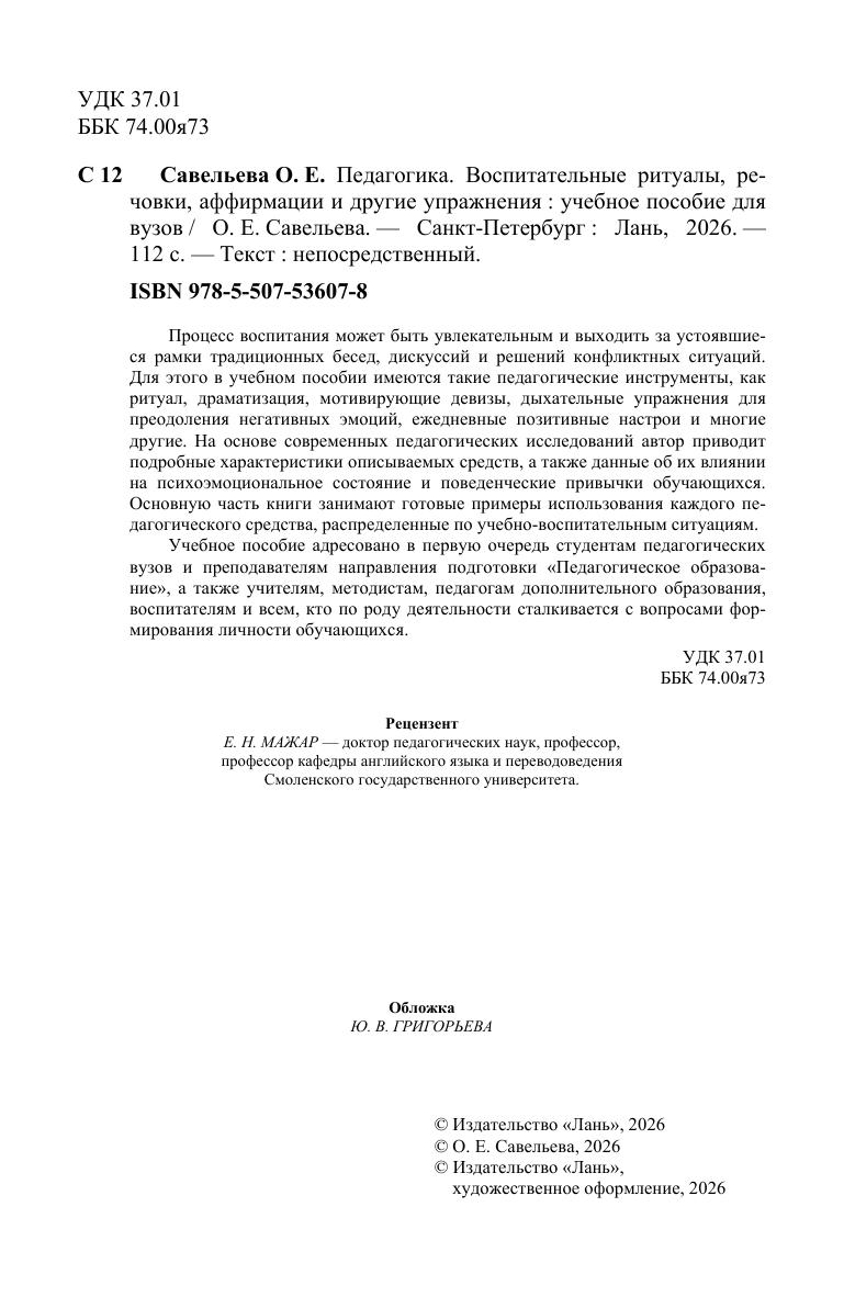 Процесс воспитания может быть увлекательным и выходить за устоявшиеся рамки традиционных бесед, дискуссий и решений конфликтных ситуаций. Для этого в учебном пособии имеются такие педагогические инструменты, как ритуал, драматизация, мотивирующие девизы, дыхательные упражнения для преодоления негативных эмоций, ежедневные позитивные настрои и многие другие. На основе современных педагогических исследований автор приводит подробные характеристики описываемых средств, а также данные об их влиянии на психоэмоциональное состояние и поведенческие привычки обучающихся. Основную часть книги занимают готовые примеры использования каждого педагогического средства, распределенные по учебно-воспитательным ситуациям. Учебное пособие адресовано в первую очередь студентам педагогических вузов и преподавателям направления подготовки «Педагогическое образование», а также учителям, методистам, педагогам дополнительного образования, воспитателям и всем, кто по роду деятельности сталкивается с вопросами формирования личности обучающихся.