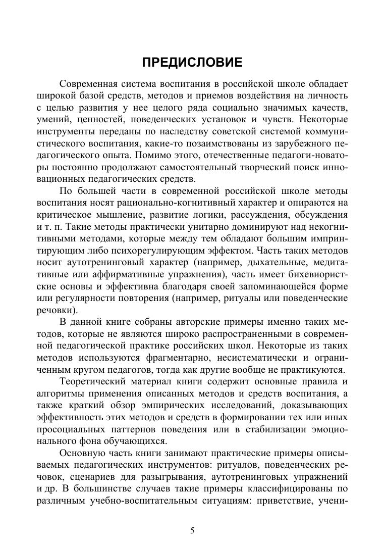 Процесс воспитания может быть увлекательным и выходить за устоявшиеся рамки традиционных бесед, дискуссий и решений конфликтных ситуаций. Для этого в учебном пособии имеются такие педагогические инструменты, как ритуал, драматизация, мотивирующие девизы, дыхательные упражнения для преодоления негативных эмоций, ежедневные позитивные настрои и многие другие. Автор приводит подробные характеристики описываемых средств, а также данные об их влиянии на психоэмоциональное состояние и поведенческие привычки обучающихся. Основную часть книги занимают готовые примеры использования каждого из педагогических средств, распределенные по учебно-воспитательным ситуациям. Соответствует современным требованиям Федерального государственного образовательного стандарта среднего профессионального образования и профессиональным квалификационным требованиям. Учебное пособие адресовано как студентам организаций среднего профессионального образования педагогического профиля, так и преподавателям направления подготовки «Педагогическое образование», а также учителям, методистам, педагогам дополнительного образования, воспитателям и всем, кто интересуется вопросами воспитания и формирования личности обучающихся.