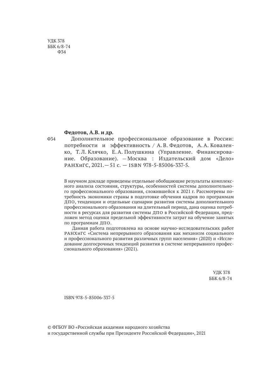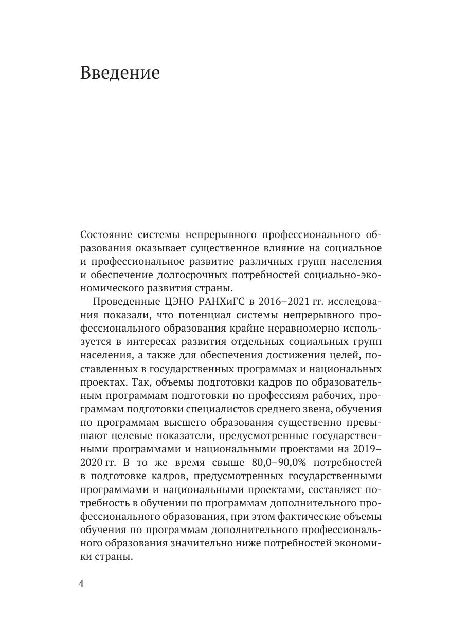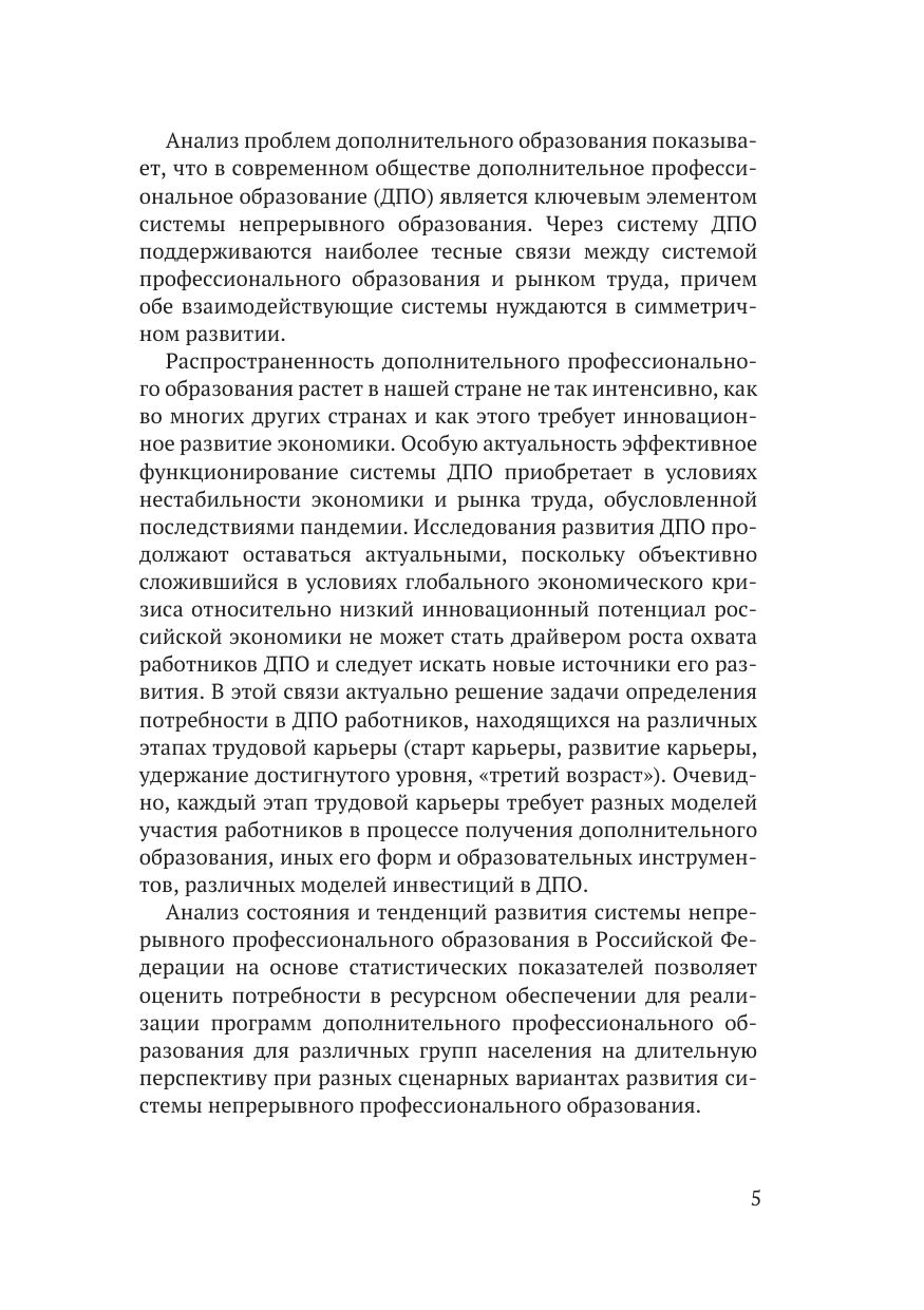 В научном докладе приведены отдельные обобщающие результаты комплексного анализа состояния, структуры, особенностей системы дополнительного профессионального образования, сложившейся к 2021 г. Рассмотрены потребность экономики страны в подготовке обучения кадров по программам ДПО, тенденции и отдельные сценарии развития системы дополнительного профессионального образования на длительный период, дана оценка потребности в ресурсах для развития системы ДПО в Российской Федерации, предложен метод оценки предельной эффективности затрат на обучение занятых по программам ДПО. Данная работа подготовлена на основе научно-исследовательских работ РАНХиГС «Система непрерывного образования как механизм социального и профессионального развития различных групп населения» (2020) и «Исследование долгосрочных тенденций развития в системе непрерывного профессионального образования» (2021).