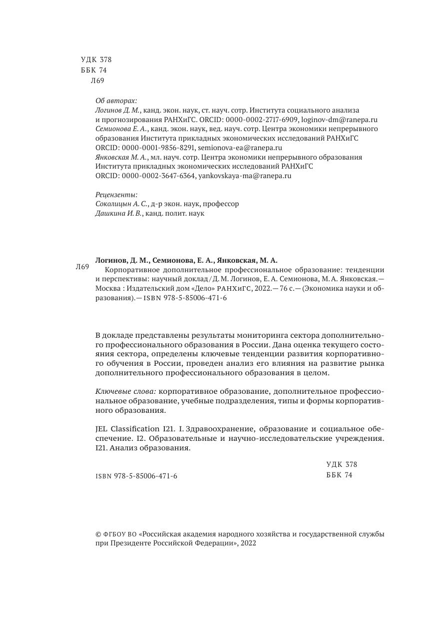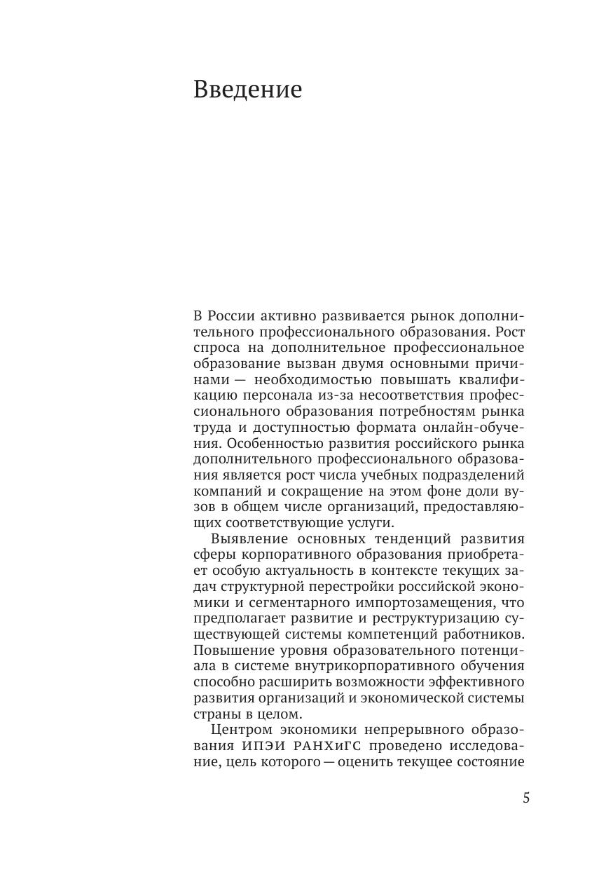 В докладе представлены результаты мониторинга сектора дополнительного профессионального образования в России. Дана оценка текущего состояния сектора, определены ключевые тенденции развития корпоративного обучения в России, проведен анализ его влияния на развитие рынка дополнительного профессионального образования в целом. Ключевые слова: корпоративное образование, дополнительное профессиональное образование, учебные подразделения, типы и формы корпоративного образования. JEL Classification I21. I. Здравоохранение, образование и социальное обеспечение. I2. Образовательные и научно-исследовательские учреждения. I21. Анализ образования.