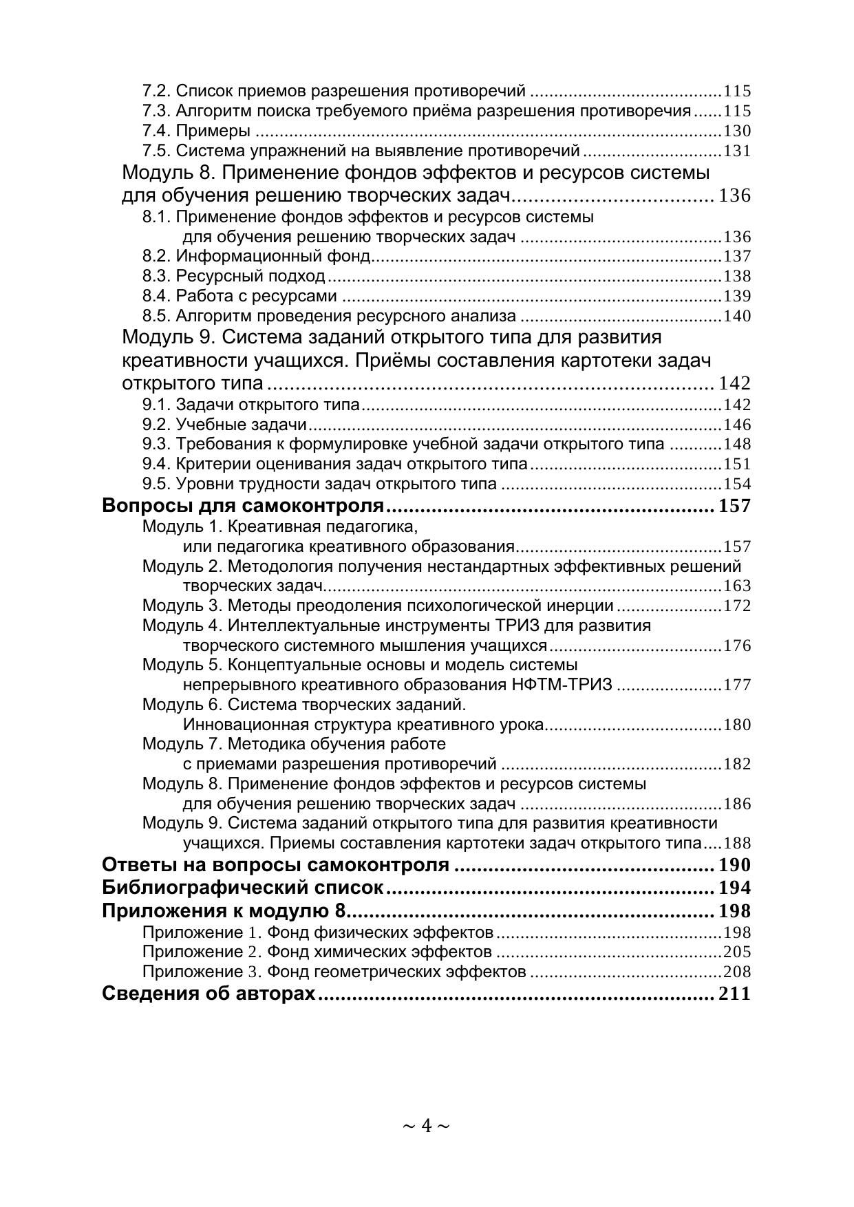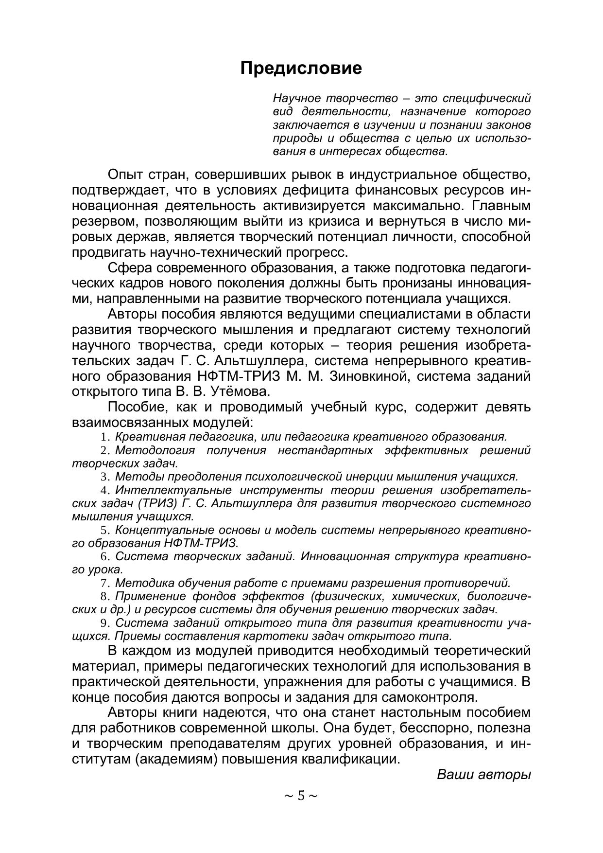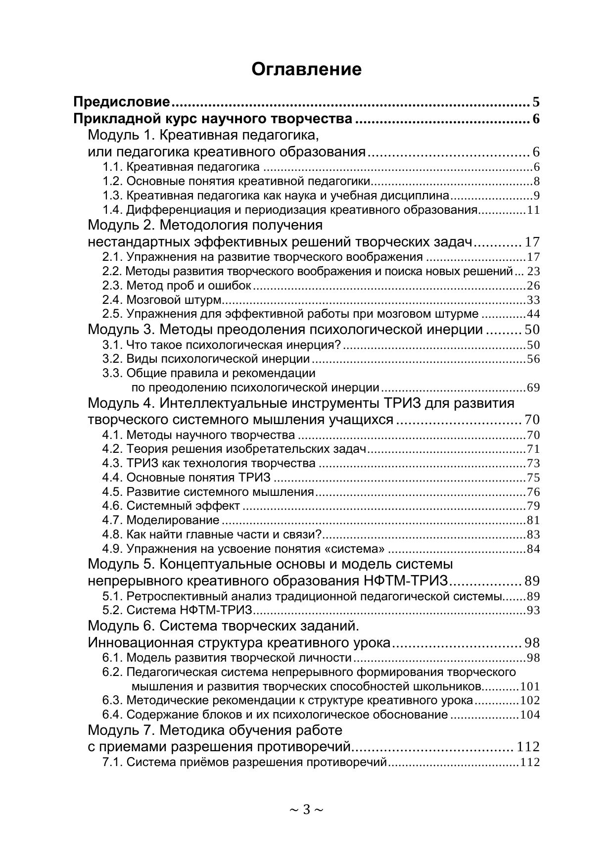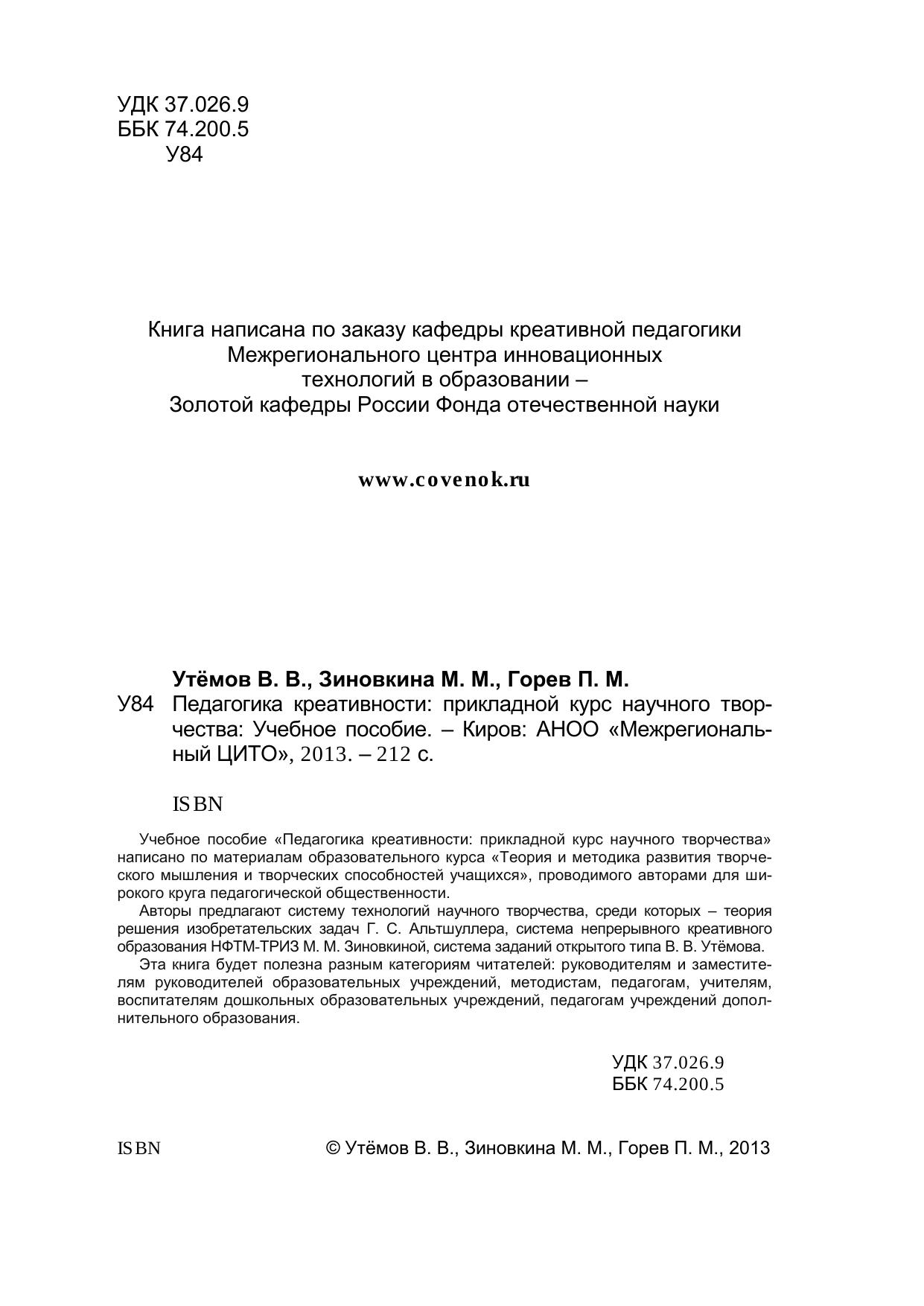 Учебное пособие «Педагогика креативности: прикладной курс научного творчества» написано по материалам образовательного курса «Теория и методика развития творческого мышления и творческих способностей учащихся», проводимого авторами для широкого круга педагогической общественности. Авторы предлагают систему технологий научного творчества, среди которых – теория решения изобретательских задач Г. С. Альтшуллера, система непрерывного креативного образования НФТМ-ТРИЗ М. М. Зиновкиной, система заданий открытого типа В. В. Утёмова. Эта книга будет полезна разным категориям читателей: руководителям и заместителям руководителей образовательных учреждений, методистам, педагогам, учителям, воспитателям дошкольных образовательных учреждений, педагогам учреждений дополнительного образования