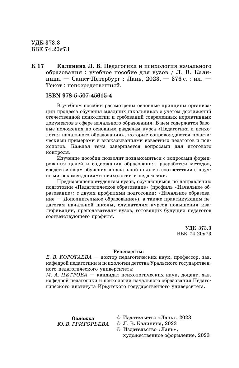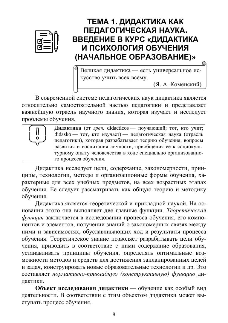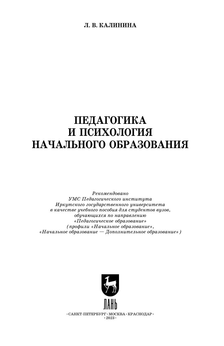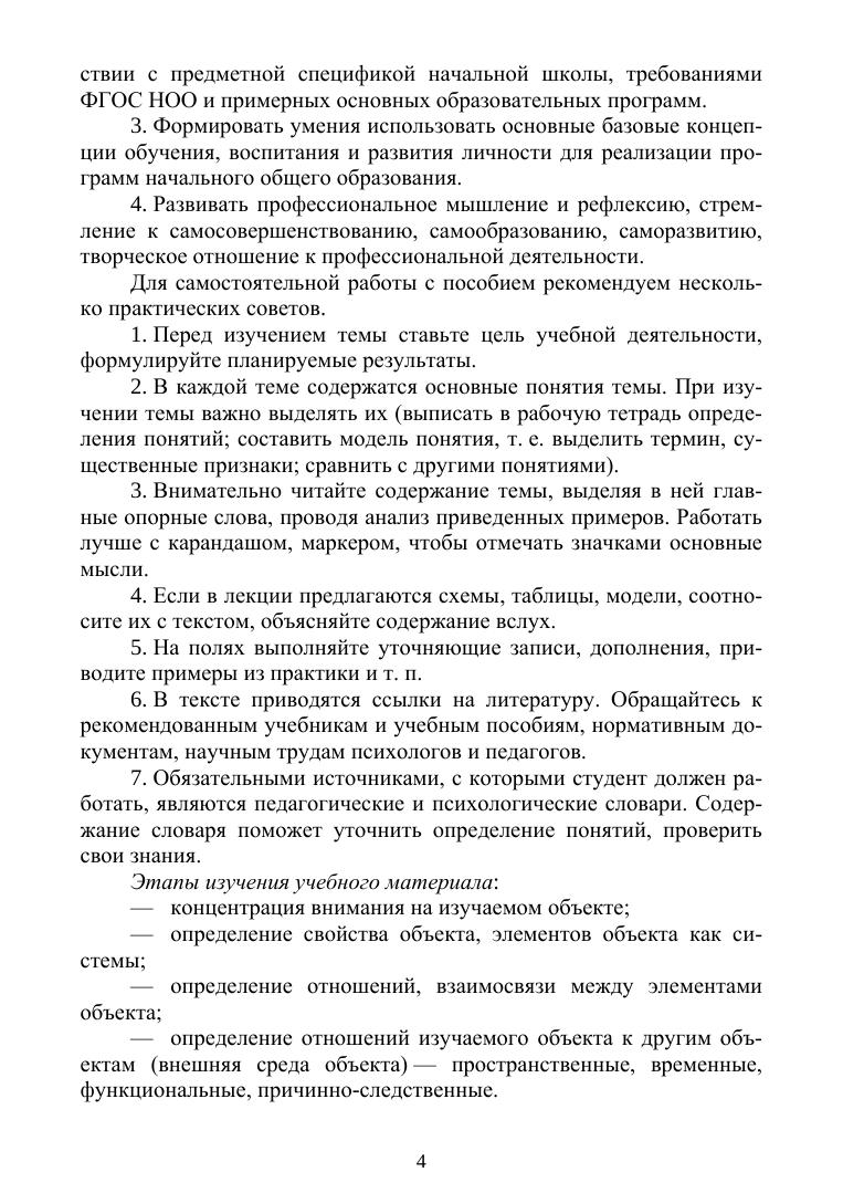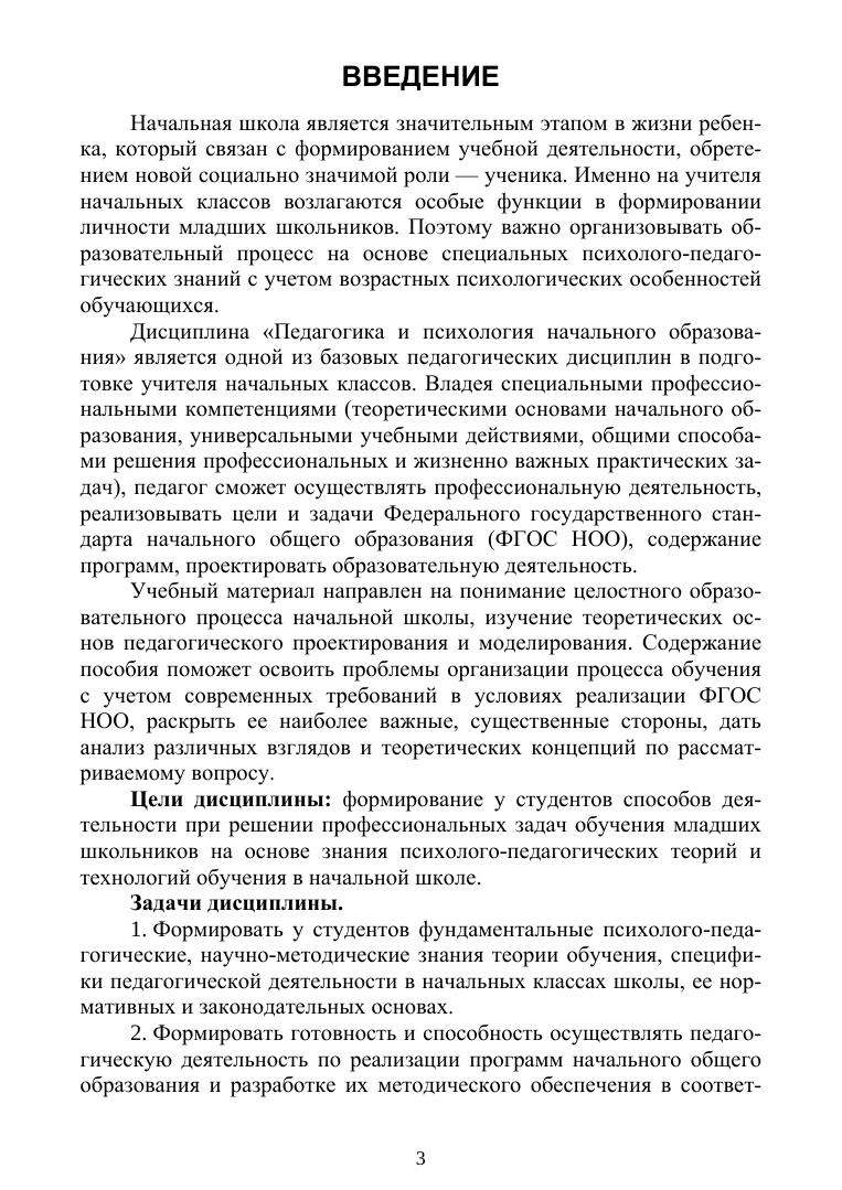 В учебном пособии рассмотрены основные принципы организации процесса обучения младших школьников с учетом достижений отечественной психологии и требований современных нормативных документов в сфере начального образования. В нем содержатся базовые положения по основным разделам курса «Педагогика и психология начального образования», которые сопровождаются практическими примерами и высказываниями известных педагогов и психологов. Каждая тема завершается вопросами для итогового контроля. Изучение пособия позволит познакомиться с вопросами формирования целей и содержания образования, разработки методов, средств и форм обучения в начальной школе в соответствии с научными рекомендациями психологии и педагогики. Предназначено студентам вузов, обучающимся по направлению подготовки «Педагогическое образование» (профиль «Начальное образование», с двумя профилями подготовки: «Начальное образование — Дополнительное образование»), а также практикующим педагогам начальной школы, слушателям курсов повышения квалификации, преподавателям вузов, готовящих будущих педагогов соответствующего профиля.