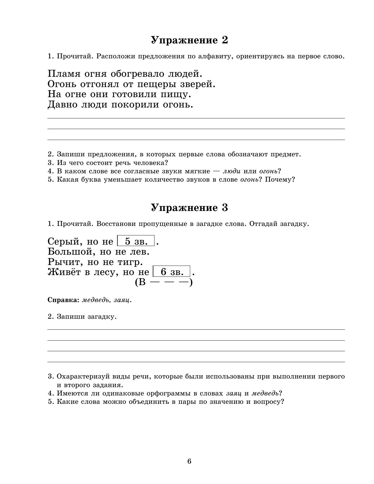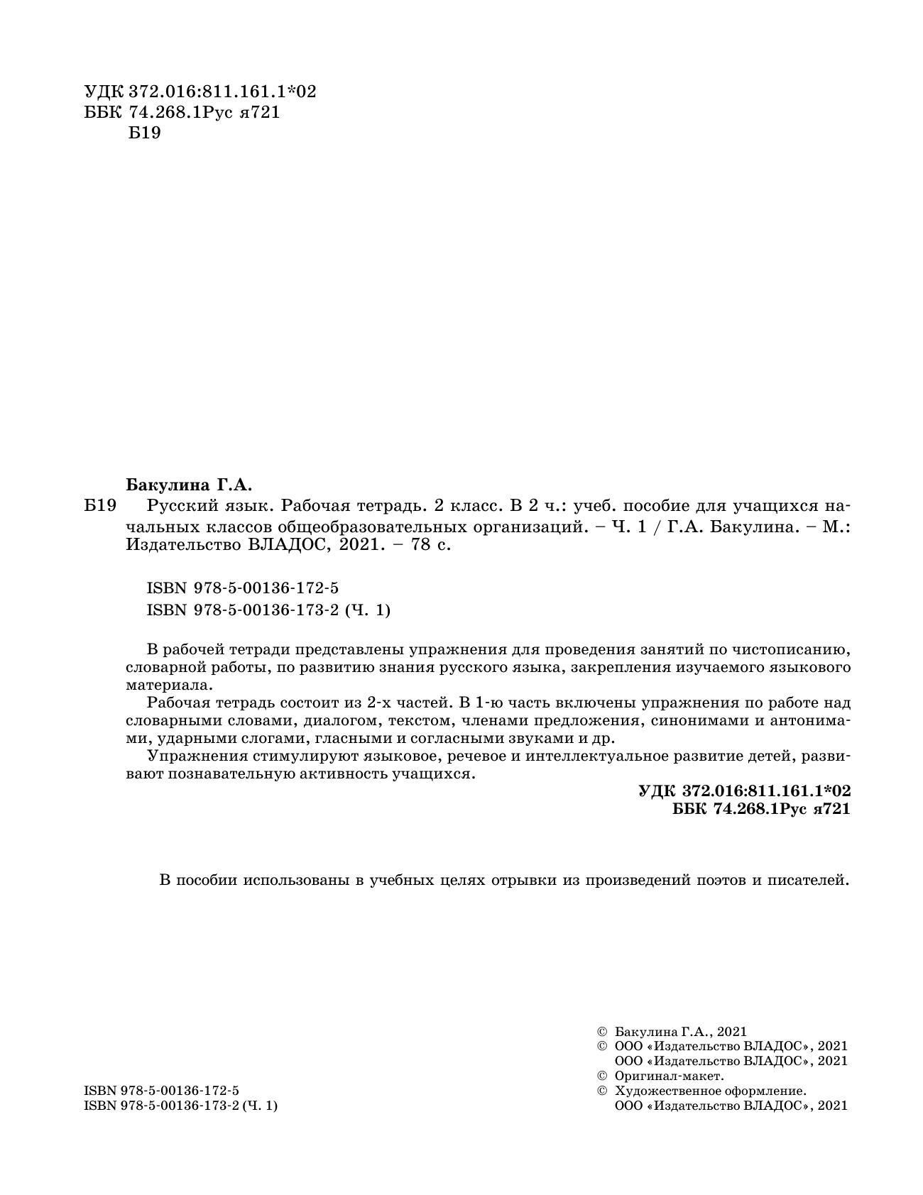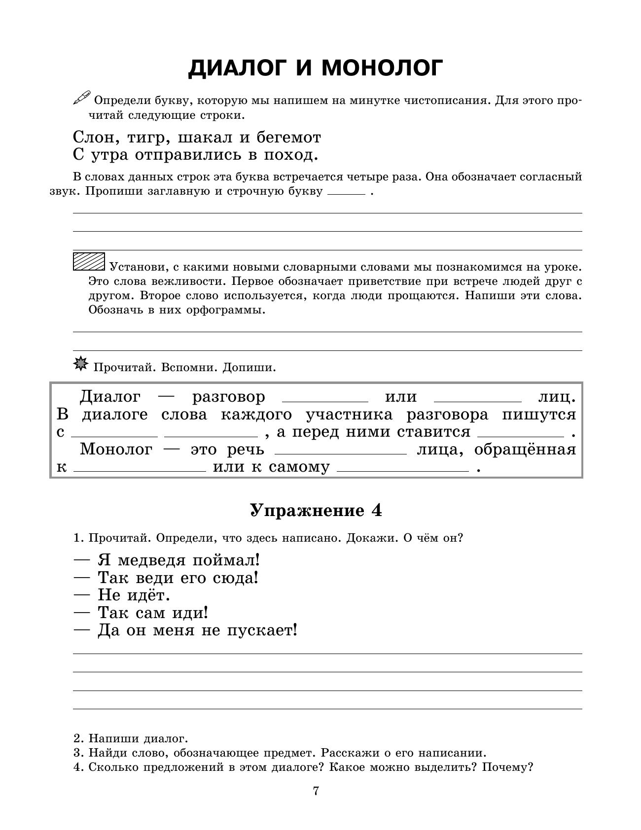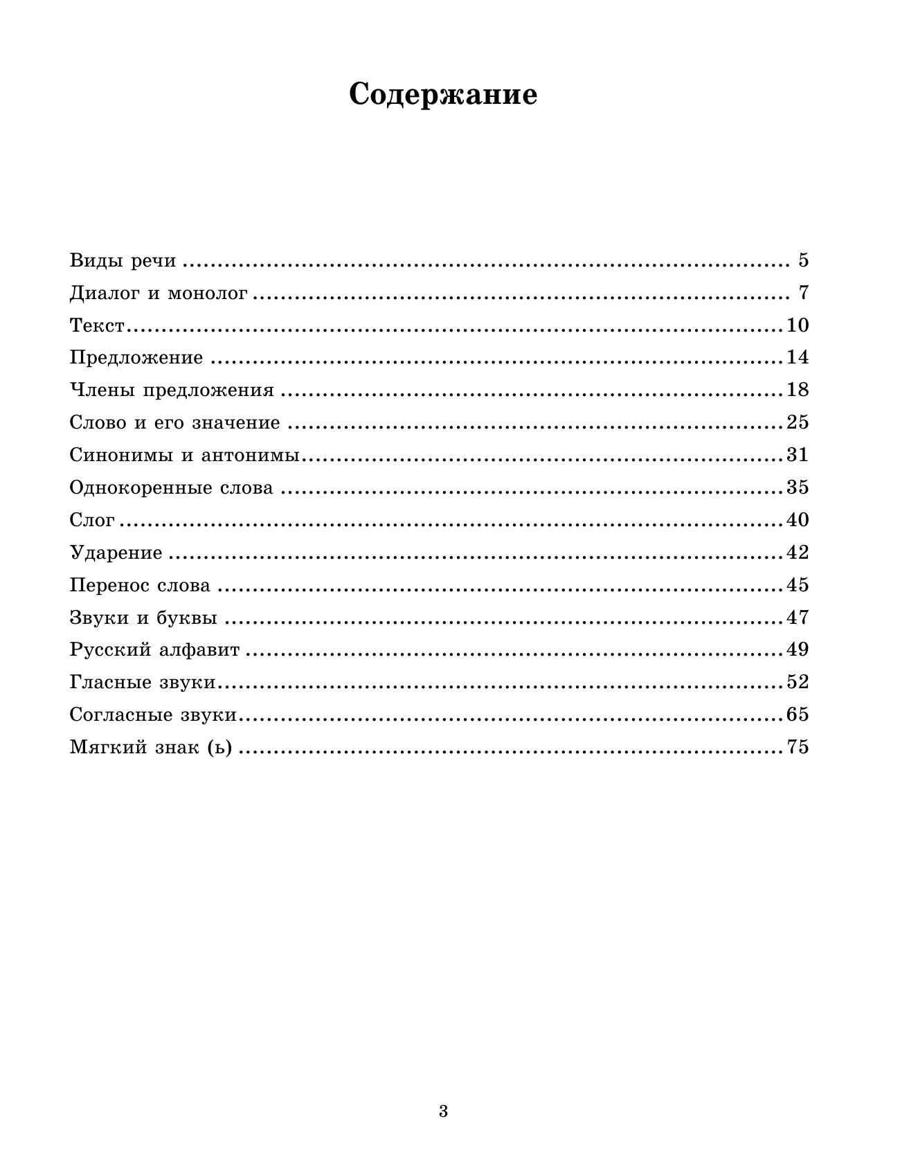 В рабочей тетради представлены упражнения для проведения занятий по чистописанию, словарной работы, по развитию знания русского языка, закрепления изучаемого языкового материала. Рабочая тетрадь состоит из 2-х частей. В 1-ую часть включены упражнения по работе над словарными словами, диалогом, текстом, членами предложения, синонимами и антонимами, ударными слогами, гласными и согласными звуками и др. Упражнения стимулируют языковое, речевое и интеллектуальное развитие детей, развивают познавательную активность учащихся.
