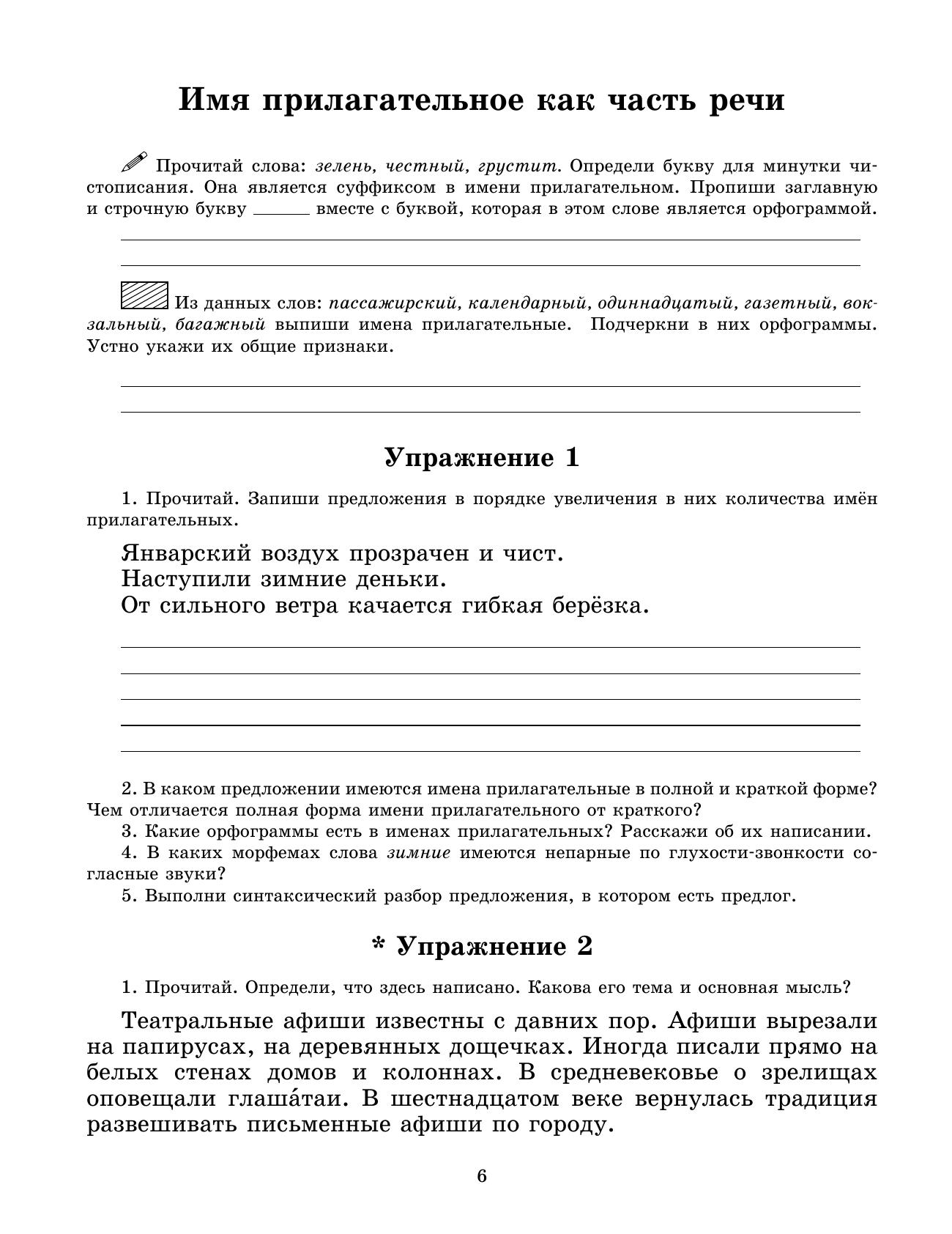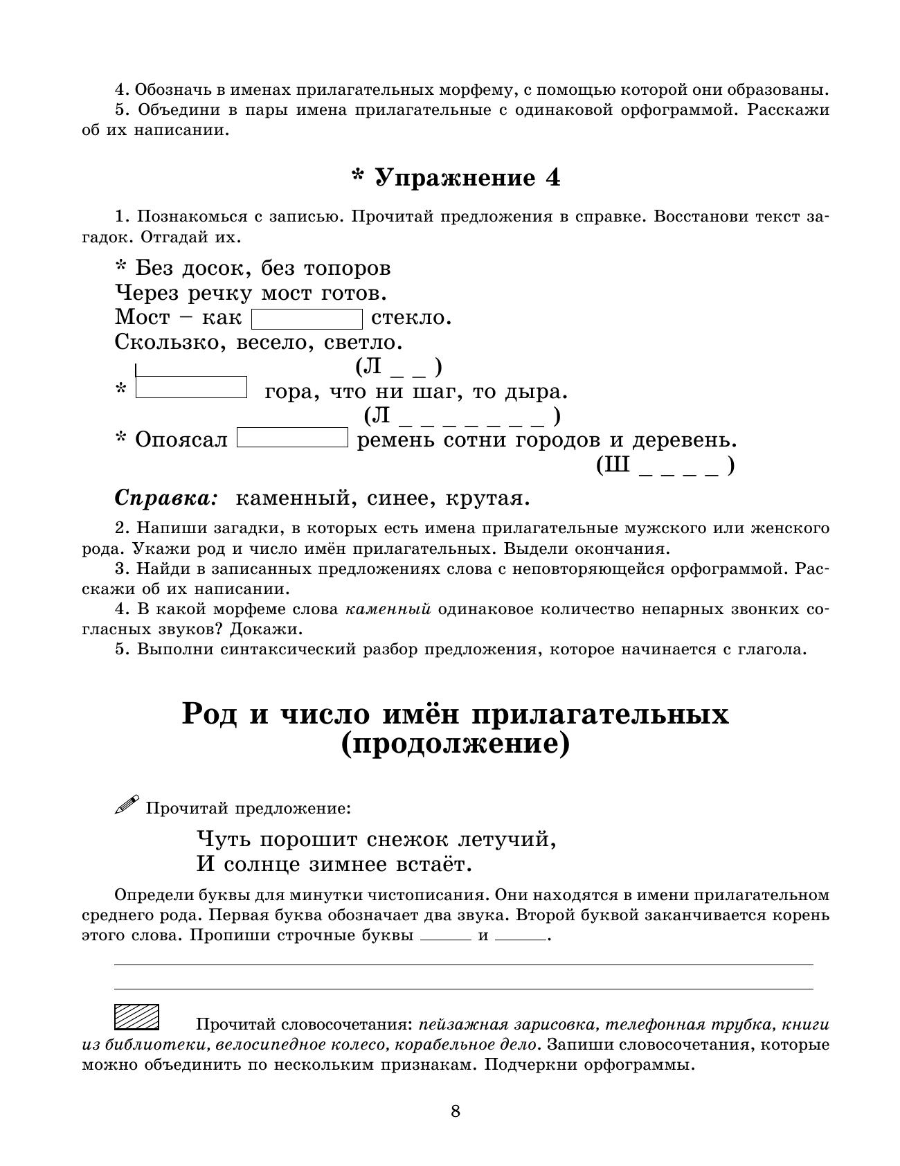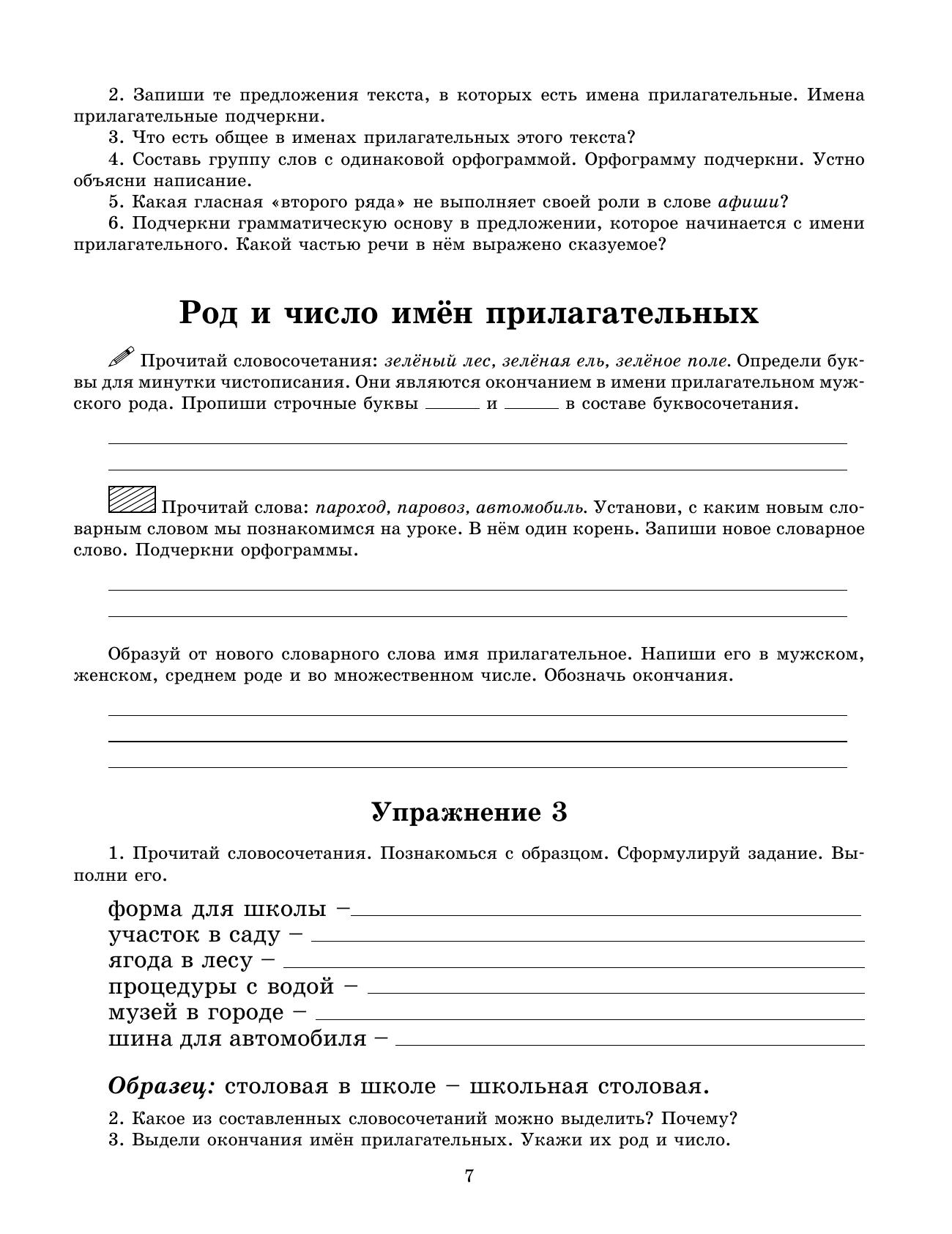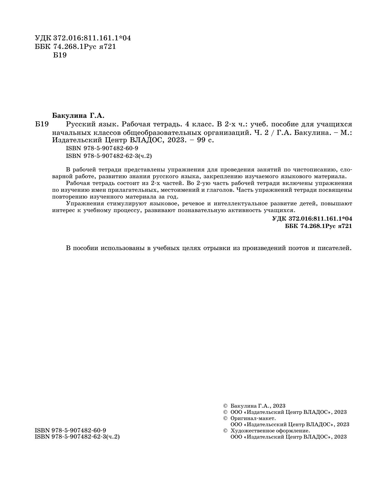 В рабочей тетради представлены упражнения для проведения занятий по чистописанию, словарной работе, развитию знания русского языка, закреплению изучаемого языкового материала. Рабочая тетрадь состоит из 2-х частей. Во 2-ую часть рабочей тетради включены упражнения по изучению имен прилагательных, местоимений и глаголов. Часть упражнений тетради посвящены повторению изученного материала за год. Упражнения стимулируют языковое, речевое и интеллектуальное развитие детей, повышают интерес к учебному процессу, развивают познавательную активность учащихся.