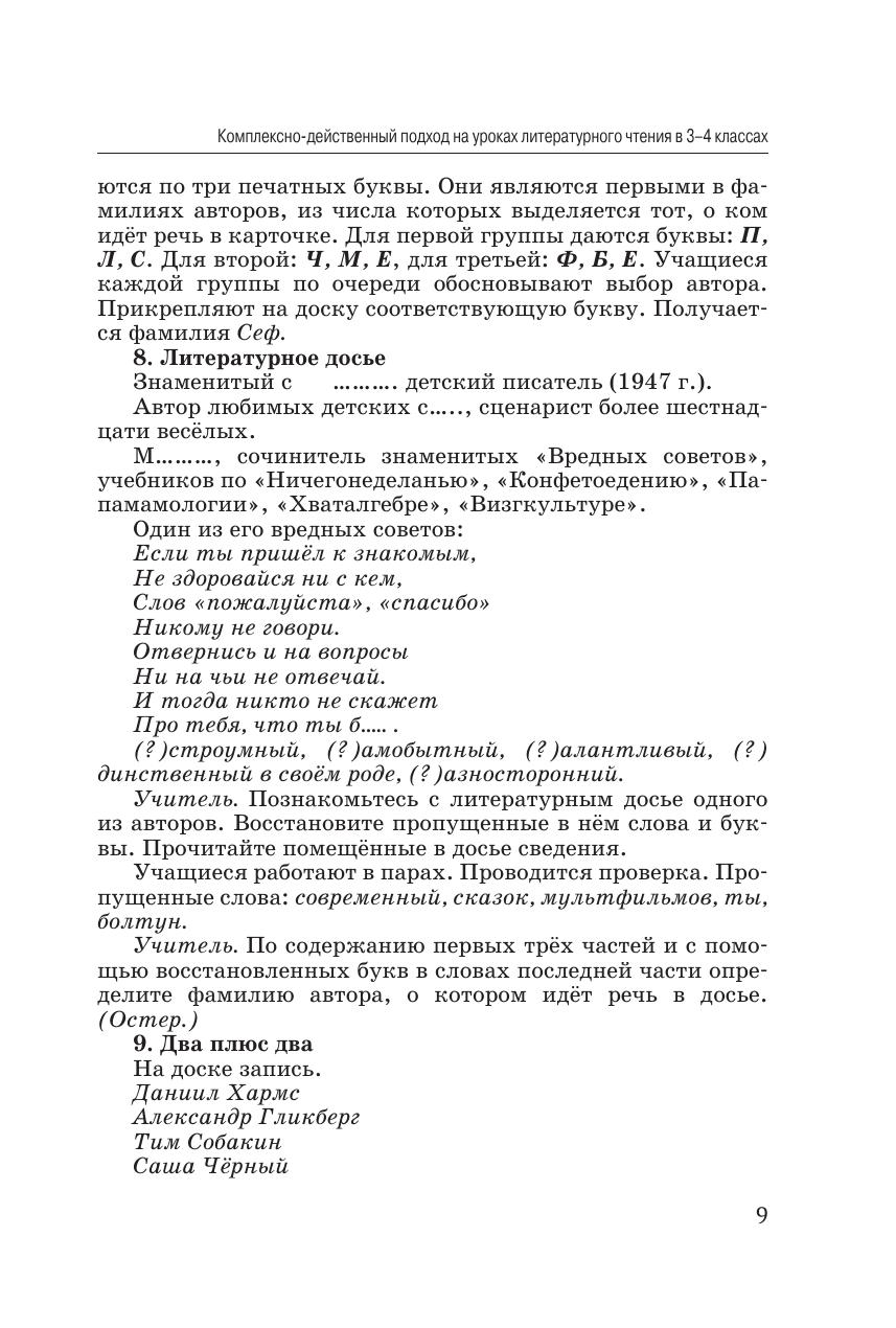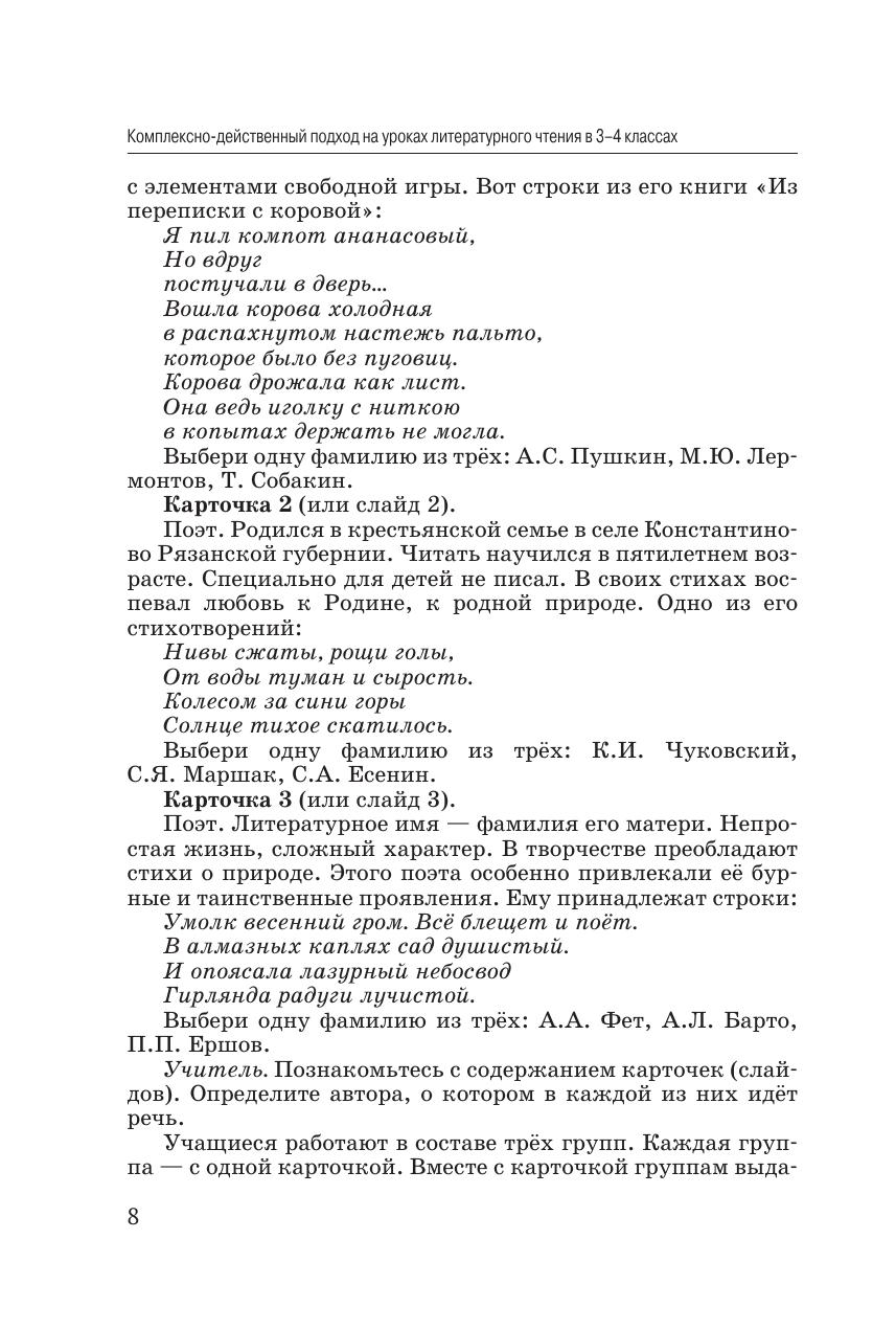 Пособие состоит из 2-х частей. В первой части пособия представлены 34 урока литературного чтения для 3–4 классов общеобразовательных организаций, проводимые на основе действенно-комплексного подхода. Уроки посвящены рассмотрению произведений И.А. Бунина, Д. Самойлова, П.П. Ершова, С.Я. Маршака, Н.А. Некрасова, А.А. Фета, М.М. Зощенко, Д. Хармса, А. Лендгрен и др. Уроки направлены на интенсивное интеллектуальное и речевое развитие школьников, увеличение их словарного запаса. Пособие предназначено для учителей начальных классов, студентов педагогических вузов, родителей.