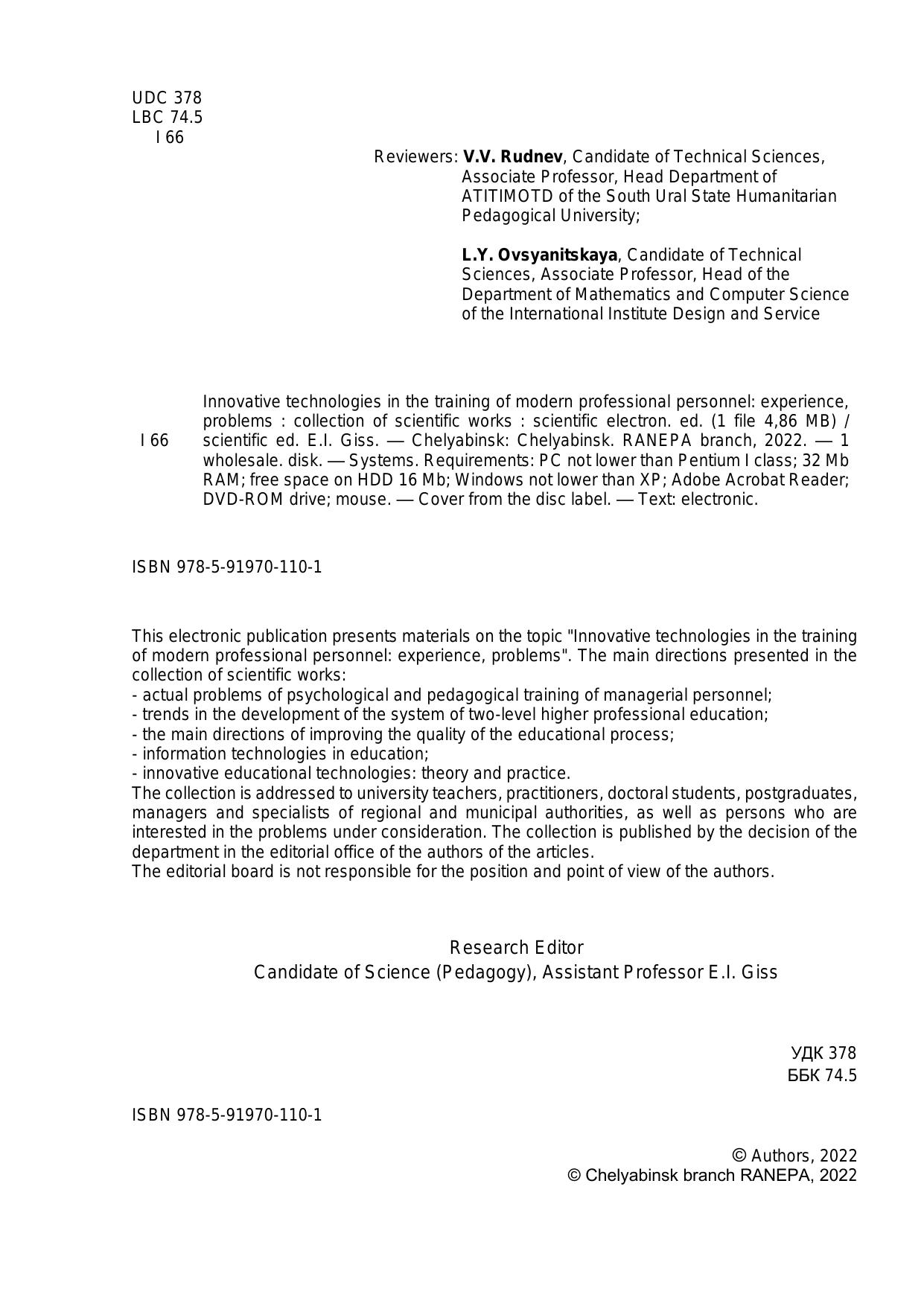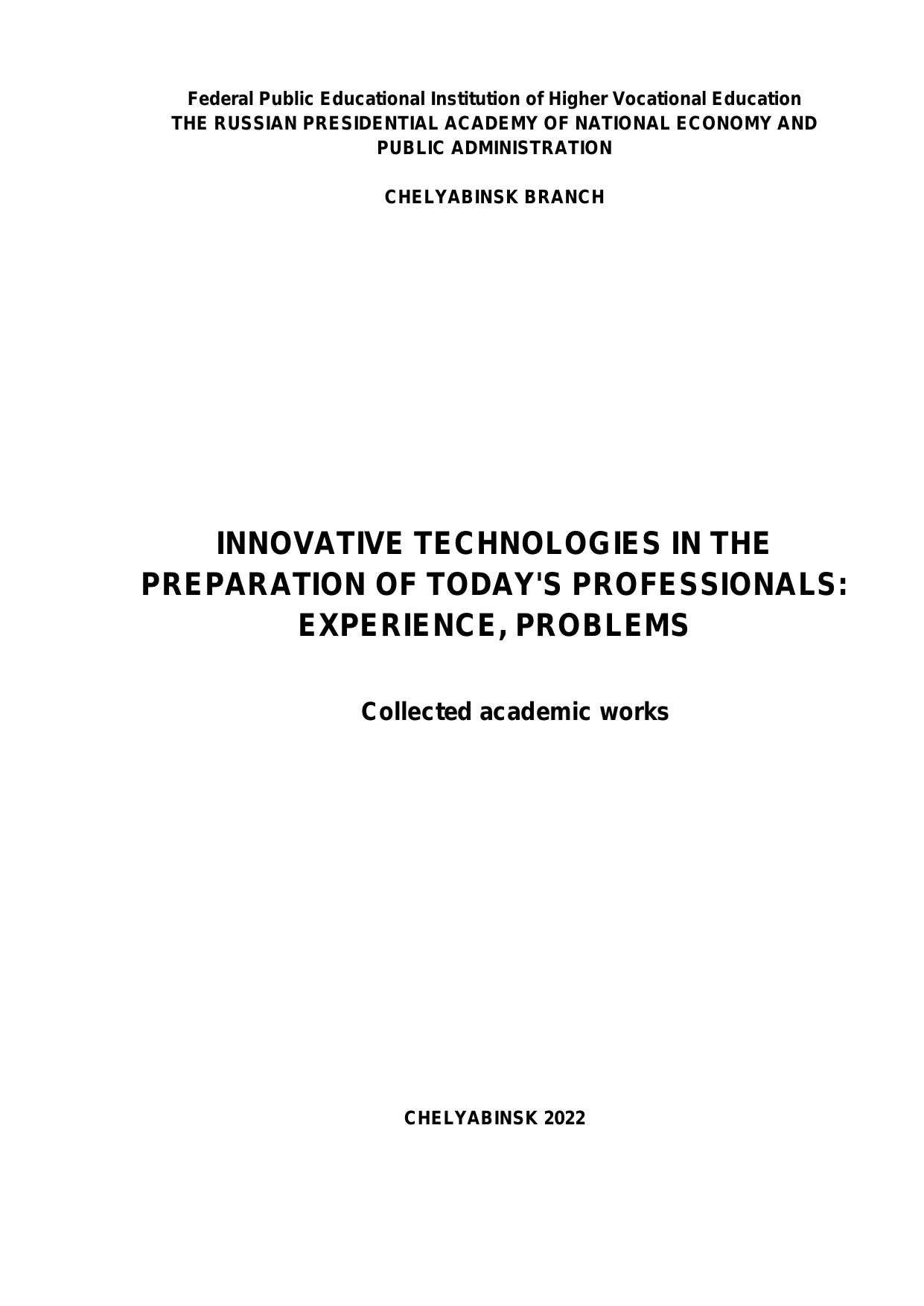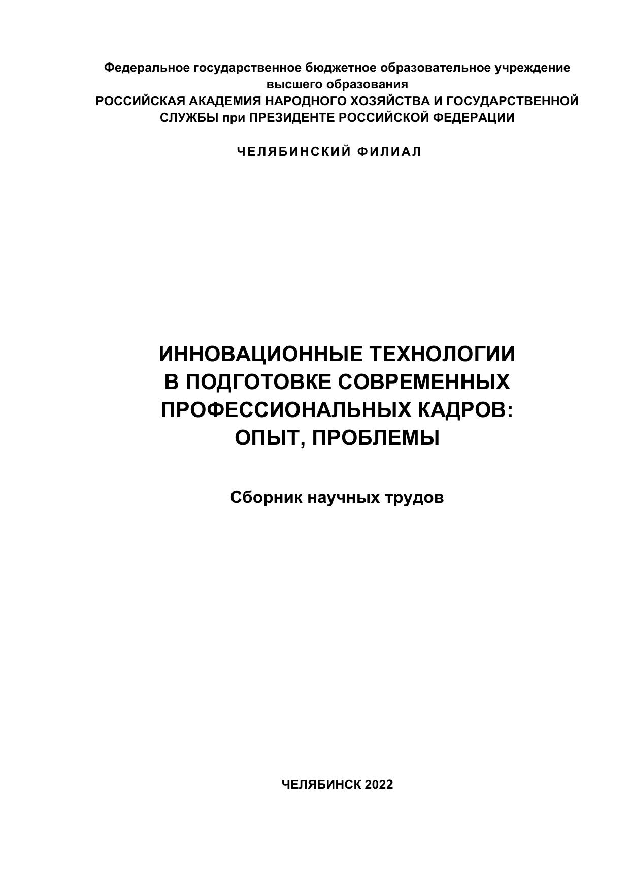 Инновационные технологии в подготовке современных профессиональных кадров: опыт, проблемы: сборник научных трудов