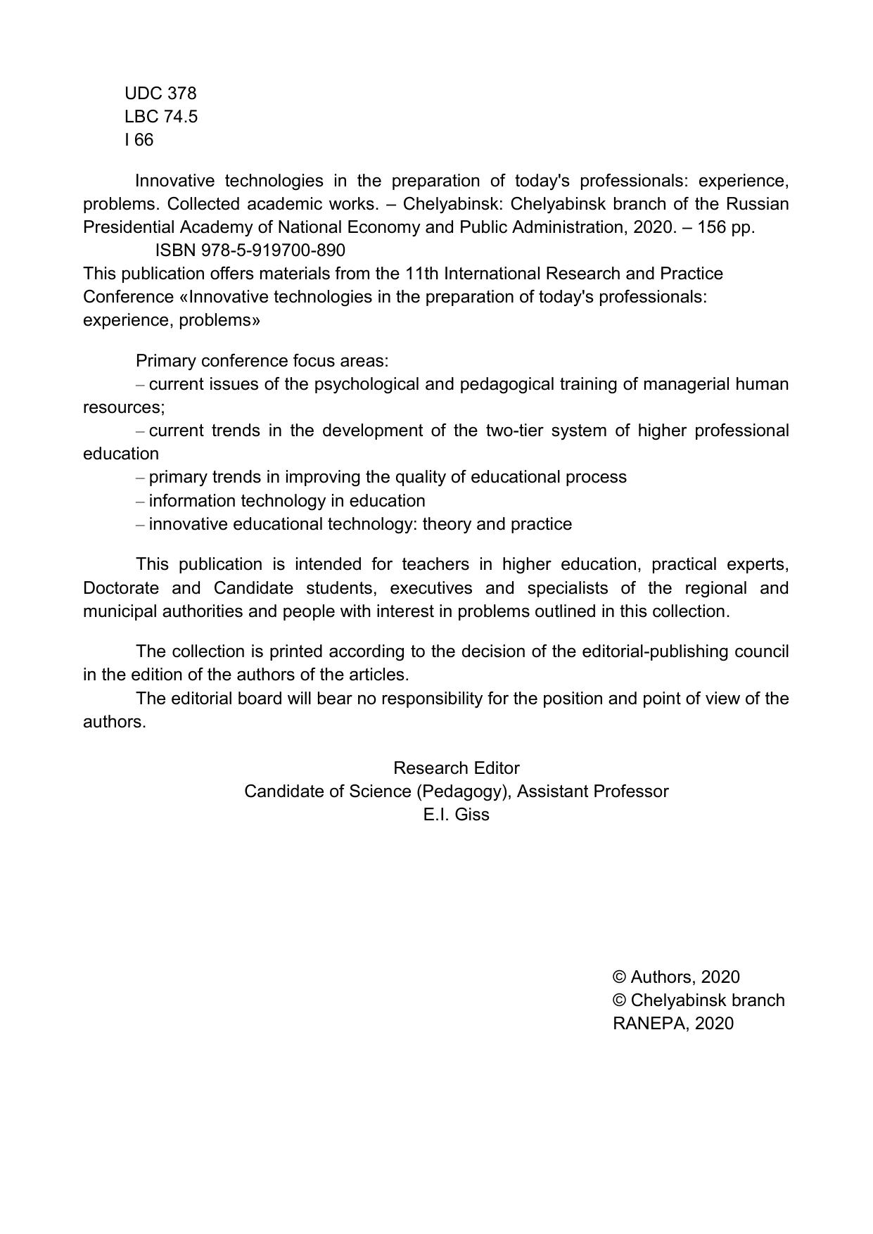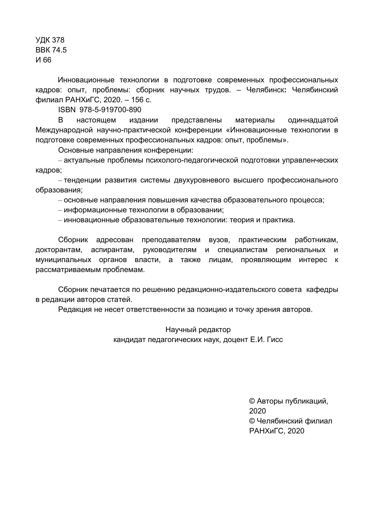 В настоящем издании представлены материалы одиннадцатой Международной научно-практической конференции «Инновационные технологии в подготовке современных профессиональных кадров: опыт, проблемы». Основные направления конференции: – актуальные проблемы психолого-педагогической подготовки управленческих кадров; – тенденции развития системы двухуровневого высшего профессионального образования; – основные направления повышения качества образовательного процесса; – информационные технологии в образовании; – инновационные образовательные технологии: теория и практика. Сборник адресован преподавателям вузов, практическим работникам, докторантам, аспирантам, руководителям и специалистам региональных и муниципальных органов власти, а также лицам, проявляющим интерес к рассматриваемым проблемам. Сборник печатается по решению редакционно-издательского совета кафедры в редакции авторов статей. Редакция не несет ответственности за позицию и точку зрения авторов.