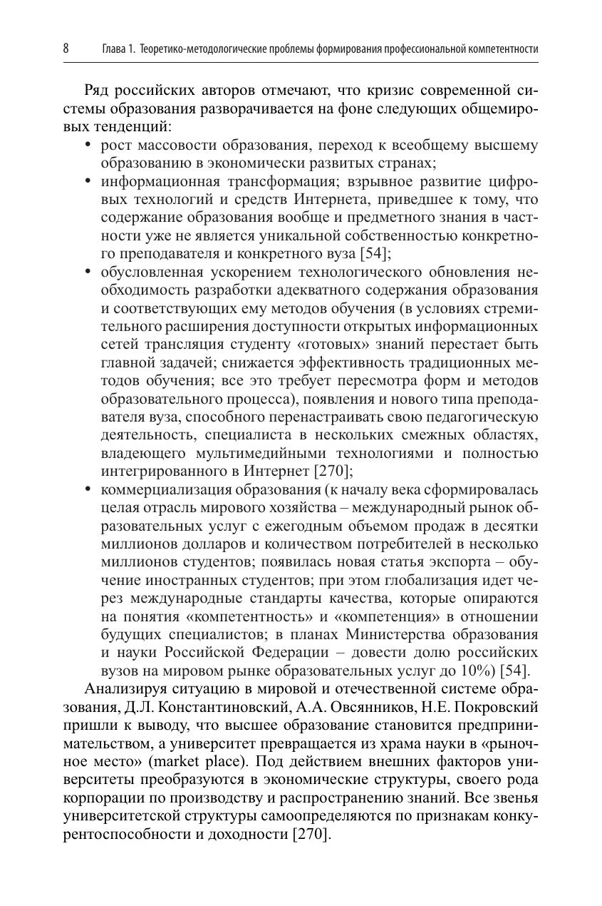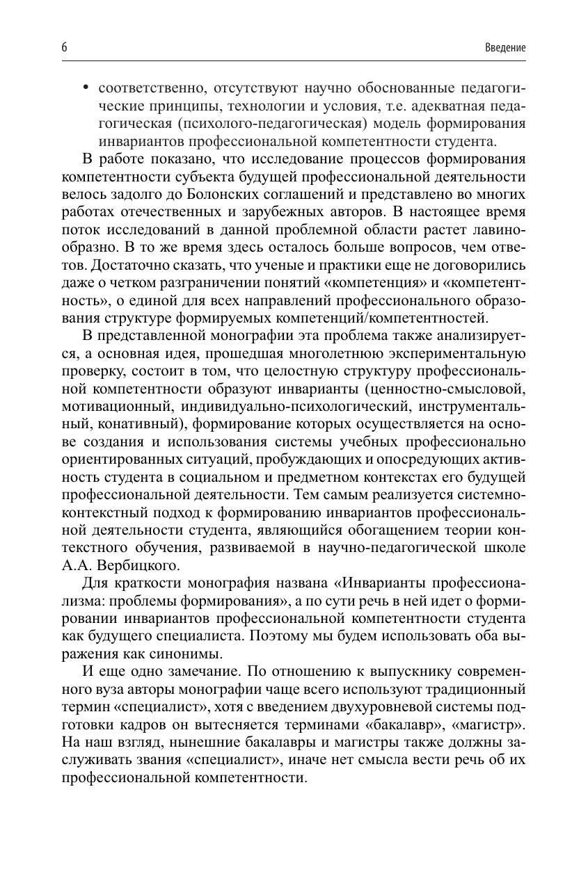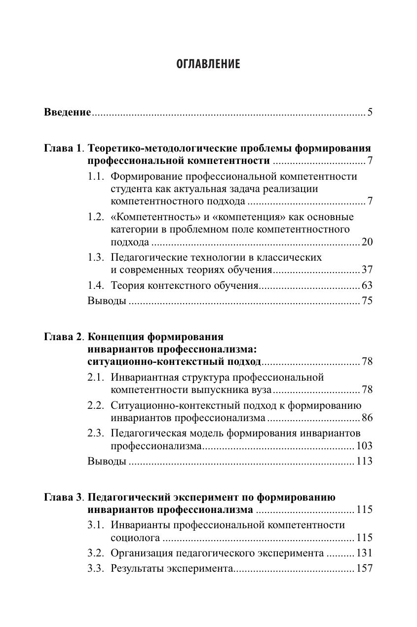 Проанализированы трудности и противоречия на пути реализации компетентностного подхода в системе профессионального образования. Сформулирована и решена проблема формирования инвариантов профессиональной компетентности студента на основе ситуационно-контекстного подхода. Показано, что идея инварианта профессионализма позволяет оптимизировать усилия вузов по разработке основных образовательных программ компетентностного формата. Для руководителей, профессоров, доцентов, преподавателей, научных работников вузов – всех, кто включен в решение проблем модернизации профессионального образования. Может использоваться в системе повышения квалификации преподавателей с целью подготовки к работе в новых условиях.