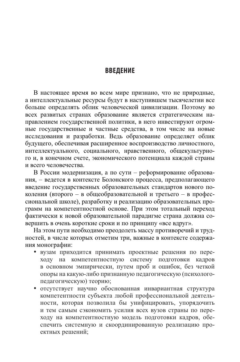 Проанализированы трудности и противоречия на пути реализации компетентностного подхода в системе профессионального образования. Сформулирована и решена проблема формирования инвариантов профессиональной компетентности студента на основе ситуационноконтекстного подхода. Показано, что идея инварианта профессионализма позволяет оптимизировать усилия вузов по разработке основных образовательных программ компетентностного формата. Для руководителей, профессоров, доцентов, преподавателей, научных работников вузов – всех, кто включен в решение проблем модернизации профессионального образования. Может использоваться в системе повышения квалификации преподавателей с целью подготовки к работе в новых условиях.